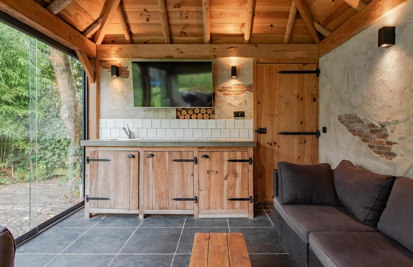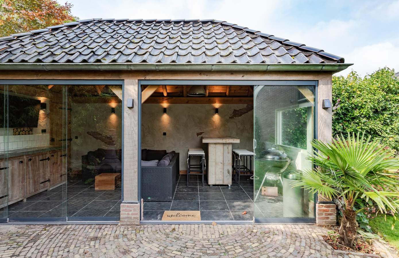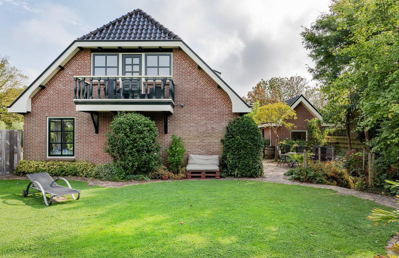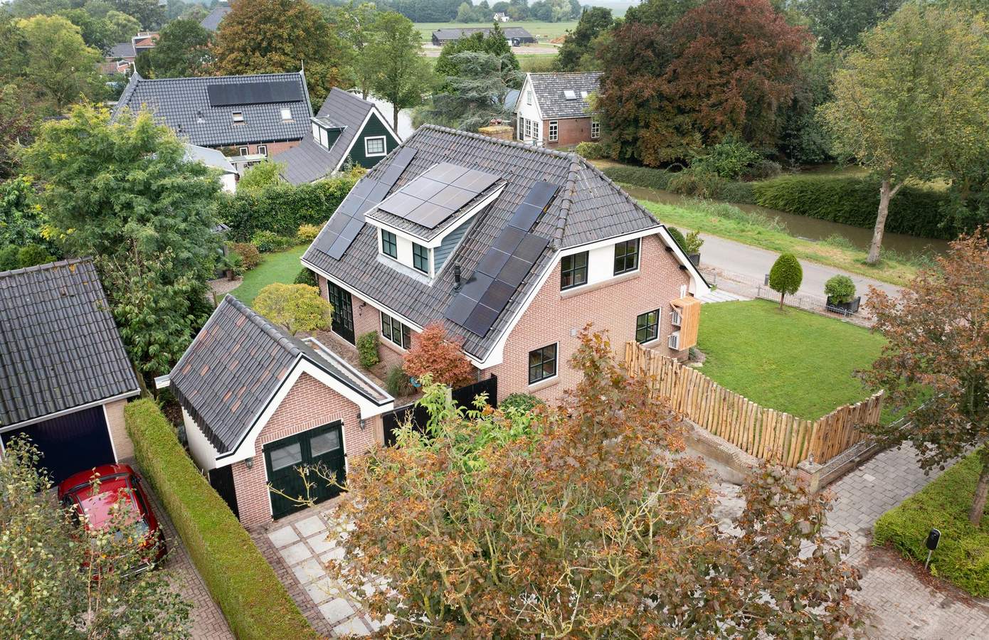 Doordat de woning op een terp is gebouwd, ligt deze hoger dan de weg en wordt zowel aan de voor- als achterkant omgeven door een prachtig aangelegde tuin, vol groene struiken, bomen, beplanting en zelfs een vijver. Aan de achterzijde van het huis bevindt zich een fijn terras op het zuiden, waar u heerlijk kunt genieten van de zon. Aan de zijkant van de woning ligt een groen gazon, een ideale speelplek voor kinderen om rond te rennen en te spelen. Als kers op de taart vindt u achterin de tuin een luxe overkapping met berging. De overkapping is voorzien van glazen schuifwanden en heaters, zodat u ook in de winter buiten kunt zitten. Binnen is een buitenkeuken gerealiseerd, compleet met een ingebouwde koelkast. Daarnaast is er vanaf de oprit toegang tot een bijgebouw met dubbele deuren en een vliering, ideaal voor het stallen van uw fietsen. De oprit biedt verder ruimte voor één auto en er is een gastenparkeerplaats voor de kelderuitgang, waar tevens een laadpaal voor elektrische auto’s aanwezig is.