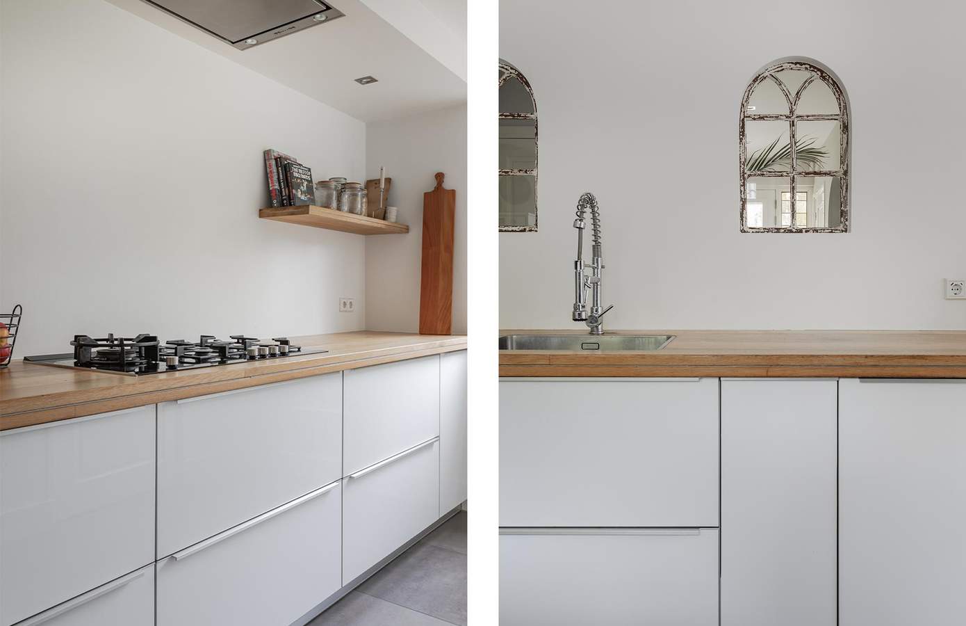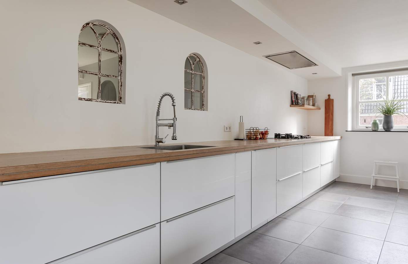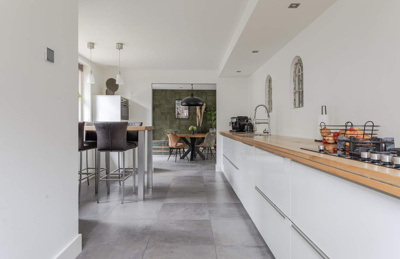 Eén van de eyecatchers van deze woning is de ruime, langgerekte woonkeuken, die doorloopt aan de achterzijde van het huis. De keuken is uitgerust met modern inbouwapparatuur en heeft veel daglicht door de ramen aan beide zijdes. Vanuit de keuken heeft u bovendien toegang tot de achterentree, die leidt naar de tuin en de oprit. De masterbedroom beschikt over een balkon met uitzicht op de tuin, is voorzien van airconditioning en een gezellige sfeerhaard. Vanuit één van de slaapkamer is er ook toegang tot de vliering. De royale badkamer is uitgerust met een ruime inloopdouche, vloerverwarming en twee stijlvolle wastafels en een ligbad.