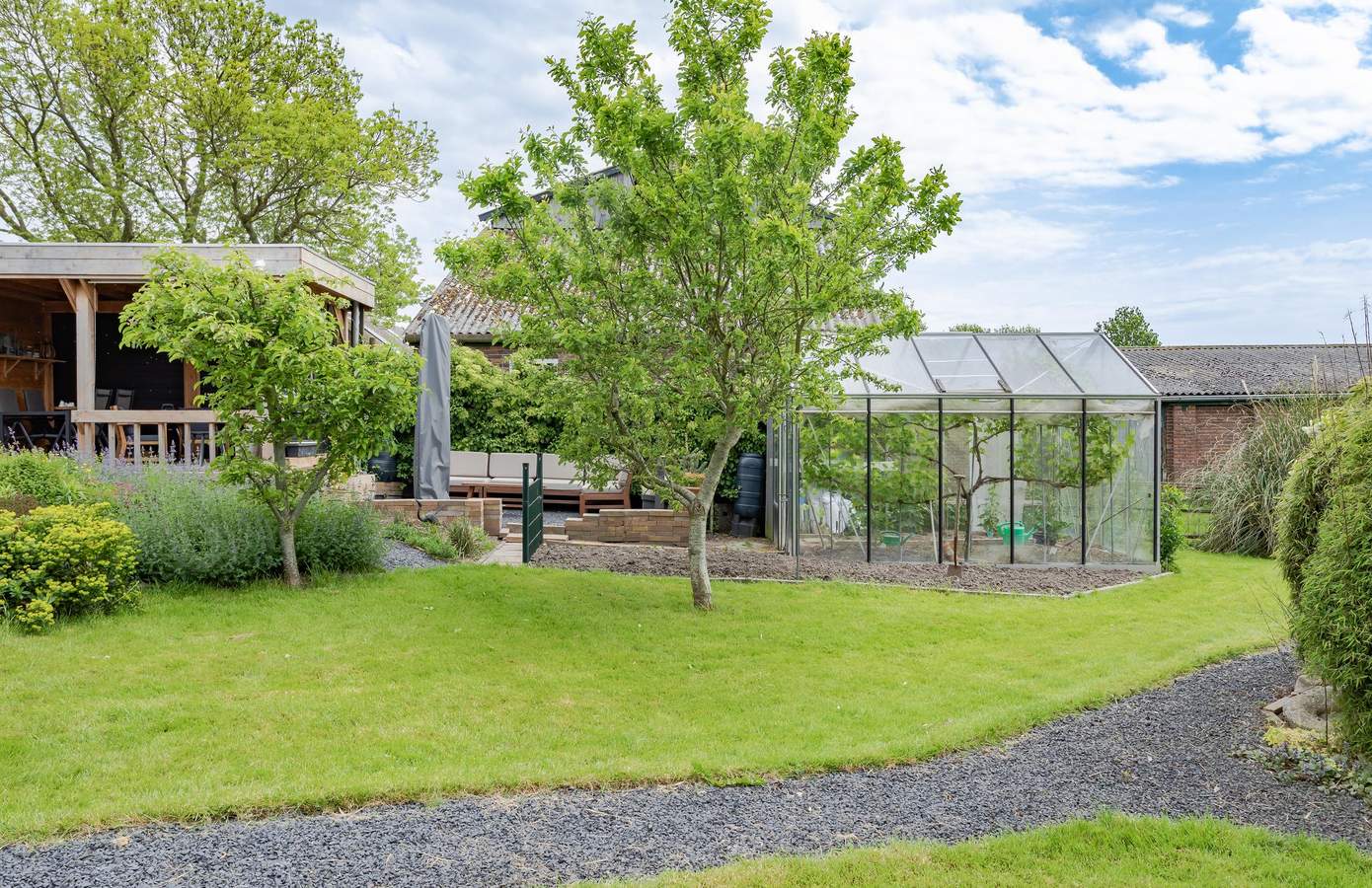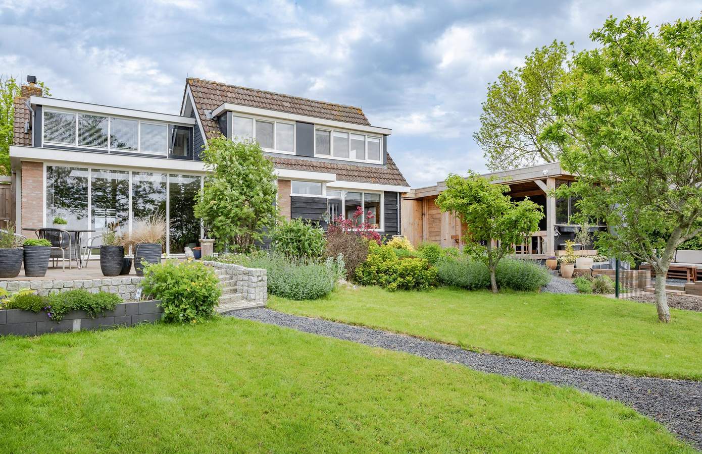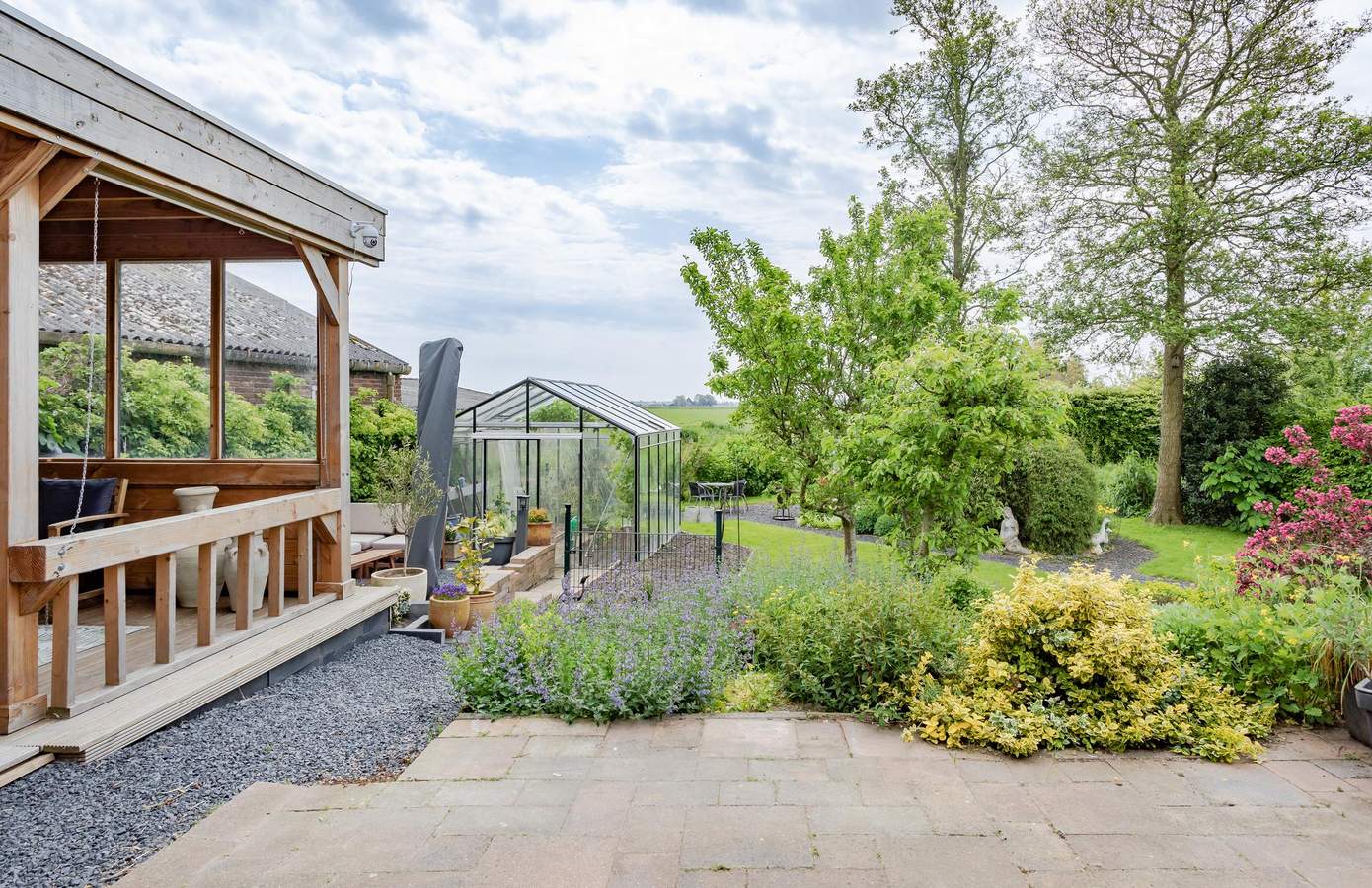 De tuin heeft een paar leuke verrassingen. Zo vindt u hier onderandere een kas en een grote veranda met bergruimte. Aangrenzend aan de woning is een inpandig te bereiken garage en u heeft genoeg ruimte op de parkeerplaats naast het huis om uw auto(’s) te parkeren. De tuin is volledig besloten en ligt aan het water. Het is mooi aangelegd met vele vaste planten. In 2021 is de veranda met aangrenzende berging gebouwd.