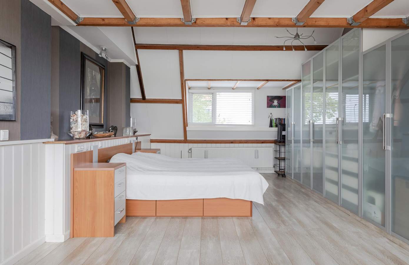 Op de eerste verdieping is een grote masterbedroom opengewerkt tot de nok, wat een mooie effect geeft met veel licht. Op de ruime overloop is een doorloopkast die grenst aan de tweede slaapkamer. De ruime derde slaapkamer heeft ook weer dat mooie uitzicht en is erg ruim en licht. De badkamer is v.v. een wastafel, spiegel met sensorverlichting en een grote douchecabine.