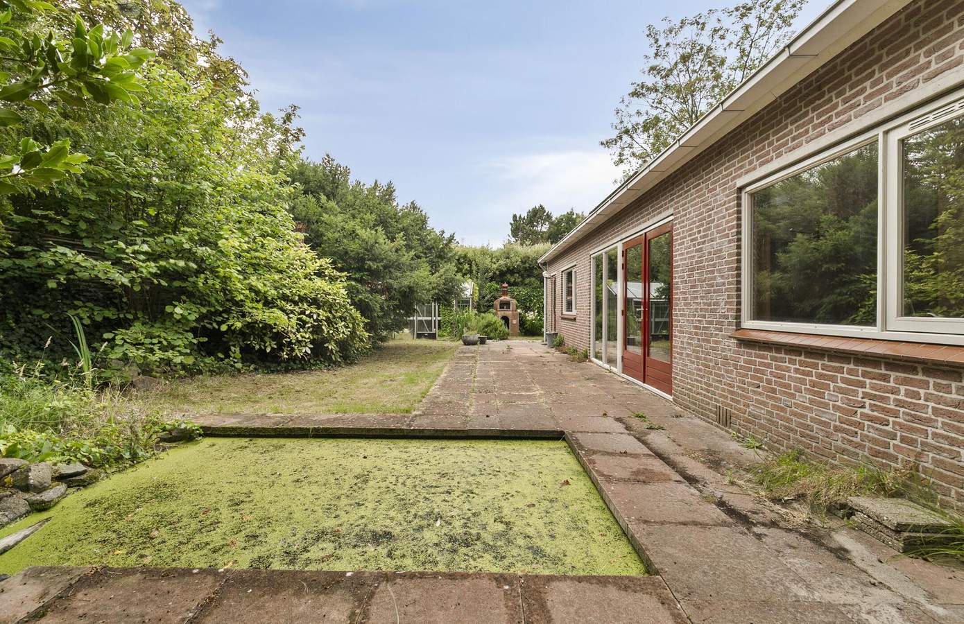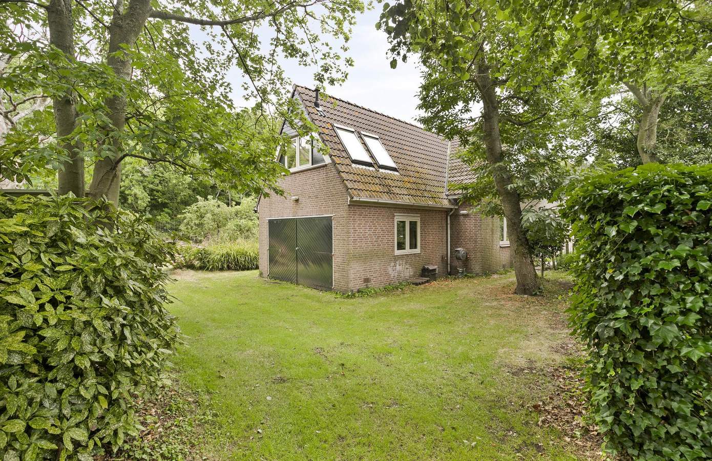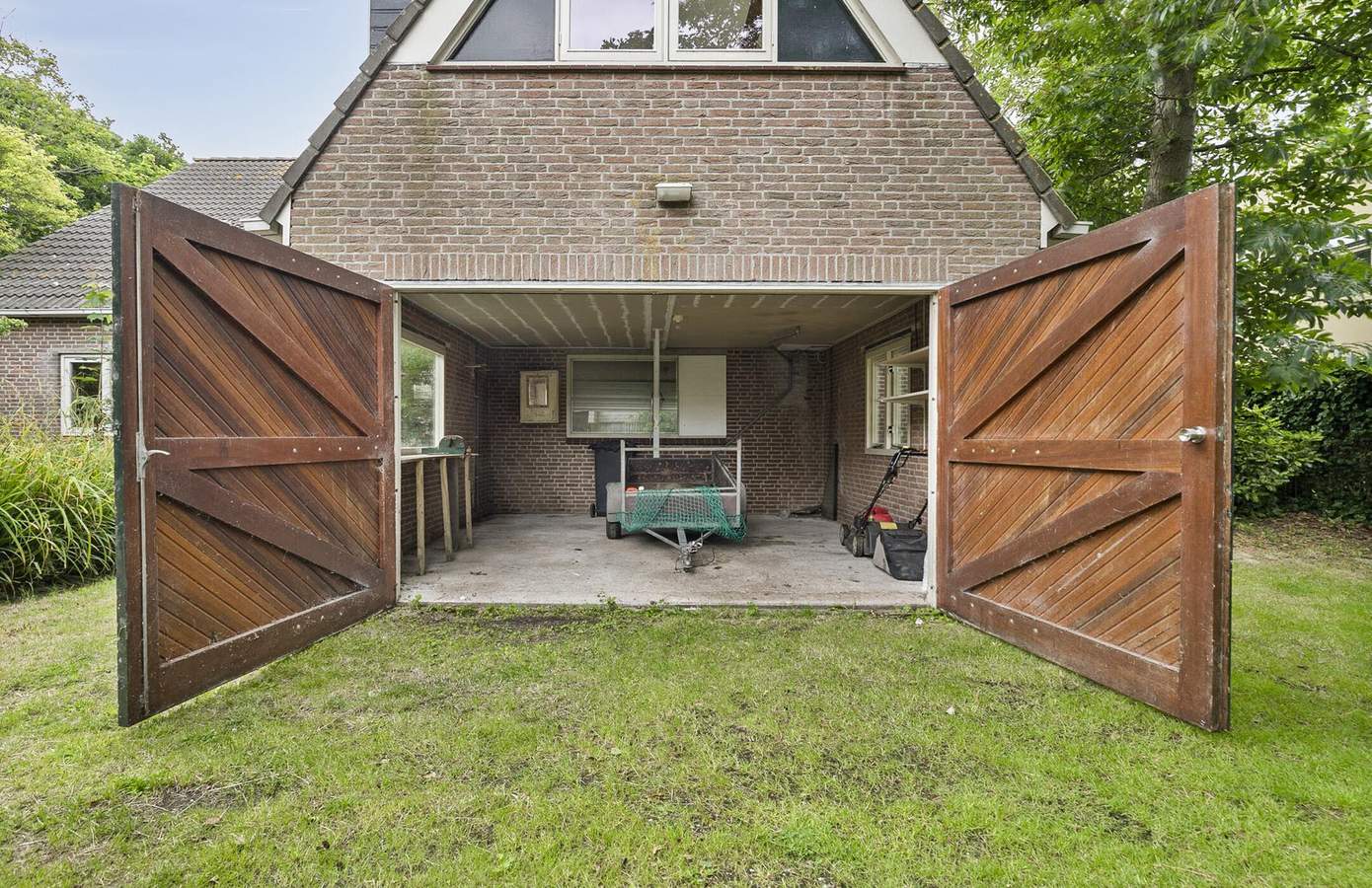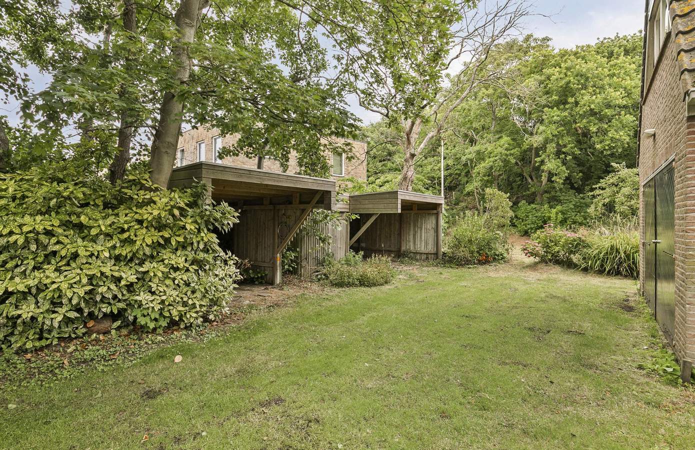 De woning staat vrij op een bosrijk perceel; volwassen eiken, kastanjes en struiken zorgen voor privacy en natuurlijke schaduw. Aan de zuidzijde is een beschut terras bij de keuken, terwijl het dakterras boven een heerlijke plek is voor een kop koffie in de ochtendzon. Achter in de tuin staat een kas en aan het einde van de oprit is een dubbele carport. De oprit biedt plaats aan meerdere auto’s; in de garage kunt u fietsen, surfplanken of een aanhanger droog stallen.
