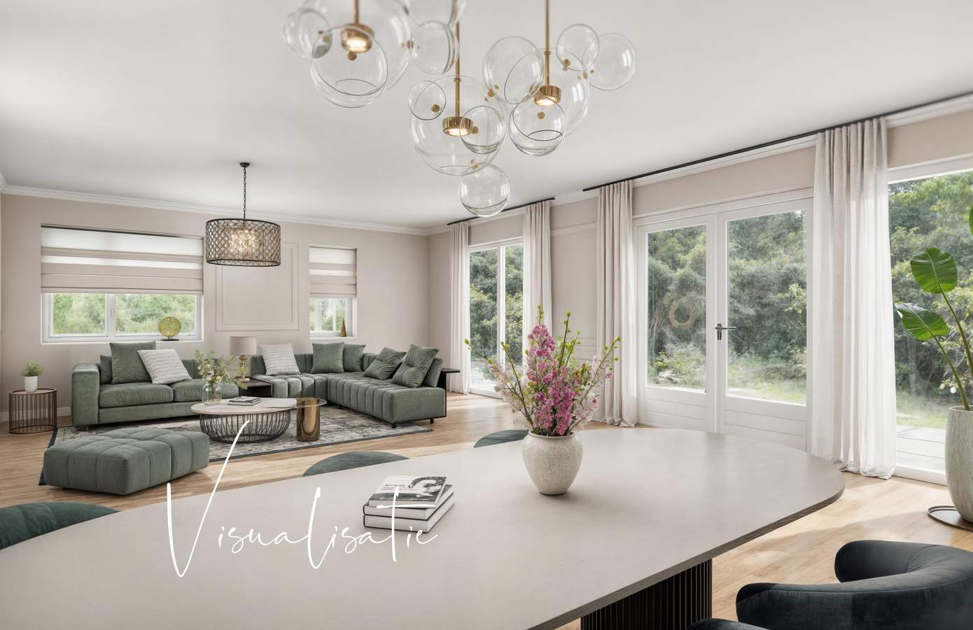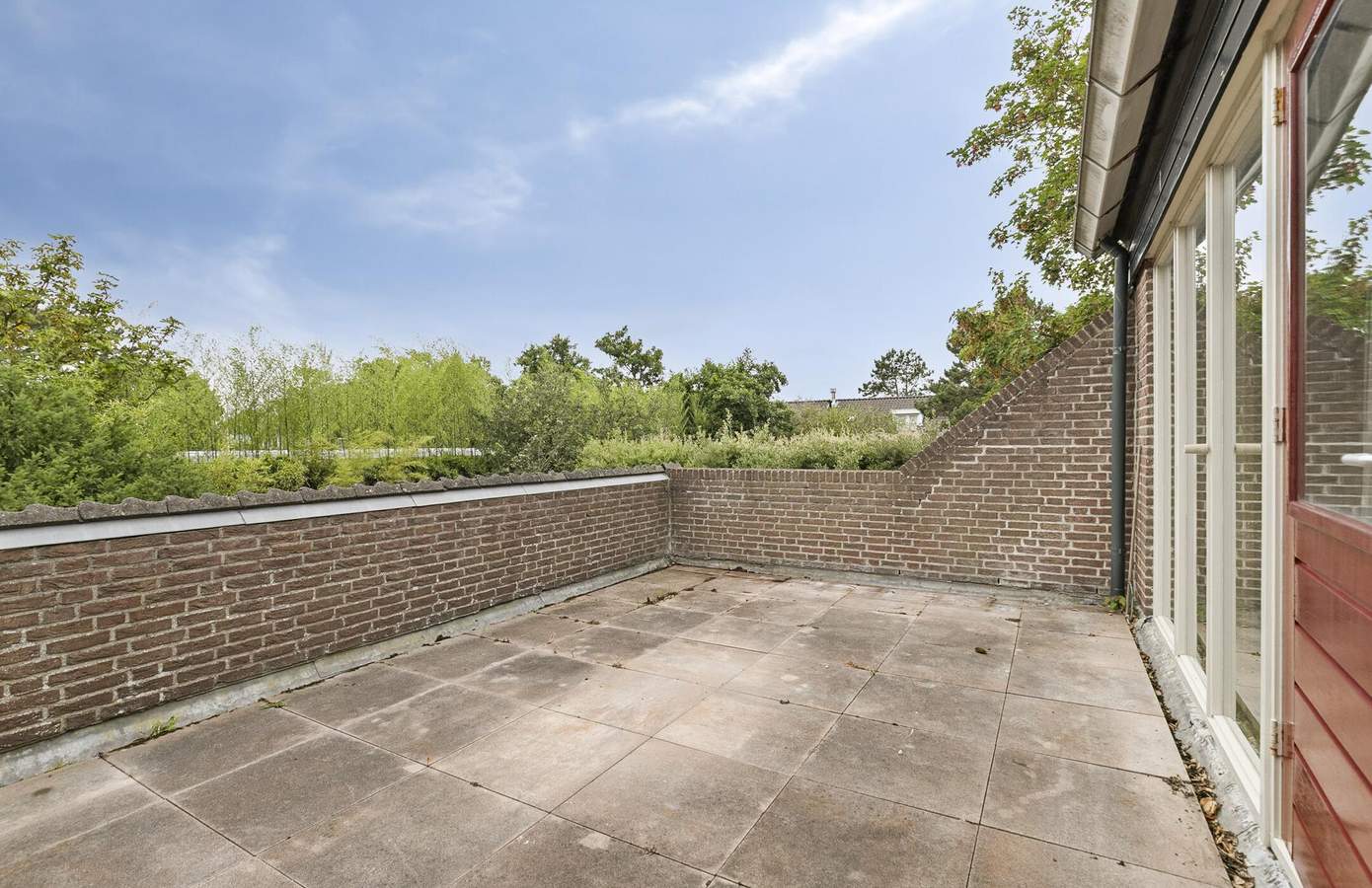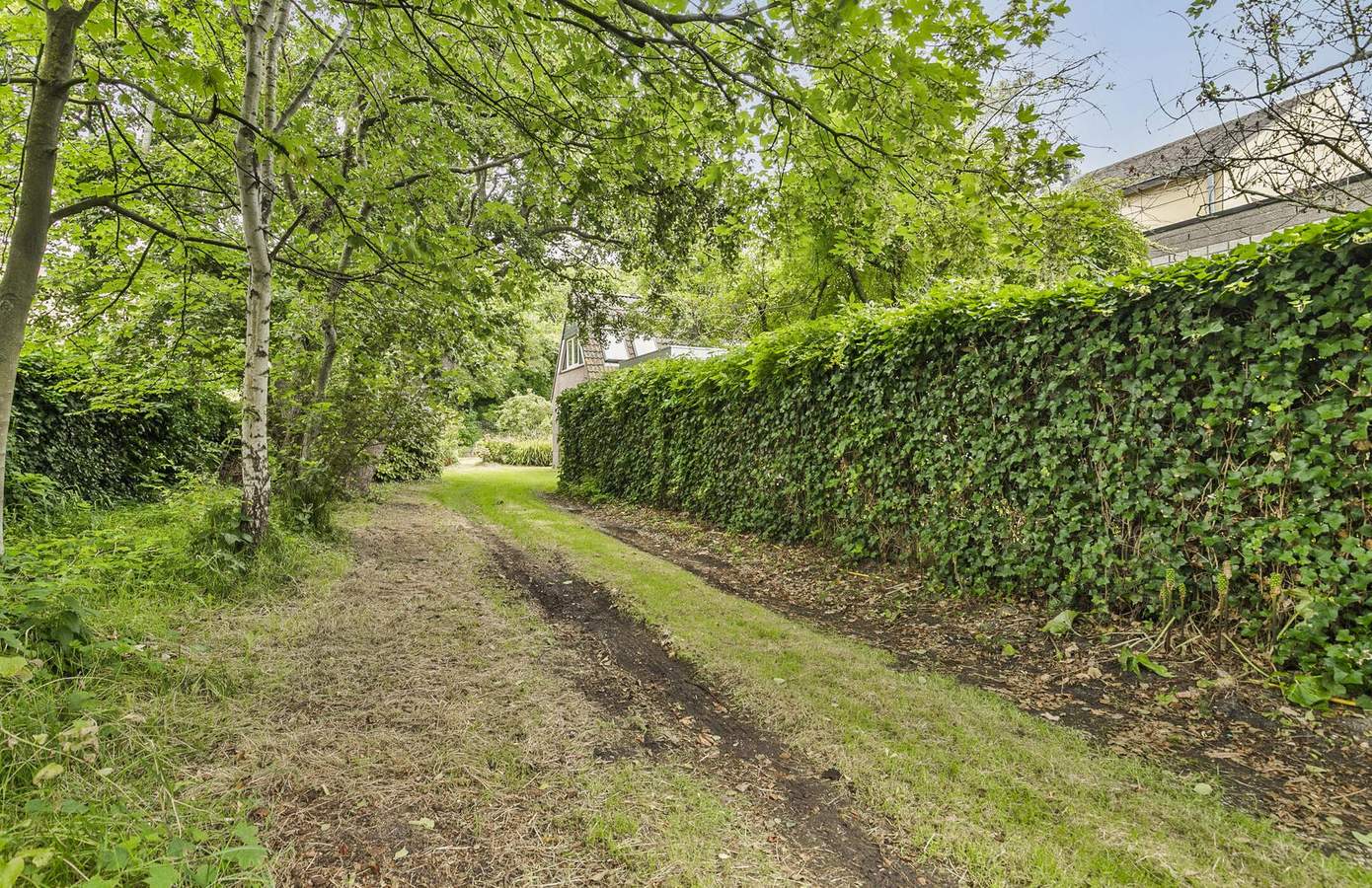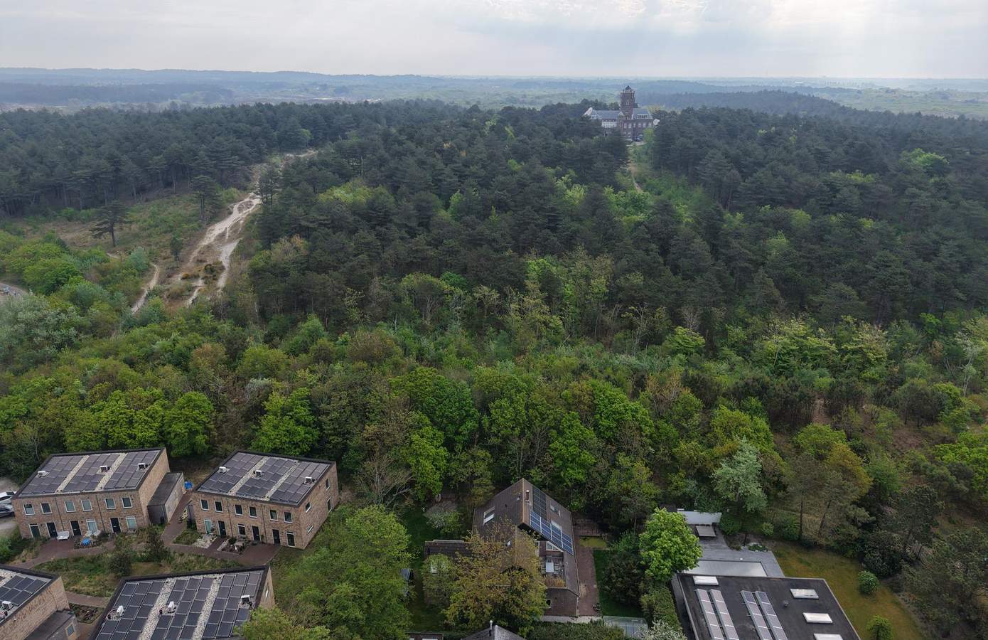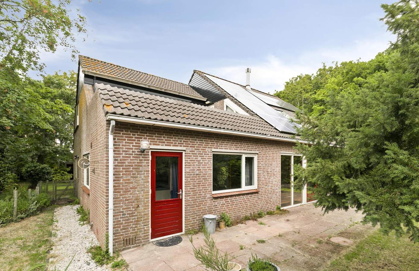 De woning staat vrij op een bosrijk perceel; volwassen eiken, kastanjes en struiken zorgen voor privacy en natuurlijke schaduw. Aan de zuidzijde is een beschut terras bij de keuken, terwijl het dakterras boven een heerlijke plek is voor een kop koffie in de ochtendzon. Achter in de tuin staat een kas en aan het einde van de oprit is een dubbele carport. De oprit biedt plaats aan meerdere auto’s; in de garage kunt u fietsen, surfplanken of een aanhanger droog stallen.