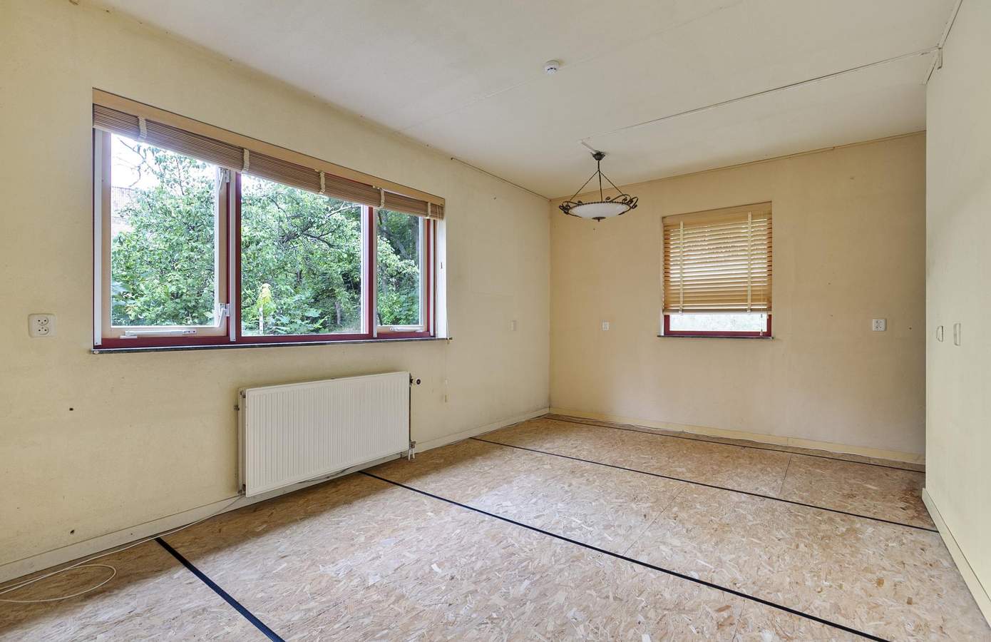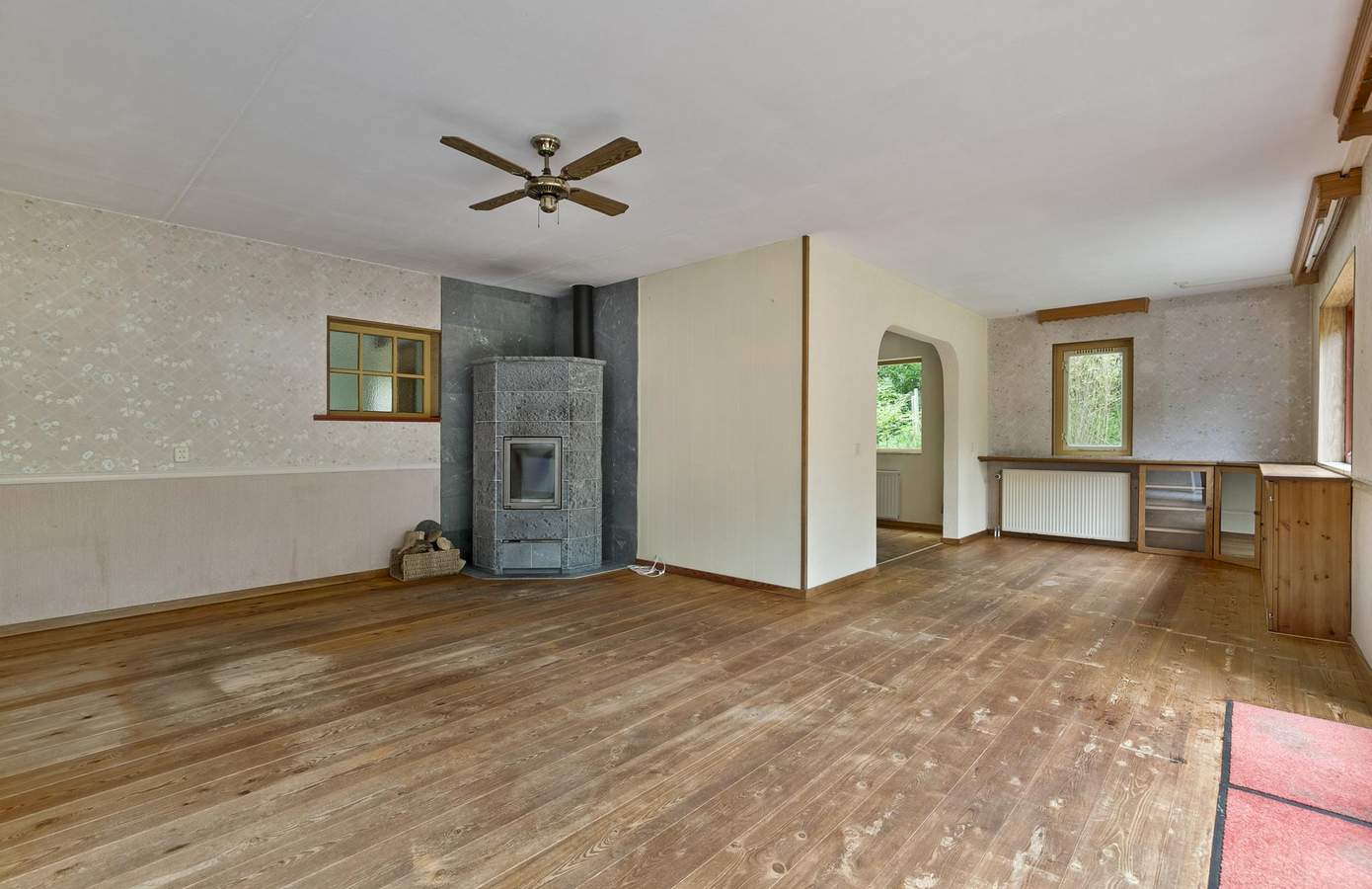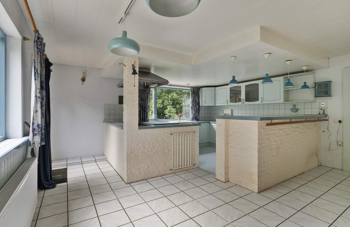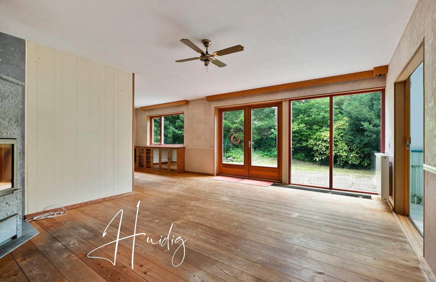 Via de zij-entree komt u in een centrale hal met trapopgang en garderobe. Linksaf ligt een riante woonkamer van ca. 50 m² met houtkachel en grote raampartijen richting tuin. Aansluitend bevindt zich de eerste woonkeuken: een ruime U-opstelling met openslaande tuindeuren – perfect om straks een moderne leefkeuken te realiseren. Verder is er op de begane grond een slaapkamer op tuinniveau (ideaal als master bedroom of kantoor), een badkamer, een Finse sauna voor koude winterdagen en binnendoor toegang tot een stenen garage met dubbele houten deuren.