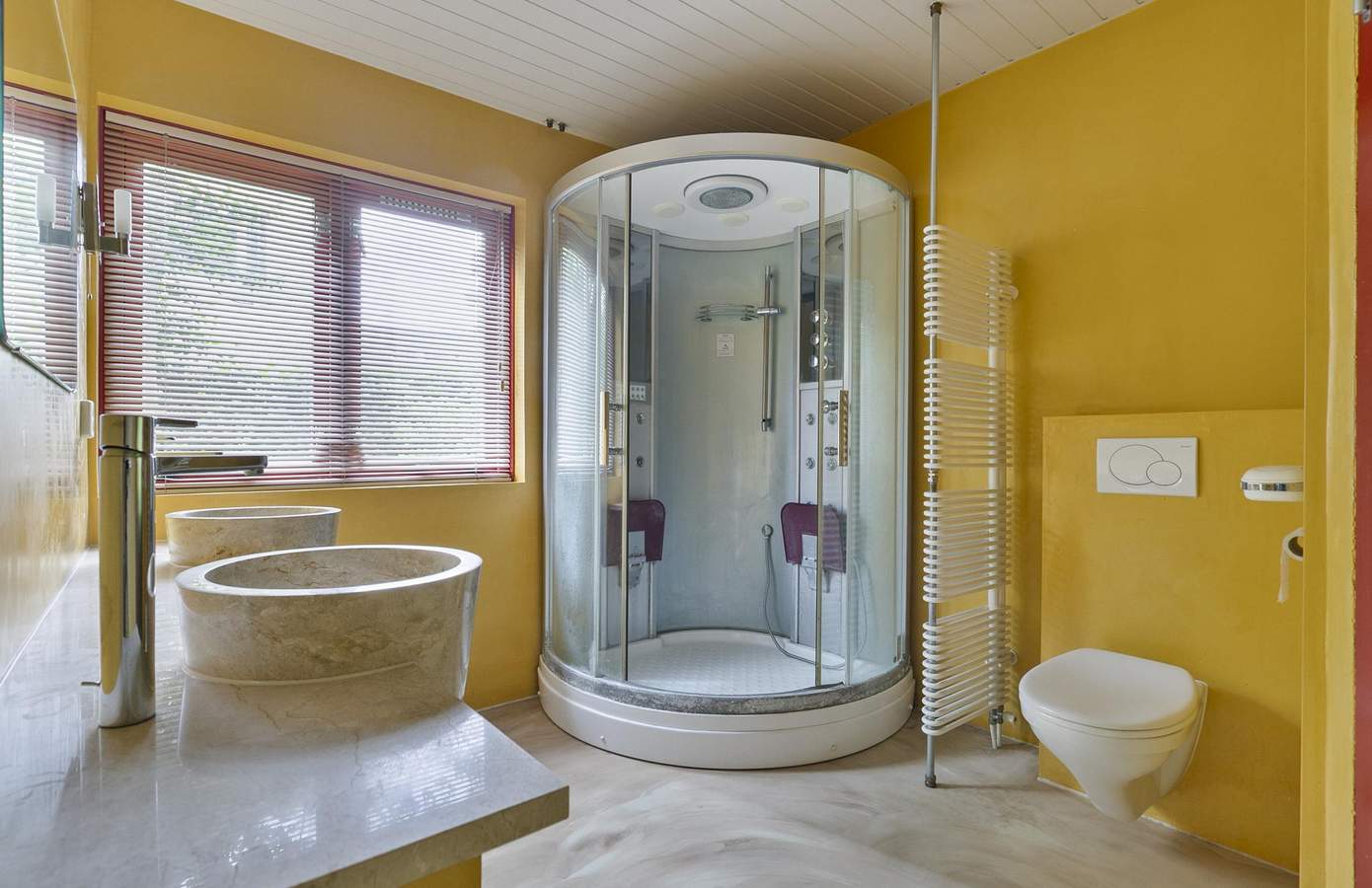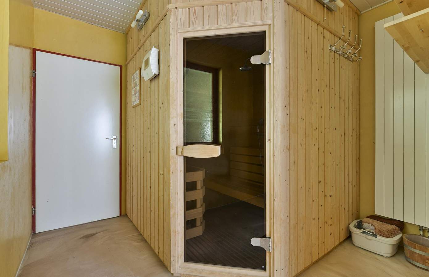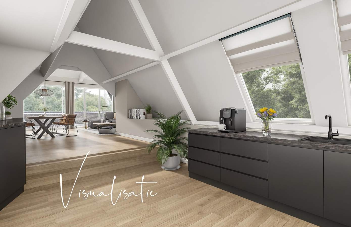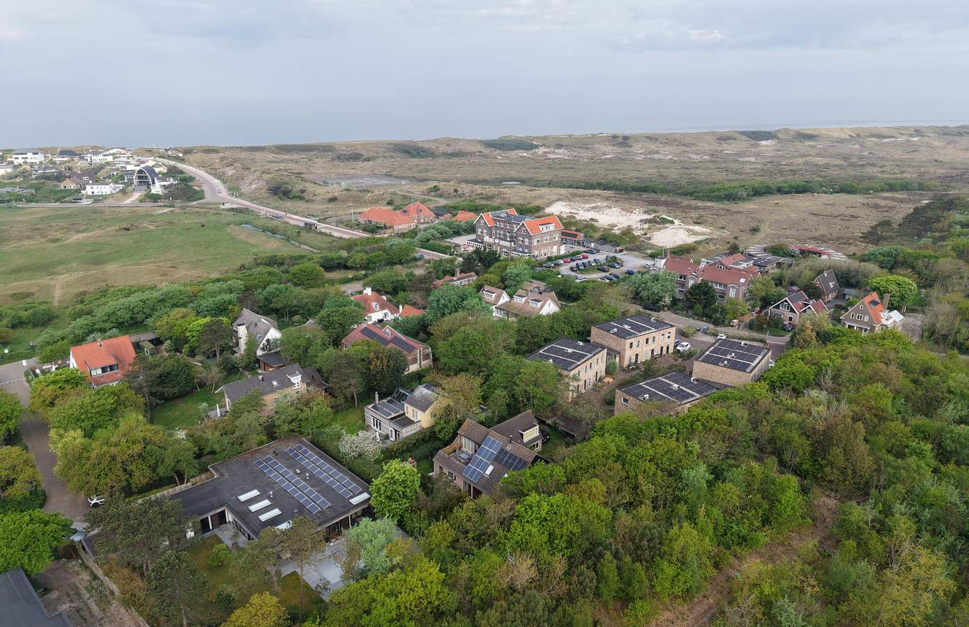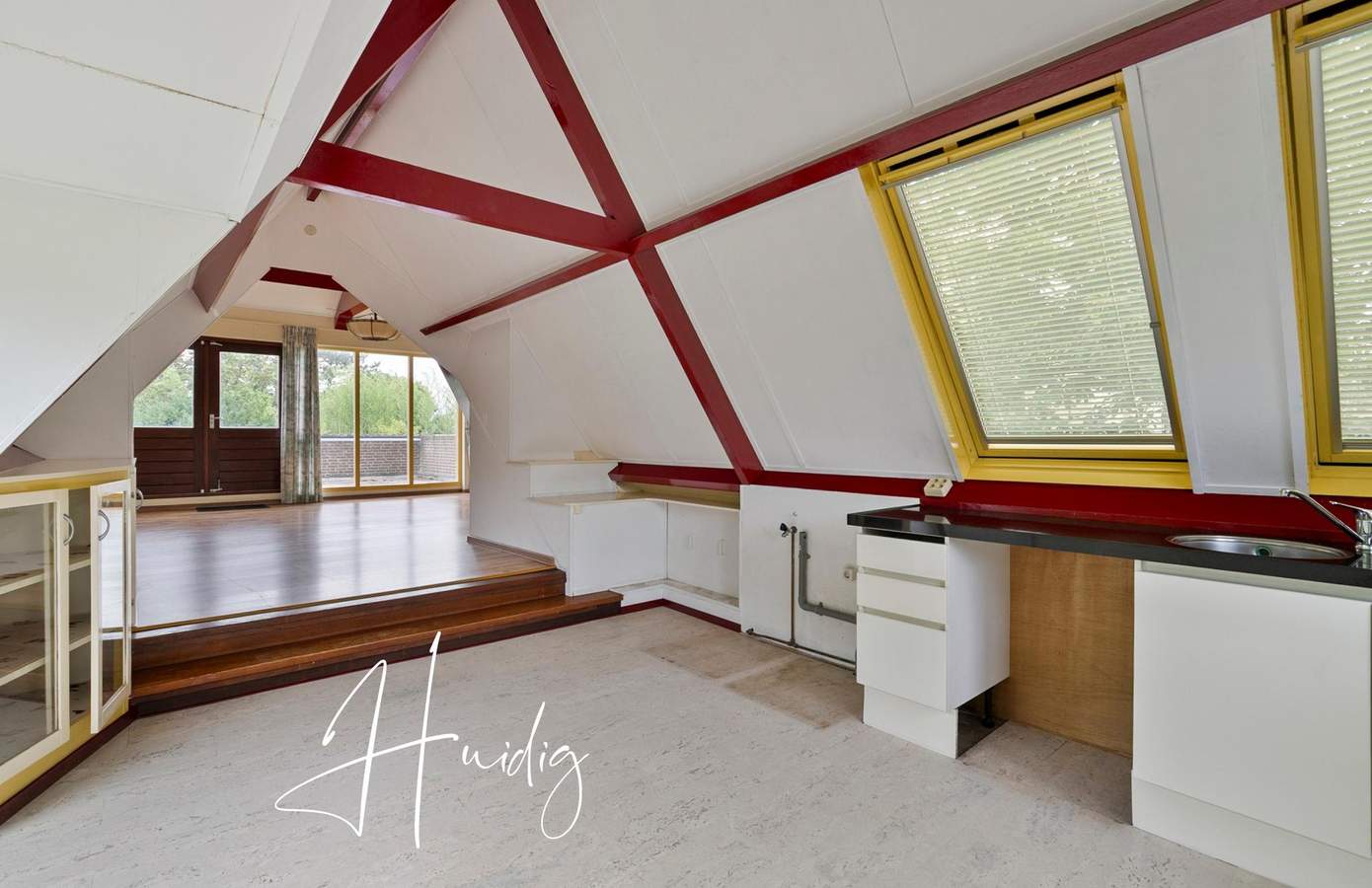 Boven is de vroegere tweede woning nog duidelijk herkenbaar: een ruime (woon-)kamer met open keuken onder de karakteristieke kapconstructie, twee slaapkamers aan de voorzijde en een derde (ruime) slaapkamer aan de achterzijde. De badkamer hier is al moderner, met dubbele wastafel en inloopdouche. Via schuifpuien stapt u zo op het grote dakterras van circa 20 m², waar u de zee door de bomen heen hoort ruisen. Onder de schuine dakvlakken zitten lange kastenwanden en er is nog een vlieringzolder aanwezig, genoeg ruimte voor opslag.