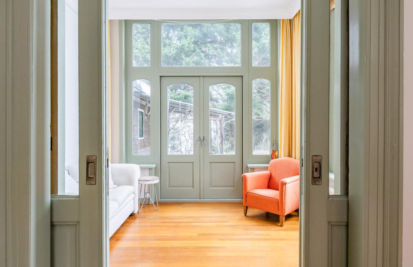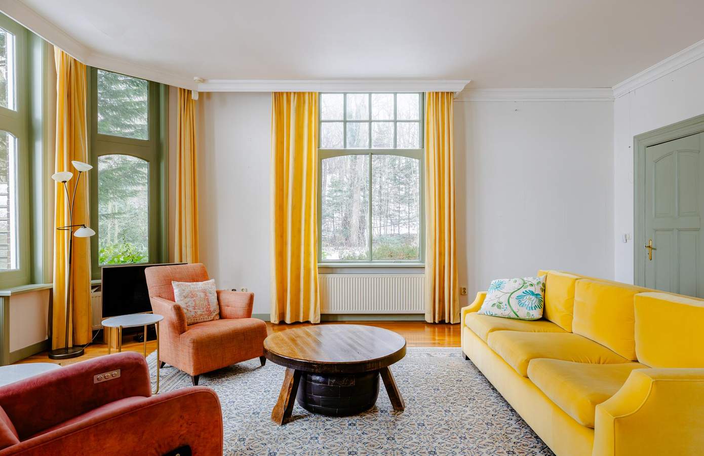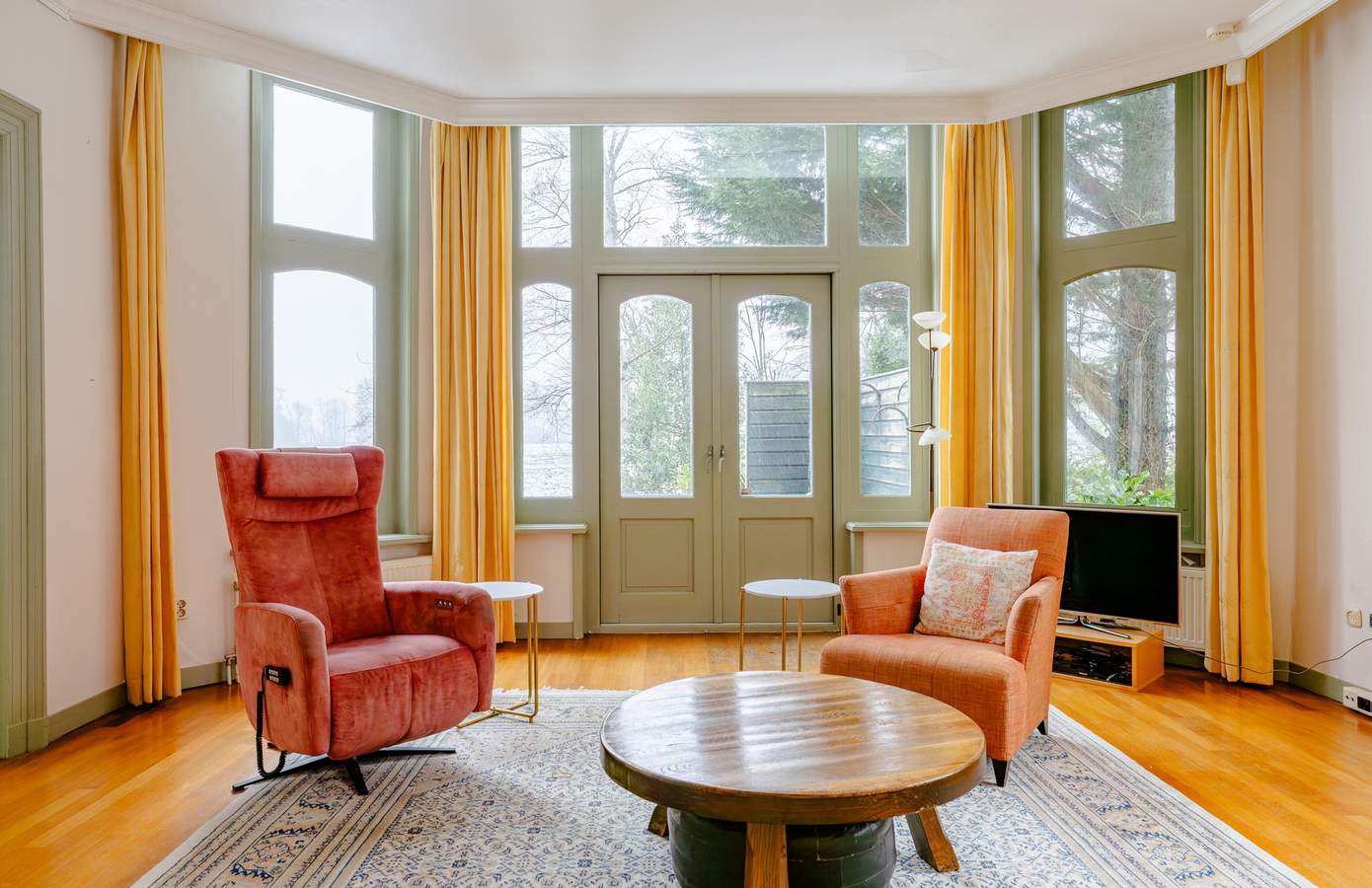 De indeling is prettig en doordacht, met leefruimtes die van elkaar worden gescheiden door landelijke ensuite deuren. De vele hoge ramen zorgen voor een overvloed aan natuurlijk licht en bieden bovendien een fraai uitzicht op het omliggende groen en het open landschap.