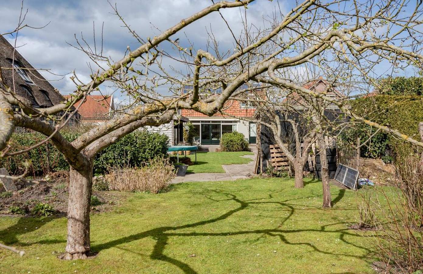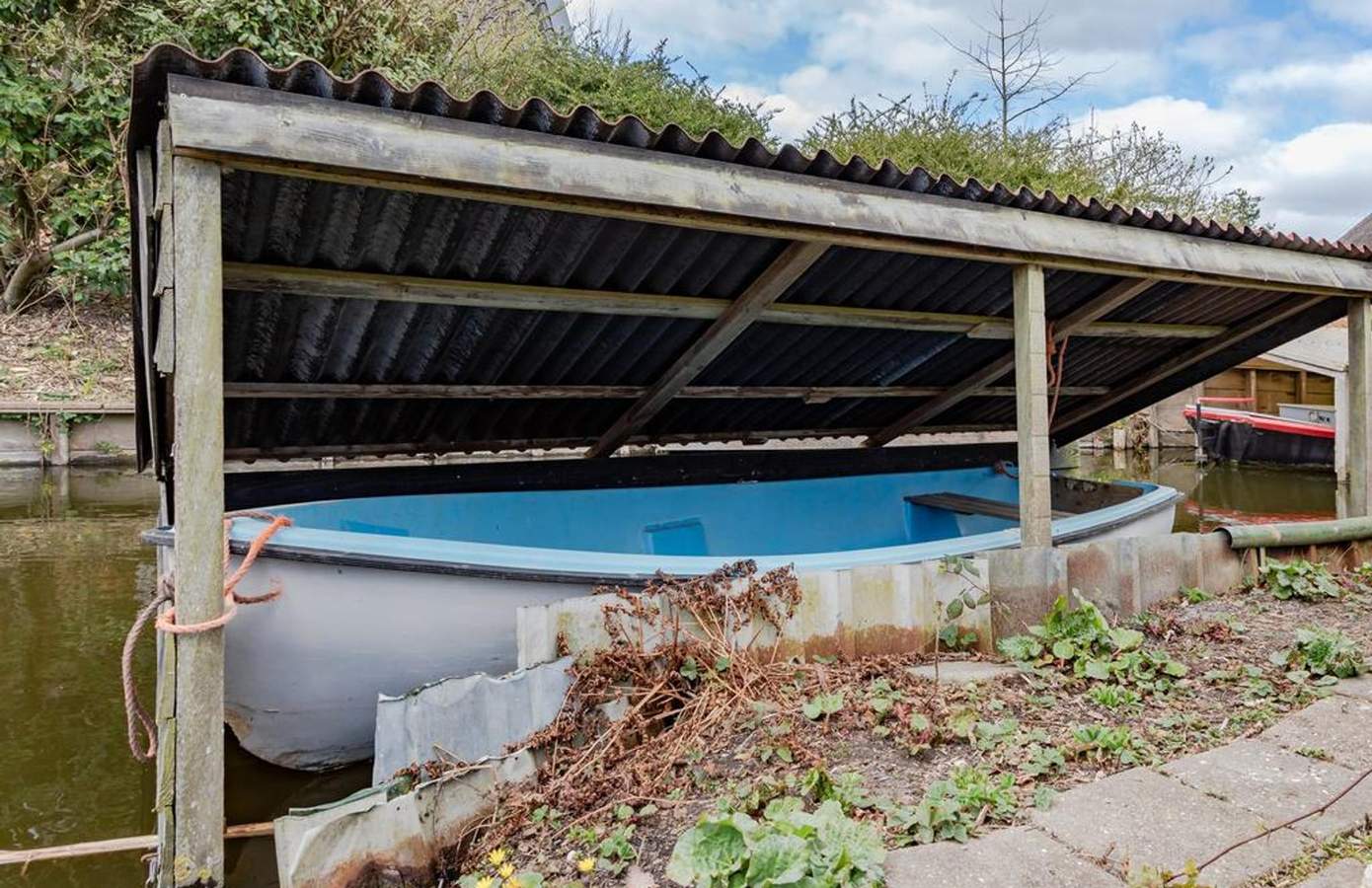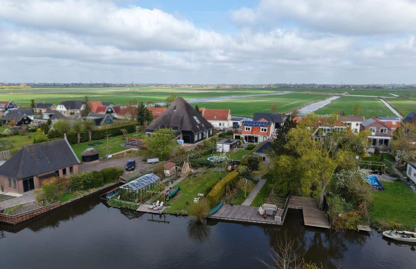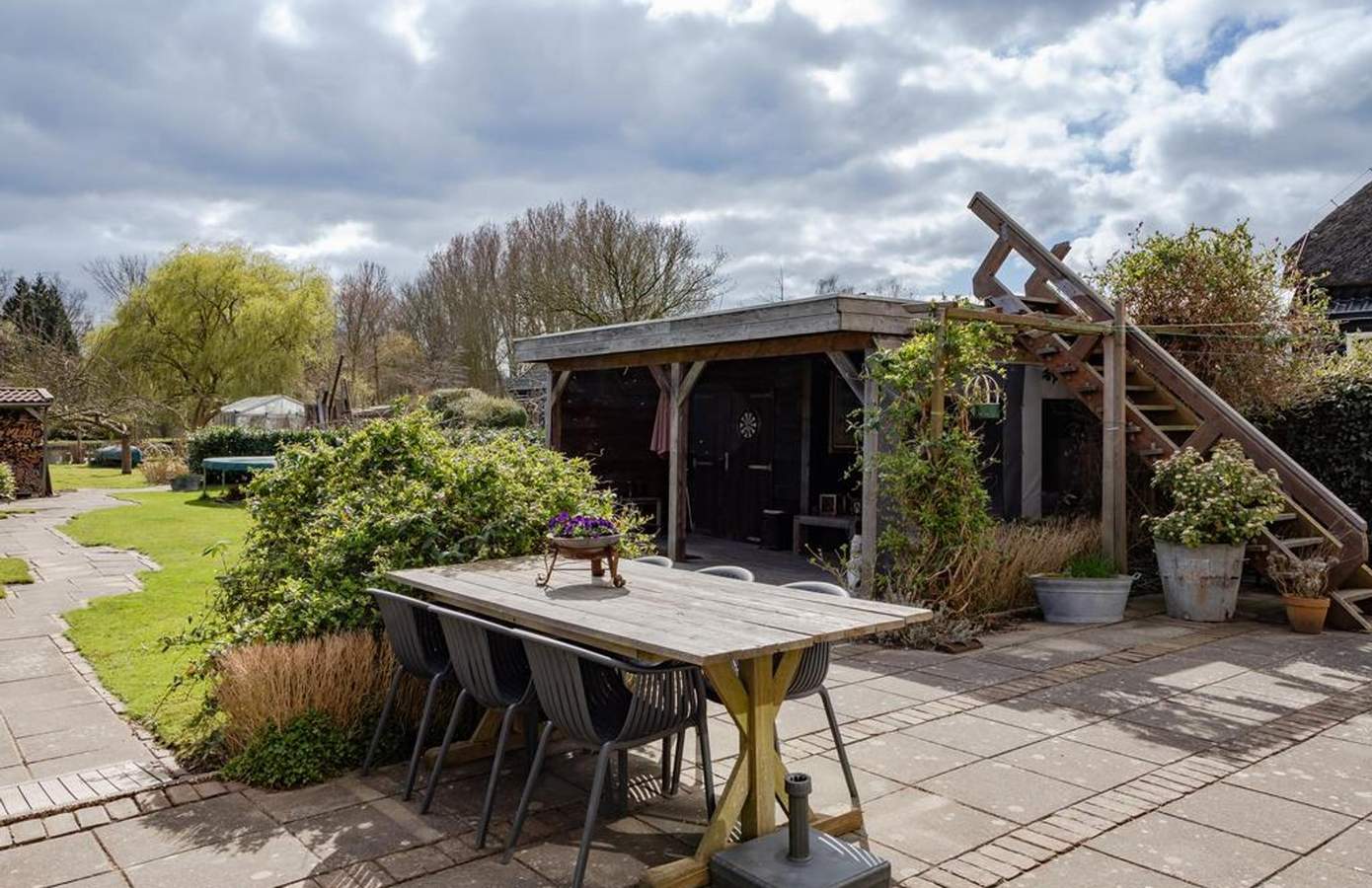 De tuin van deze woning is werkelijk een paradijs, gelegen op het zuiden en direct aan het doorgaand vaarwater. Er is een steiger waar u een kano kunt aanleggen, kunt vissen of in de zon kunt relaxen. Door de verschillende zithoeken kunt u altijd meebewegen met de zonnestralen en optimaal genieten van het buitenleven. Onder de veranda is het ‘s ochtends heerlijk ontbijten in de eerste zonnestralen, en dankzij de heater is het ook ‘s avonds een fijne plek om te vertoeven. De tuin is breed en diep, ideaal voor kinderen om te spelen en te ontdekken. Daarnaast is er een kas met groente, een moestuin en groeien er in de tuin op meerdere plekken frambozenstruiken. Heerlijk en ook nog eens zelfvoorzienend. De oprit biedt ruimte voor drie auto’s: één links en twee rechts.