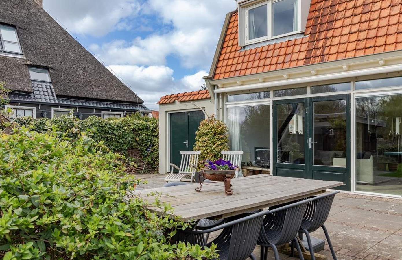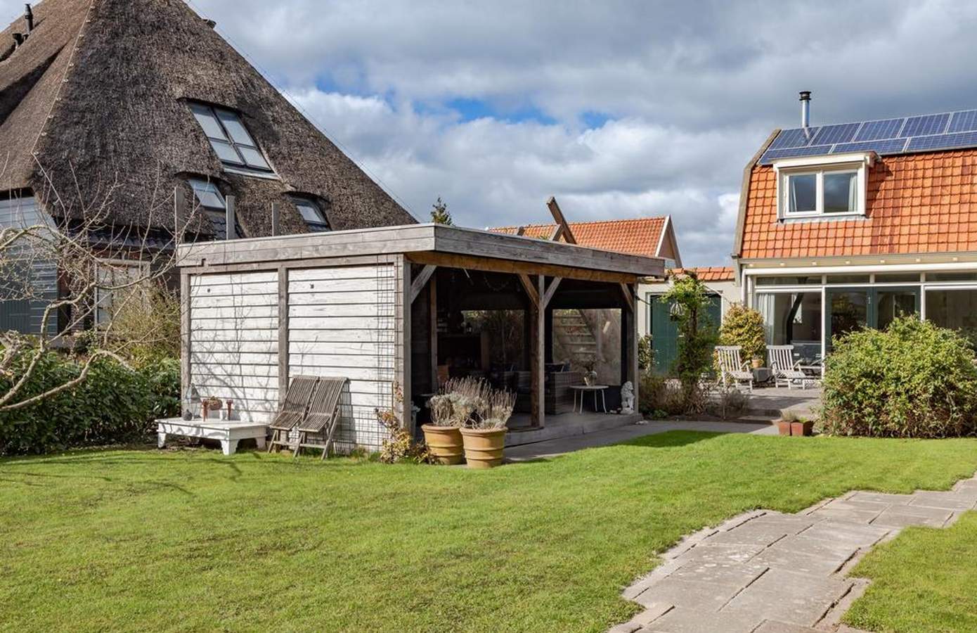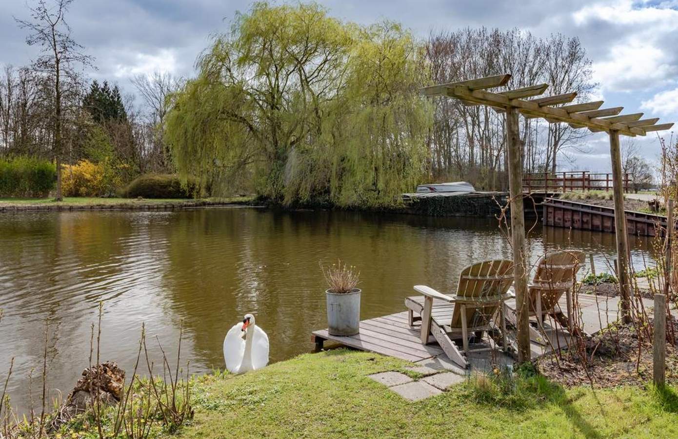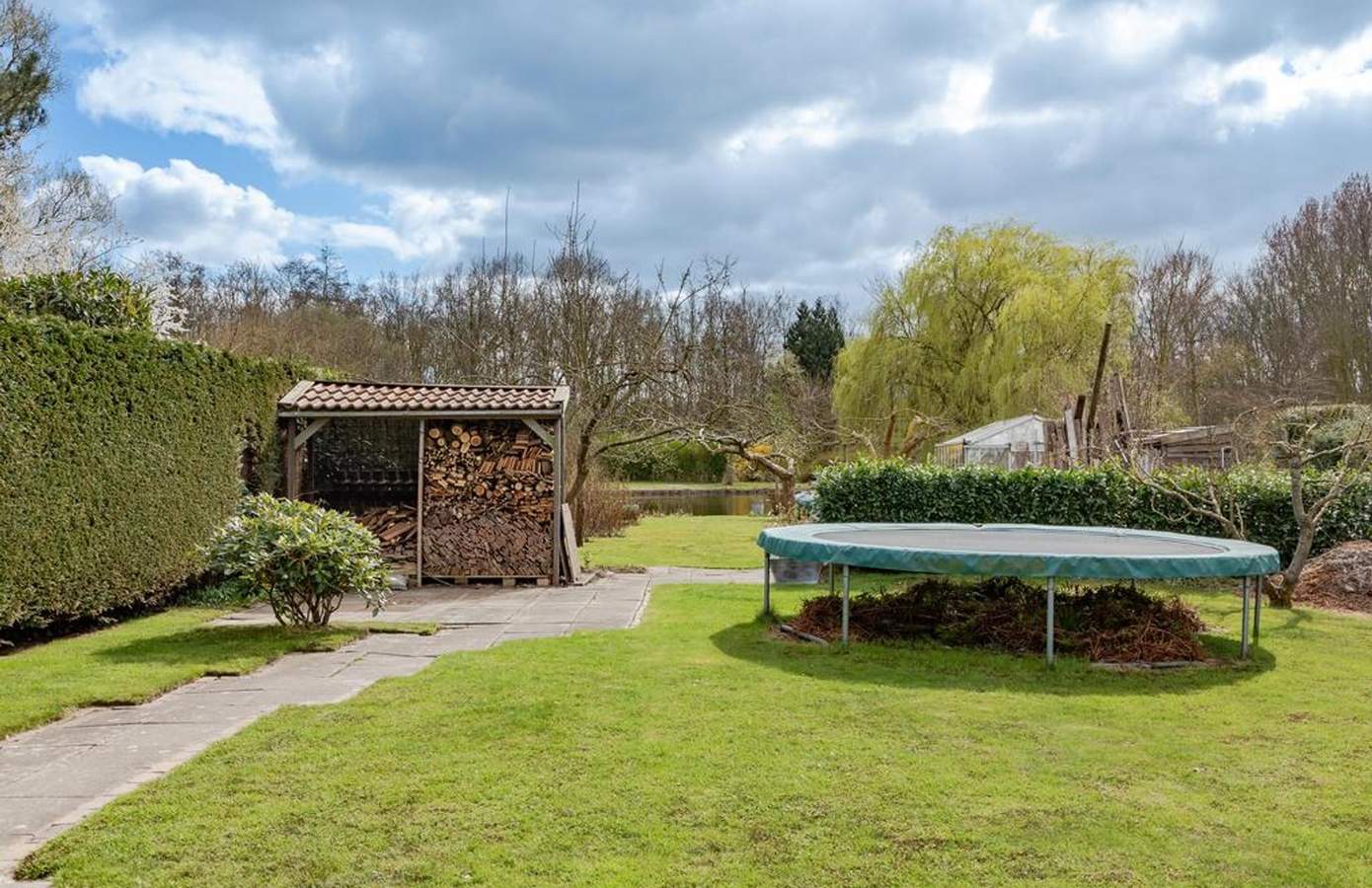 De tuin van deze woning is werkelijk een paradijs, gelegen op het zuiden en direct aan het doorgaand vaarwater. Er is een steiger waar u een kano kunt aanleggen, kunt vissen of in de zon kunt relaxen. Door de verschillende zithoeken kunt u altijd meebewegen met de zonnestralen en optimaal genieten van het buitenleven. Onder de veranda is het ‘s ochtends heerlijk ontbijten in de eerste zonnestralen, en dankzij de heater is het ook ‘s avonds een fijne plek om te vertoeven. De tuin is breed en diep, ideaal voor kinderen om te spelen en te ontdekken. Daarnaast is er een kas met groente, een moestuin en groeien er in de tuin op meerdere plekken frambozenstruiken. Heerlijk en ook nog eens zelfvoorzienend. De oprit biedt ruimte voor drie auto’s: één links en twee rechts.