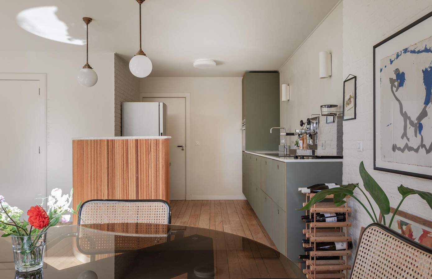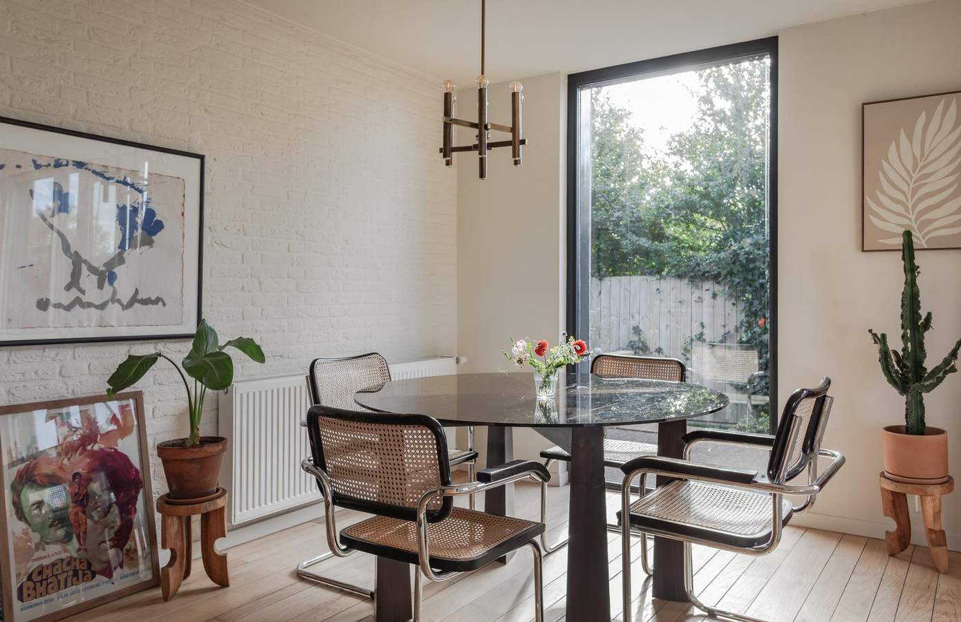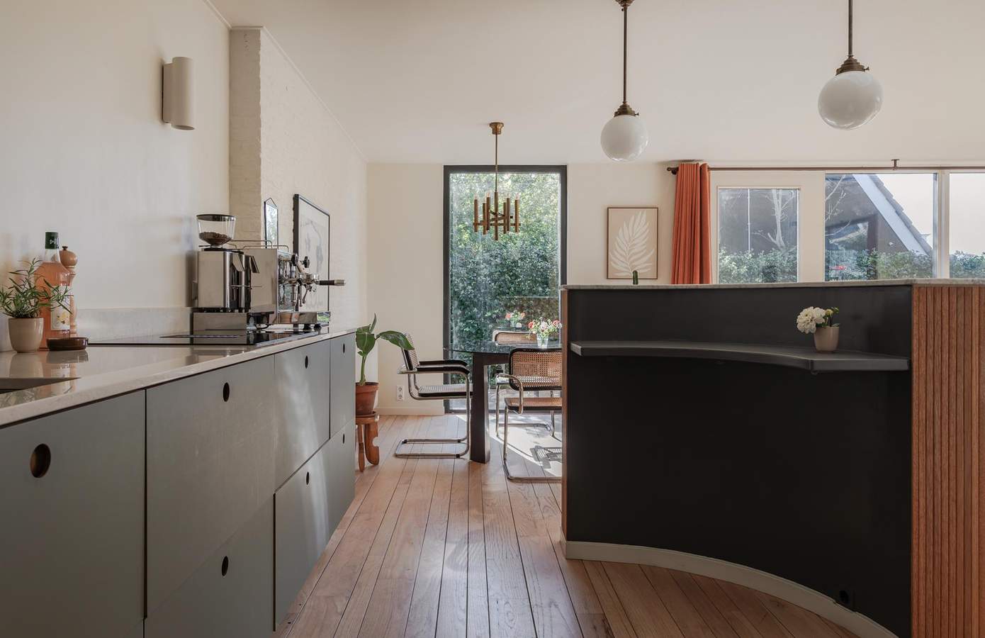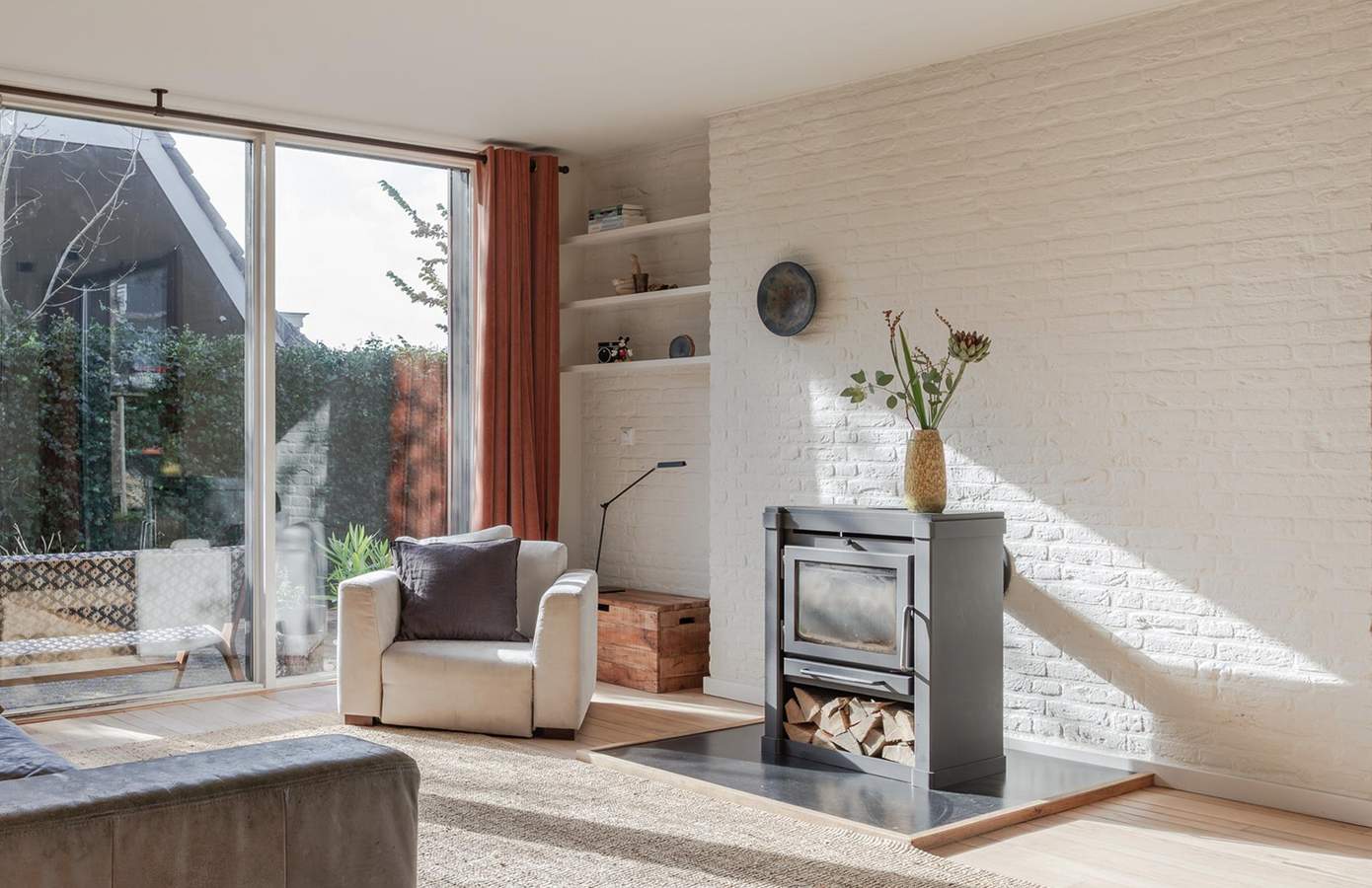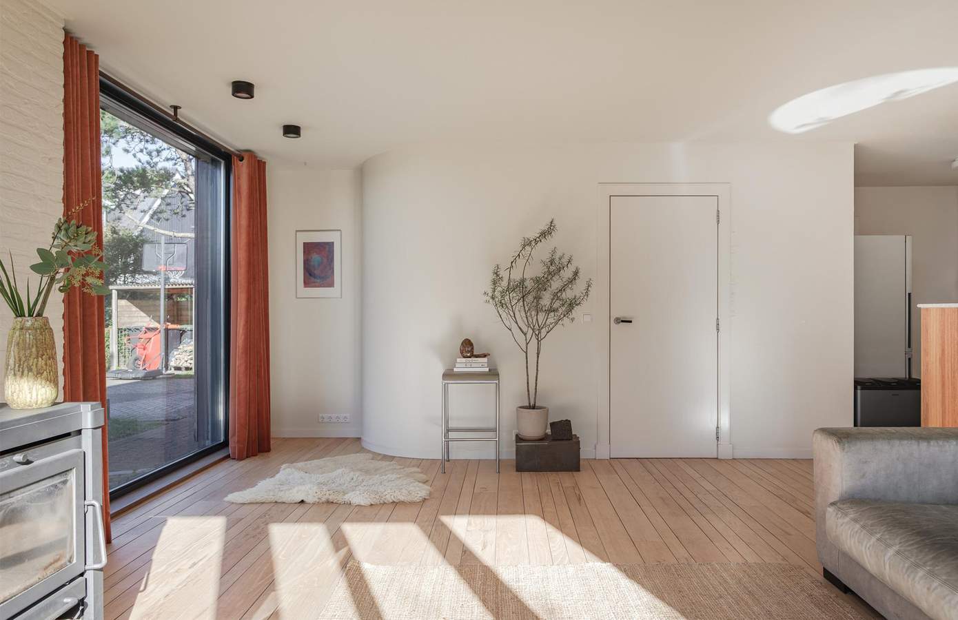 Grote raampartijen aan twee zijden in de woonkamer zorgen voor een overvloed aan daglicht en een prachtig gevoel van ruimte. De sfeervolle houtkachel en de massief houten vloer geven het geheel een warme en karaktervolle uitstraling.De Scandinavische designkeuken is uitgerust met moderne voorzieningen zoals een oven en een inductiekookplaat met geïntegreerd afzuigsysteem.