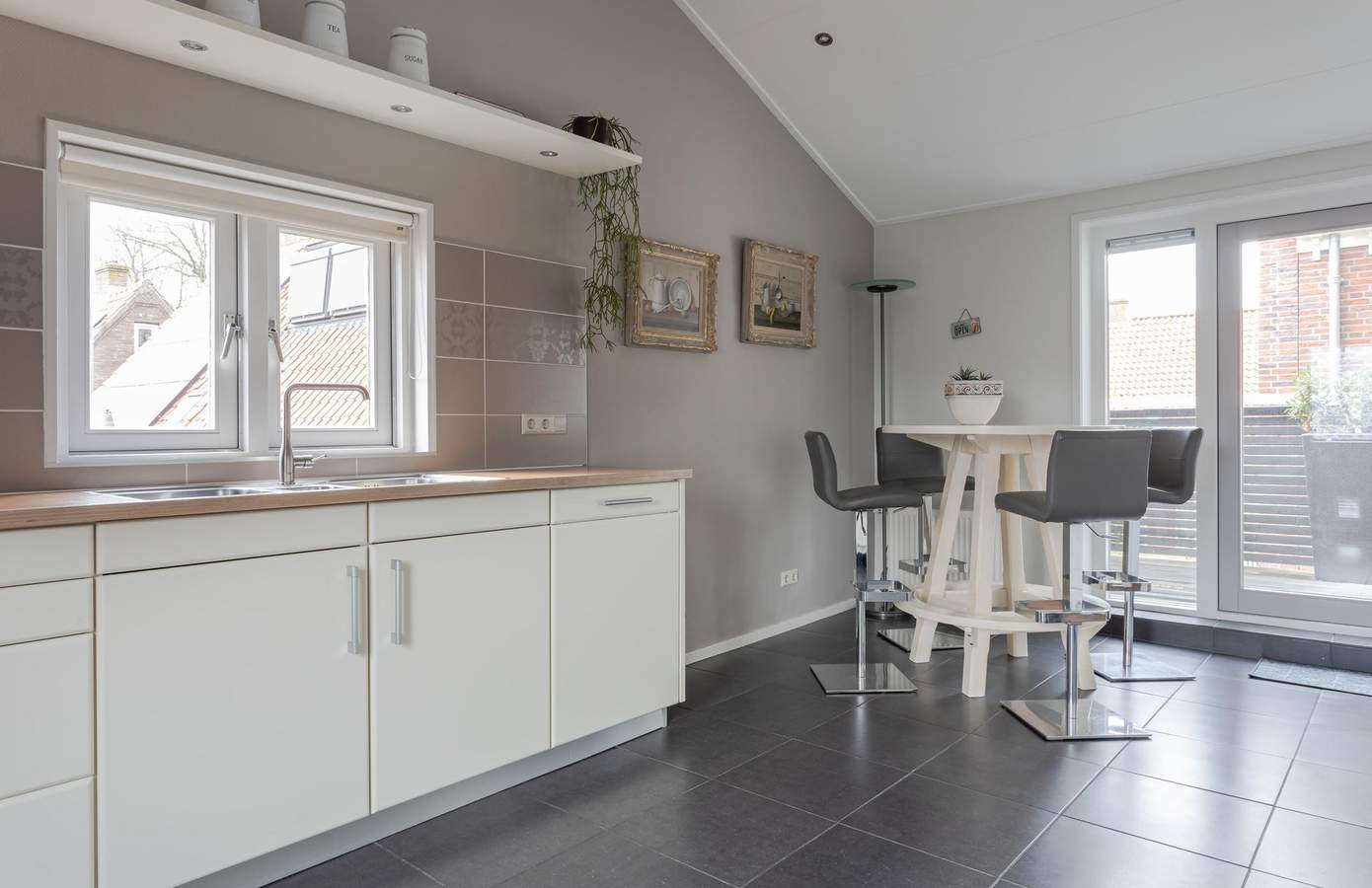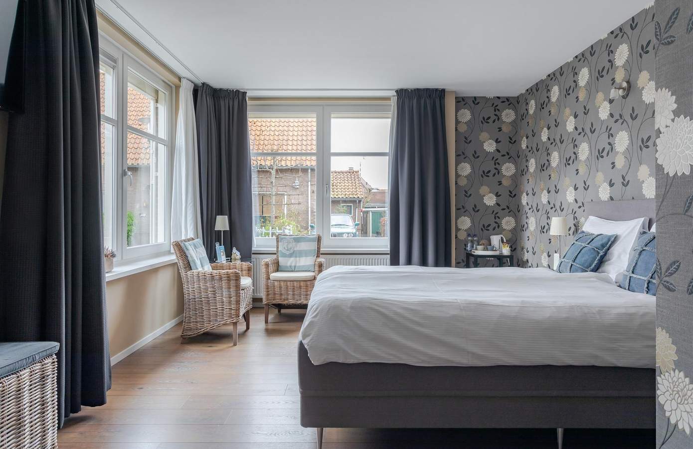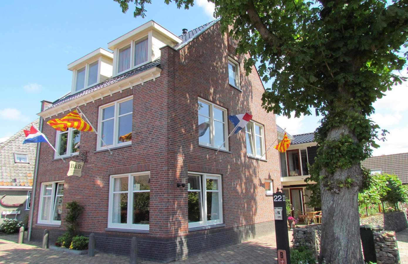 Wanneer u vanaf de straat het terras oploopt, vindt u onder de overkapping de entree naar de B&B. Eenmaal over de drempel wordt u verrast door de speelse indeling en ervaart u de fijne sfeer die binnen heerst. In totaal zijn hier vier ruime hotelkamers gerealiseerd, allemaal voorzien van een eigen badkamer. Verder is er een gezellige gastenkamer, waar in de winter de houtkachel brandt. Het ontbijt wordt geserveerd vanuit de handgemaakte keuken, welke afsluitbaar is door middel van en-suite schuifdeuren.