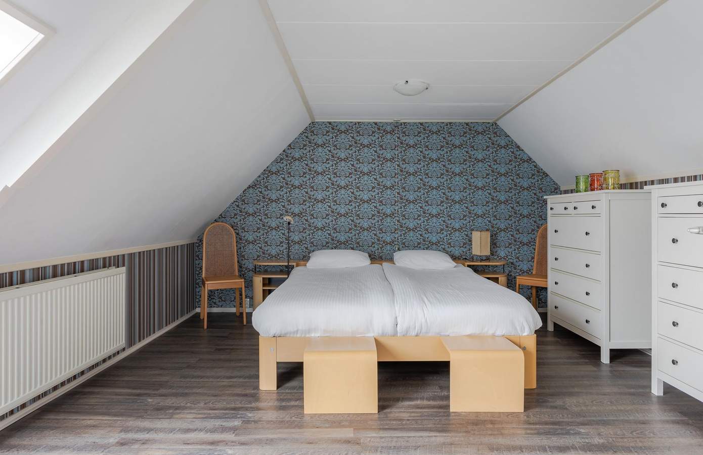 De vaste trap brengt u naar de tweede verdieping, waar de balken prachtig in het zicht zijn gehouden en de ruimtes wederom riant zijn. Hier vindt u drie slaapkamers, een badkamer, een extra toilet en een afsluitbare ruimte ten behoeve van de wasmachine. Boven de twee voorste slaapkamers is een opbergzolder gecreëerd.
