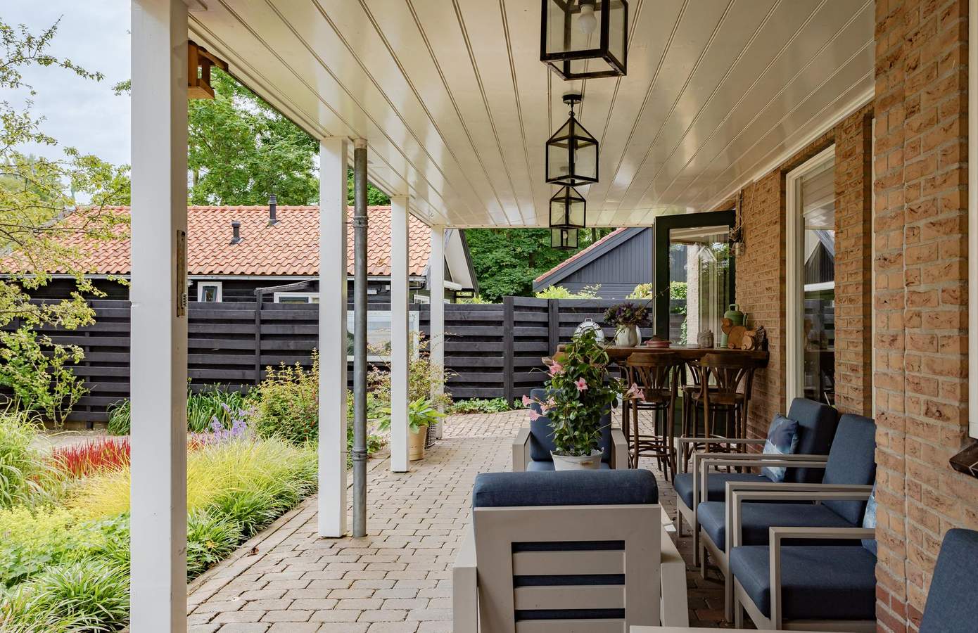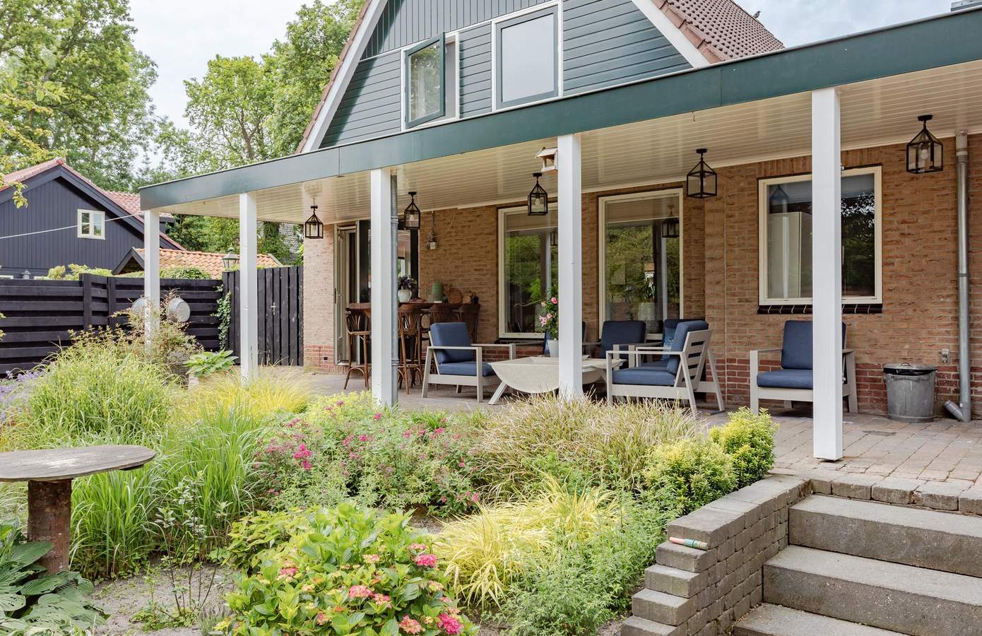 Een heerlijke tuin waar een goede balans is gemaakt tussen gemak en toch groen. Veel straatwerk rondom de woning maar toch ook wat groene borders met een diversietijd aan plantensoorten. In 2021 is er een nieuwe schuur geplaatst met een veranda. Dit is een heerlijke plek om prima te vertoeven. Onder de overkapping tegen de woning aan treft u ook meerdere zitjes. U kunt met de wind en de zon mee verplaatsen. Voorkeur voor de zon of juist liever de schaduw, het kan hier allebei op elk moment van de dag. In 2022 is de coniferenhaag tussen de buren vervangen voor een houten schutting.