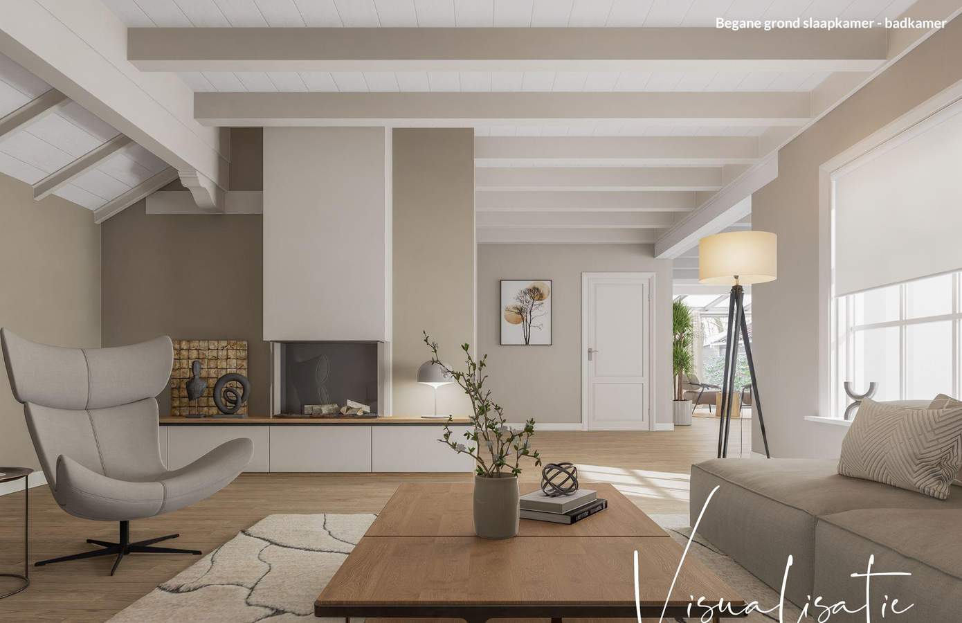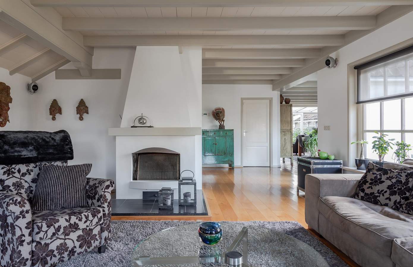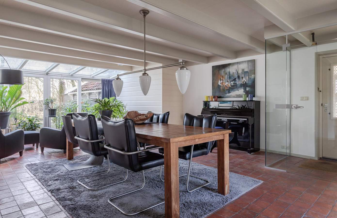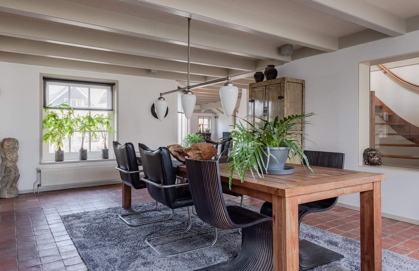Op de begane grond bevindt zich een ruime leefruimte die is opgedeeld in een grote eetkamer, compleet met een charmante glazen serre. Dankzij deze serre heeft de woning veel daglicht, en biedt het een prachtig uitzicht op het terras en de tuinkas. De woonkamer, gelegen aan de voorzijde van de woning, kenmerkt zich door een authentiek balkenplafond en een gezellige openhaard, ideaal om lekker bij te zitten. Vanuit de eetkamer is er een open verbinding naar de halfopen keuken, uitgerust met een kook-spoeleiland en alle benodigde inbouwapparatuur, waaronder een volautomatische koffiemachine, wijnkoelkast en een oven. Tegenover de keuken wordt de extra ruimte slim benut met een aanrecht dat bij de keuken hoort, samen met een handige inloopkast voor het opbergen van uw spullen. Vanuit deze ruimte heeft u directe toegang tot de beneden slaapkamer met aangrenzende badkamer. Deze ruime slaapkamer geniet van overvloedig daglicht en beschikt over openslaande deuren die uitkomen op de tuin. De badkamer is voorzien van luxe voorzieningen, waaronder een royale inloopdouche waar u van twee kanten in kunt stappen, een groot wastafelmeubel met dubbele wastafels, een toilet en vloerverwarming.