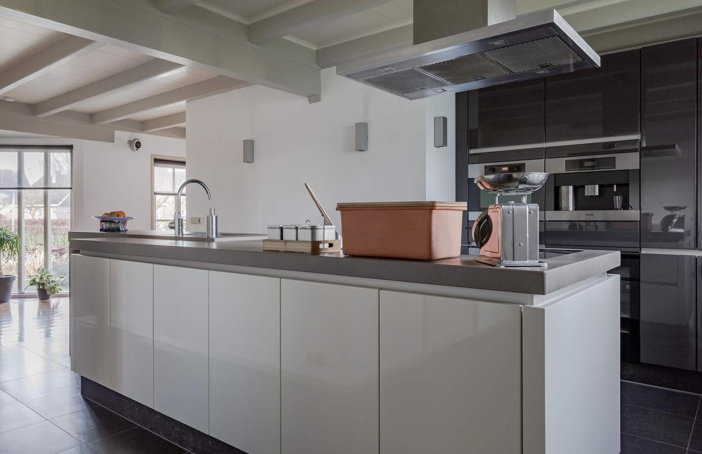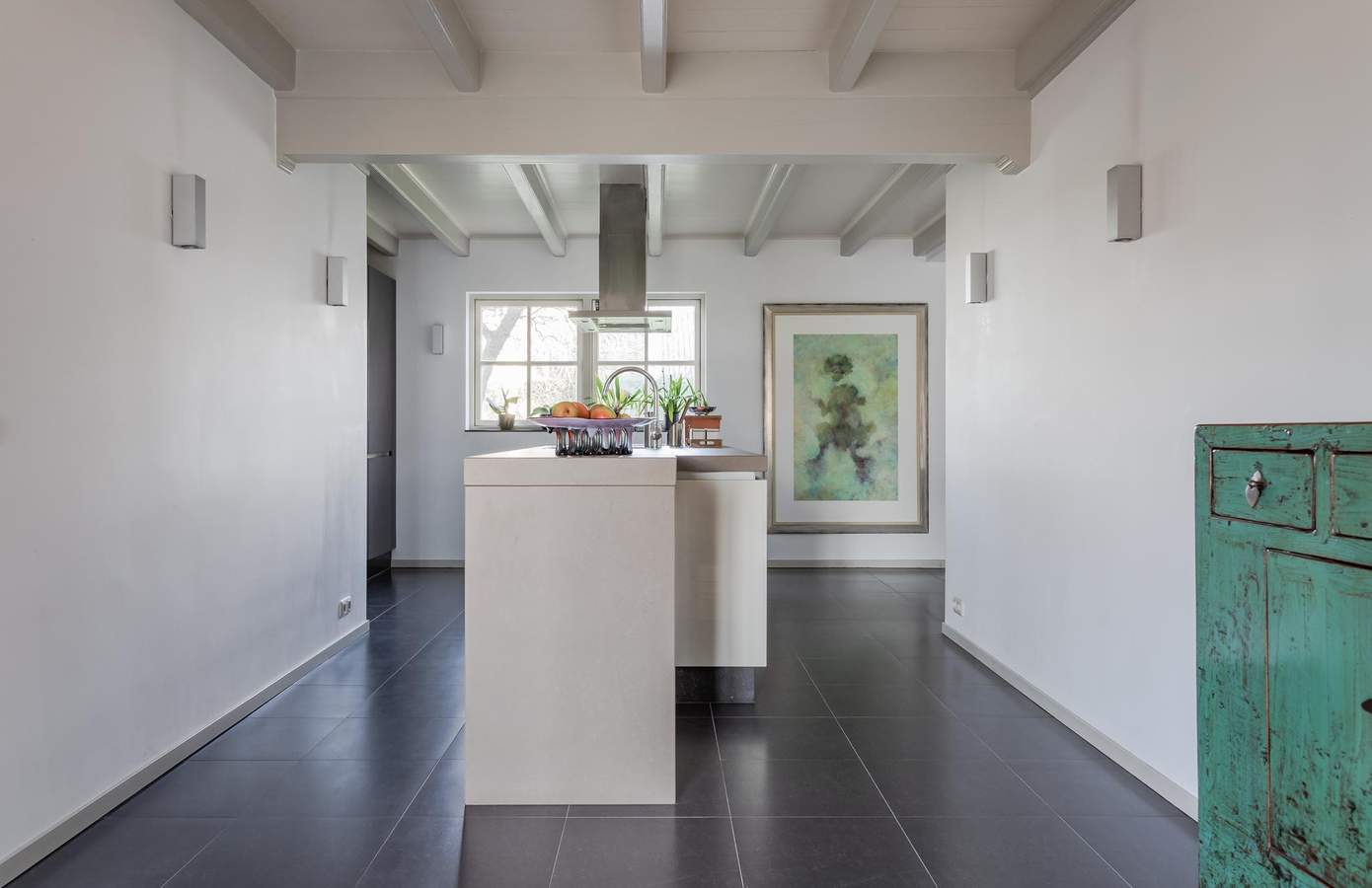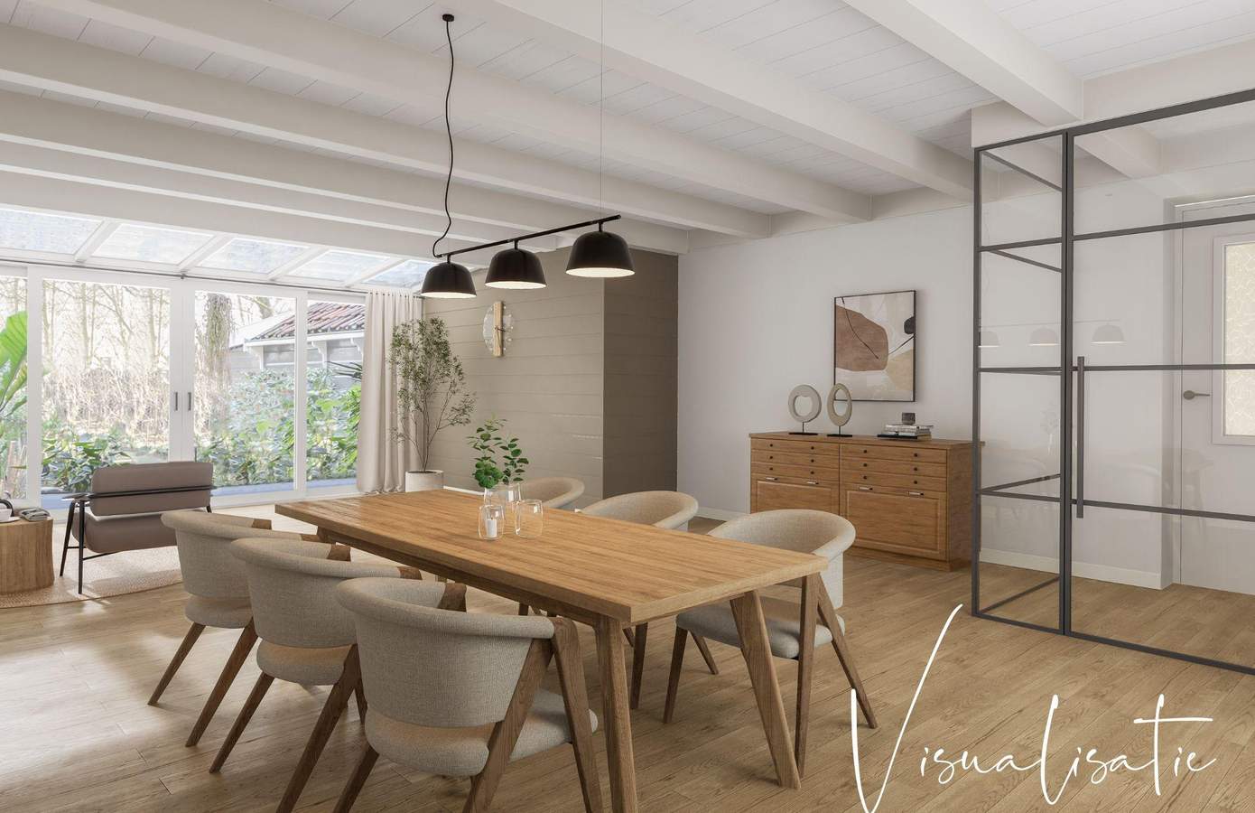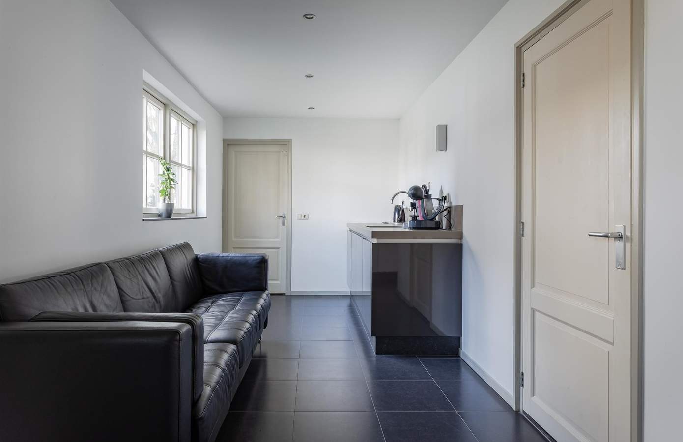 Op de begane grond bevindt zich een ruime leefruimte die is opgedeeld in een grote eetkamer, compleet met een charmante glazen serre. Dankzij deze serre heeft de woning veel daglicht, en biedt het een prachtig uitzicht op het terras en de tuinkas. De woonkamer, gelegen aan de voorzijde van de woning, kenmerkt zich door een authentiek balkenplafond en een gezellige openhaard, ideaal om lekker bij te zitten. Vanuit de eetkamer is er een open verbinding naar de halfopen keuken, uitgerust met een kook-spoeleiland en alle benodigde inbouwapparatuur, waaronder een volautomatische koffiemachine, wijnkoelkast en een oven. Tegenover de keuken wordt de extra ruimte slim benut met een aanrecht dat bij de keuken hoort, samen met een handige inloopkast voor het opbergen van uw spullen. Vanuit deze ruimte heeft u directe toegang tot de beneden slaapkamer met aangrenzende badkamer. Deze ruime slaapkamer geniet van overvloedig daglicht en beschikt over openslaande deuren die uitkomen op de tuin. De badkamer is voorzien van luxe voorzieningen, waaronder een royale inloopdouche waar u van twee kanten in kunt stappen, een groot wastafelmeubel met dubbele wastafels, een toilet en vloerverwarming.