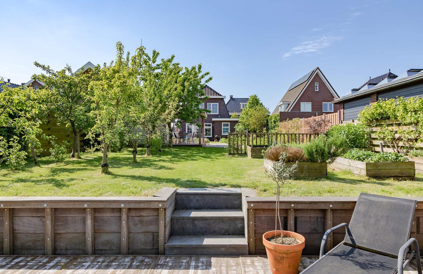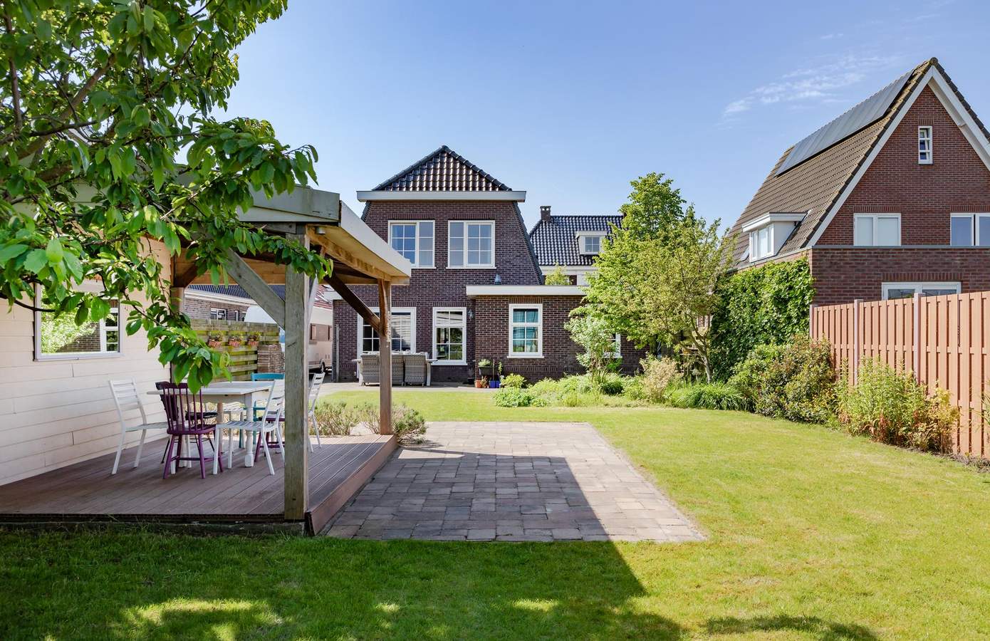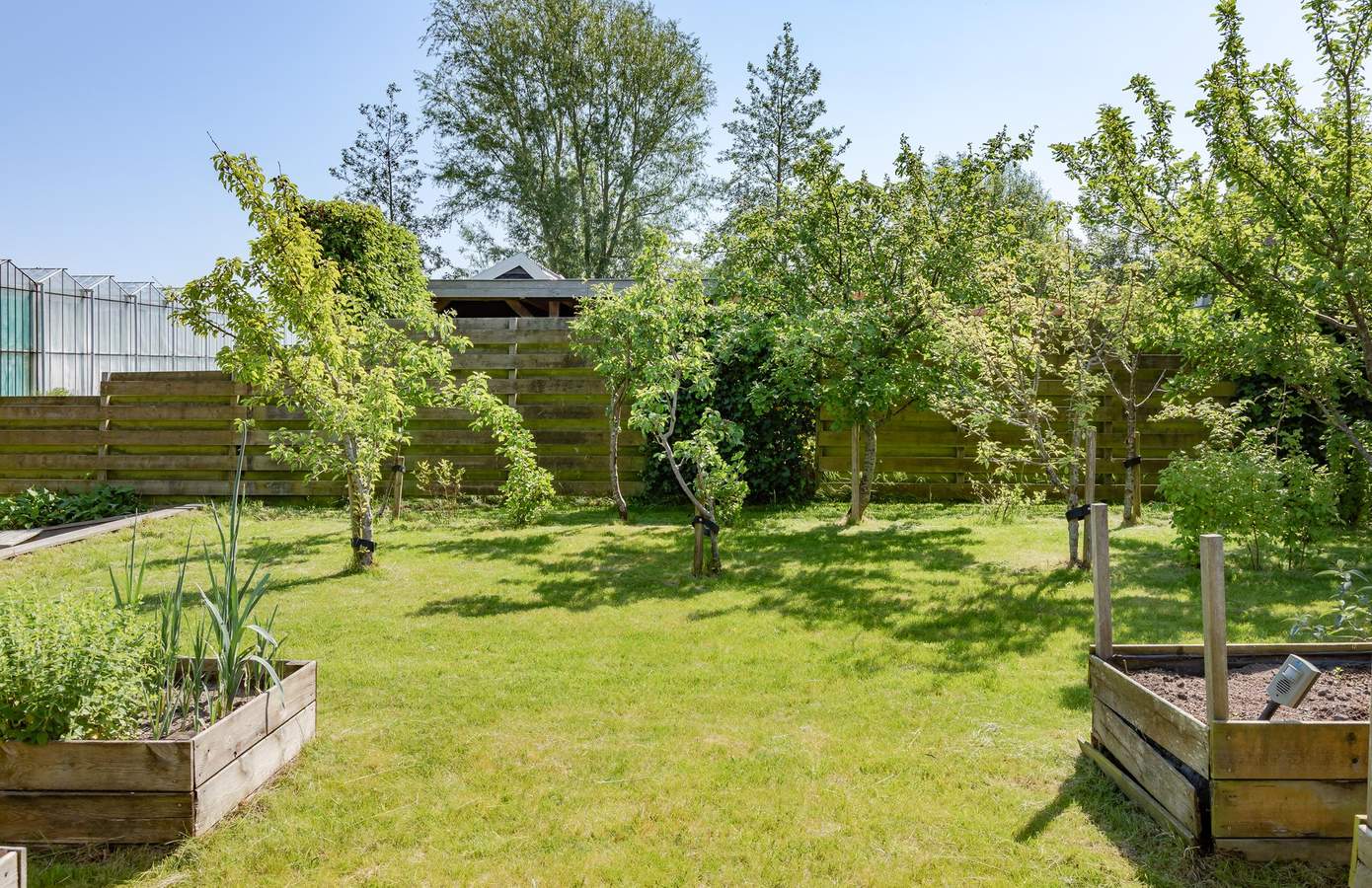 Ruimte alom in de ruim 40 meter diepe achtertuin. De ligging is aan het water, ideaal om een hengeltje te werpen of om in de winter de schaatsen onder te binden. Aan de waterkant is het op het ’‘zonnedek’‘ heerlijk vertoeven! Voor ieder moment van de dag is er in deze fijne tuin een lekkere plek in zowel de zon als de schaduw te vinden. De tuin is verzorgd aangelegd met een combinatie van terras, gazon en een diversiteit aan groen. Er is zelfs een moestuin waar eigen groente, fruit en kruiden verbouwd kunnen worden. Ook zijn er meerdere fruitbomen in de tuin aanwezig. De vrijstaande houten berging van 11 m² is ideaal voor het stallen van fietsen, gereedschap en tuinmeubilair. Grenzend aan deze berging is een overkapping van ruim 13 m² waar u beschut kunt zitten voor lange zomeravonden. Vanaf een kop koffie in de ochtend tot een uitgebreide barbecue in de avondzon, het kan hier allemaal! Uw auto parkeert u overdekt in de garage of op de oprit.