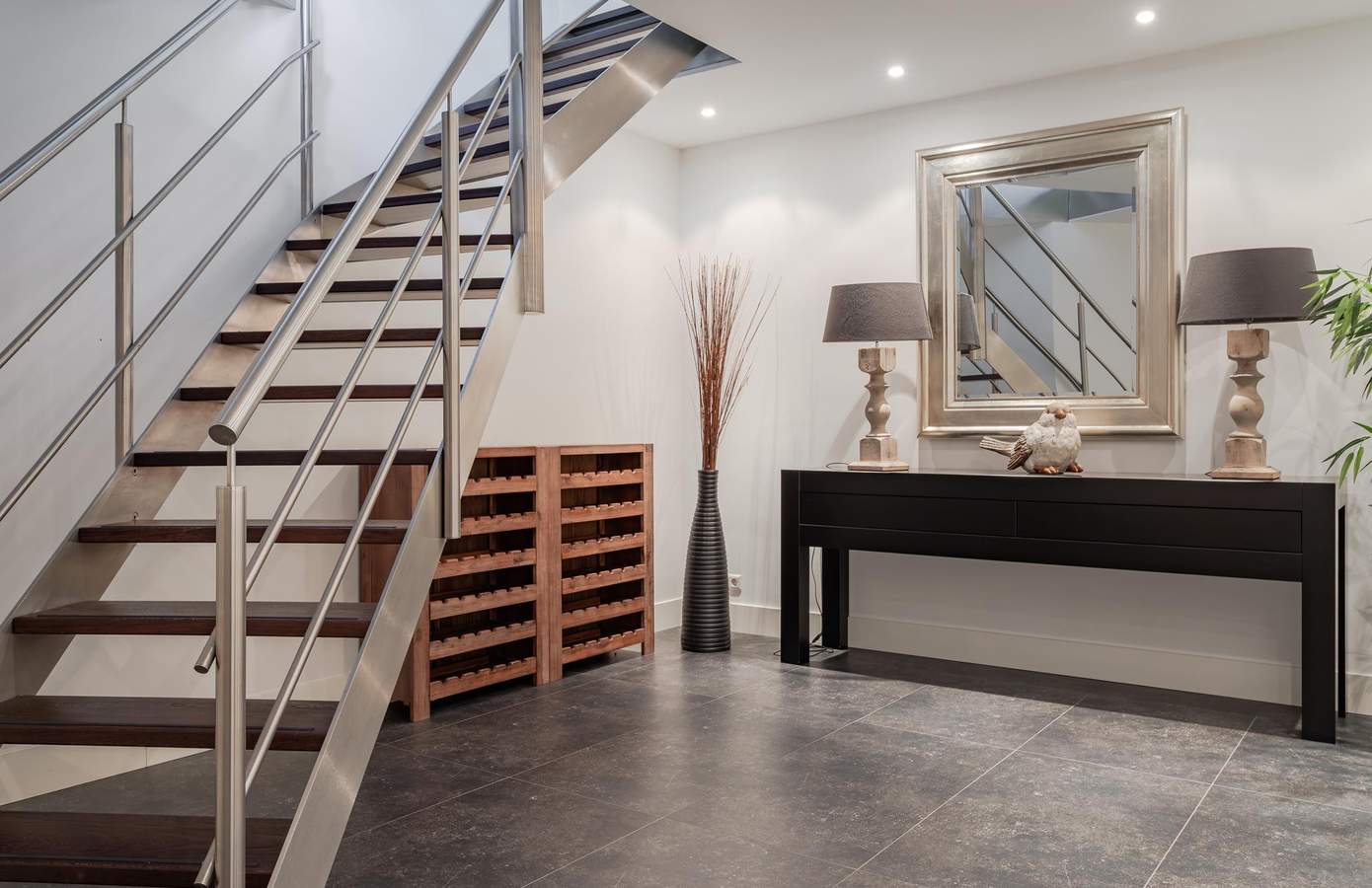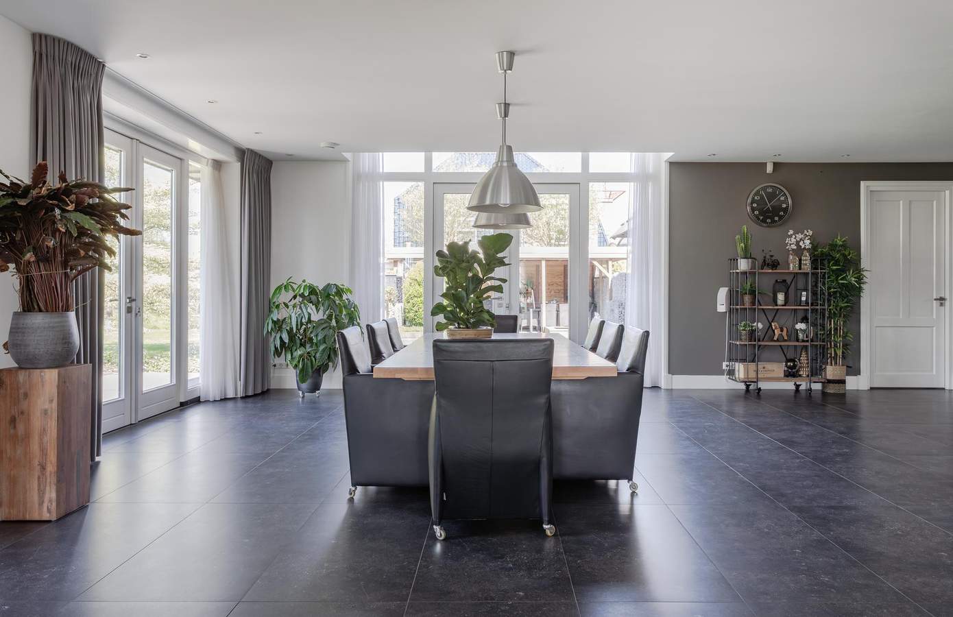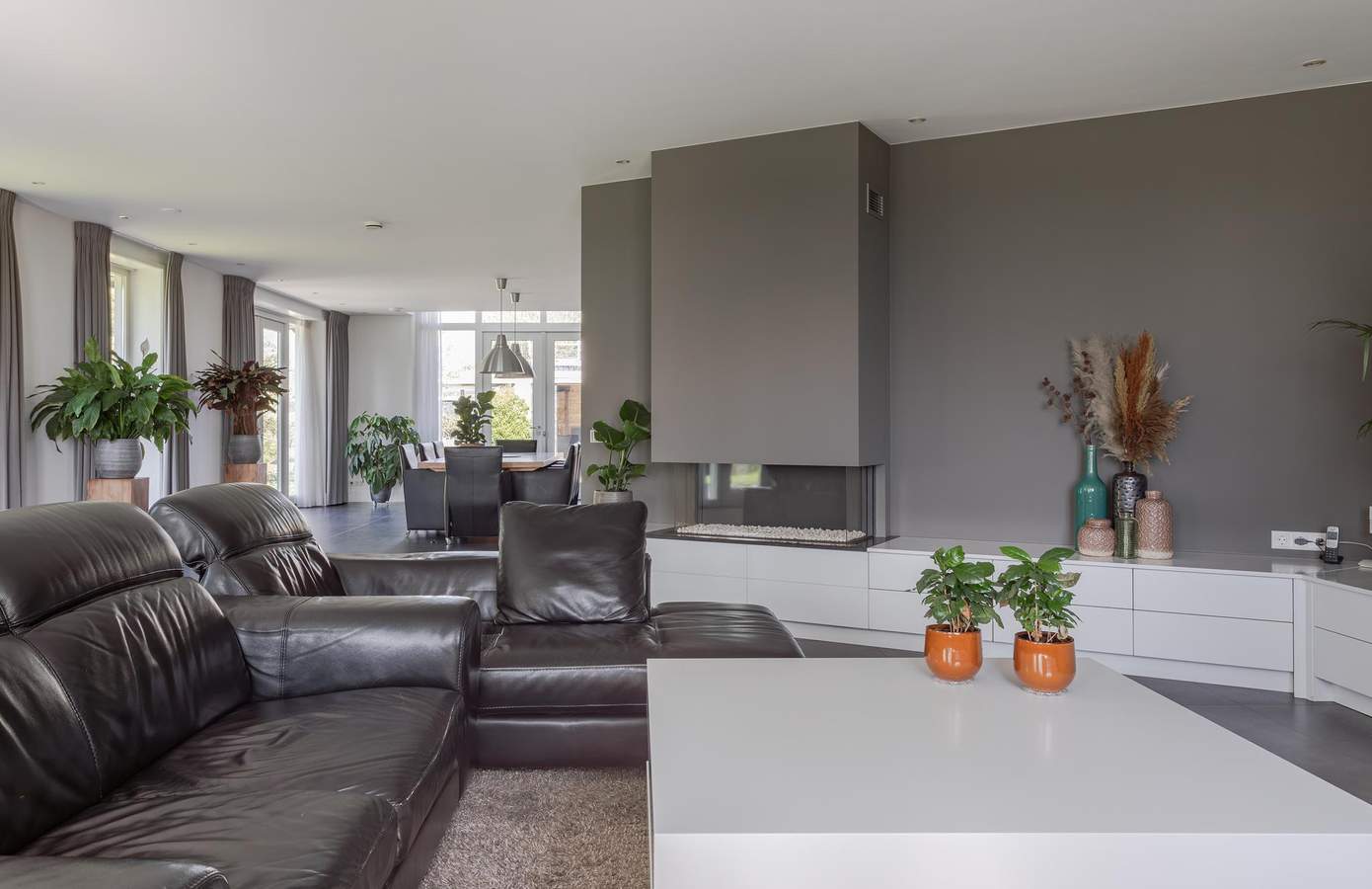 Zodra u de woning betreedt, valt het ruimtelijke karakter op. De hal is hoog en statig. Het trappenhuis is centraal in de woning geplaatst en in het ontwerp door de architect een slag gedraaid, waardoor de ruimtes eromheen interessante afmetingen en vorm krijgen. De trap zelf is als een modern slakkenhuis bedacht dat omhoog cirkelt, een waar meesterwerk. De woonkamer is riant, met grote raampartijen en een sfeervolle gashaard. De keuken is een droom voor elke kookliefhebber: strak wit, voorzien van hoogwaardige en uitgebreide inbouwapparatuur en een centraal kookeiland met een Hi-Macs aanrechtblad. Vanuit de hal bereikt u de werkkamer, een prettige ruimte waar rustig gewerkt en/of gestudeerd kan worden. Op de verdiepingen vindt u in totaal zes slaapkamers, twee stijlvolle badkamers en praktische bergruimtes. Uniek is de kelderverdieping: hier treft u een complete wellness met een spa, sauna, fitnessruimte en een separate ontspanningsruimte met een pantry, ruimte voor een pooltafel en een grote zithoek. Gegarandeerd dat u hier volledig tot rust komt na een drukke dag.