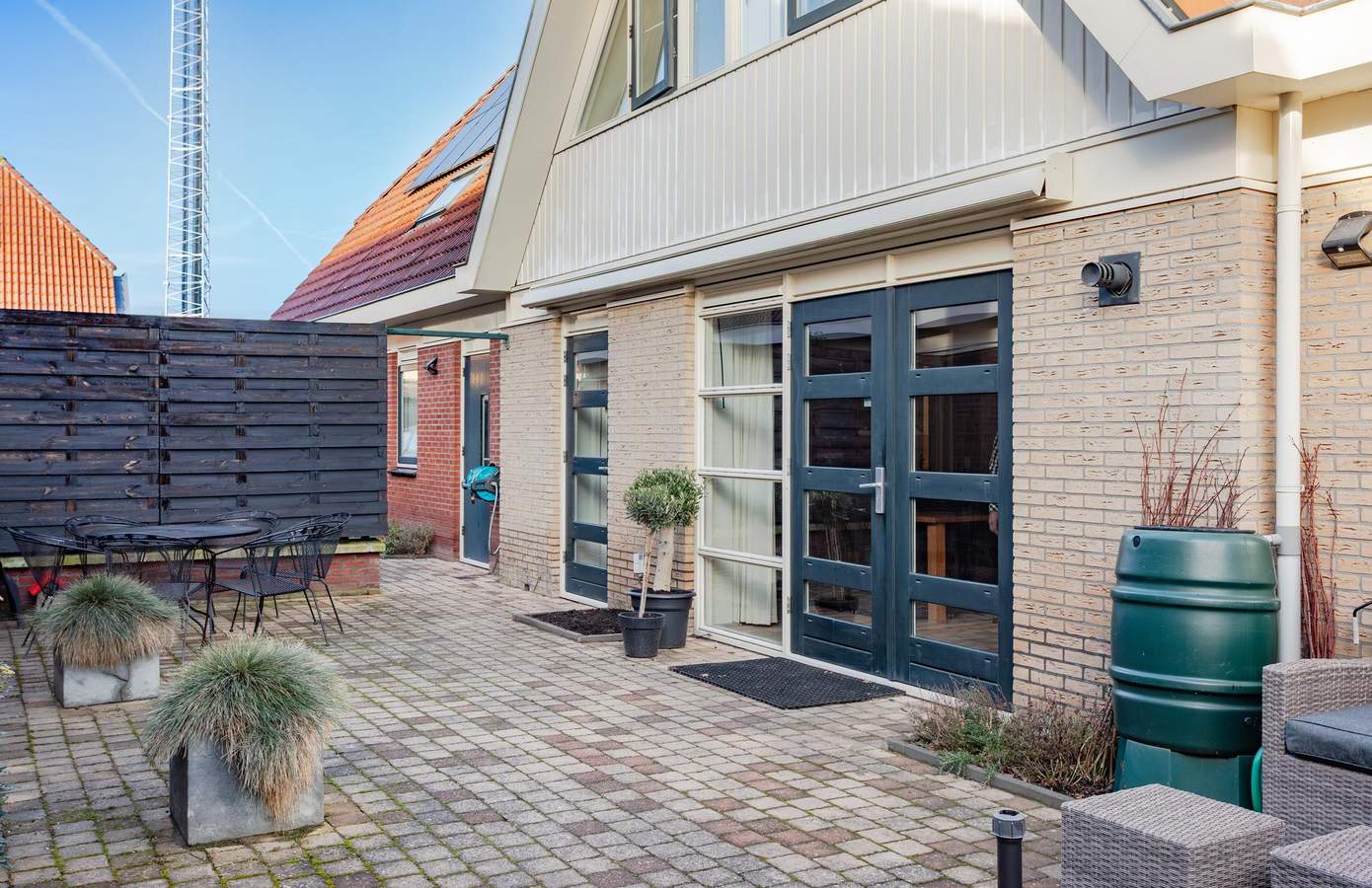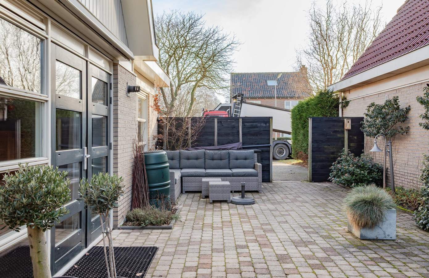 De zijtuin is opgedeeld in verschillende stukken. De verschillende buitenruimtes sluiten logisch aan op de diverse entrees van de woning, zodat u in alle privacy buiten kunt zitten. Parkeren kan op eigen terrein, zowel aan de voor- als achterkant.