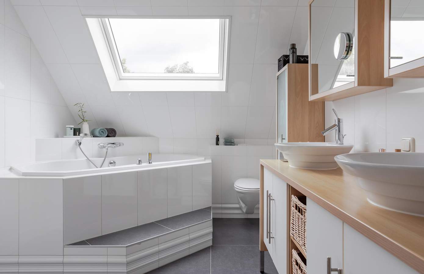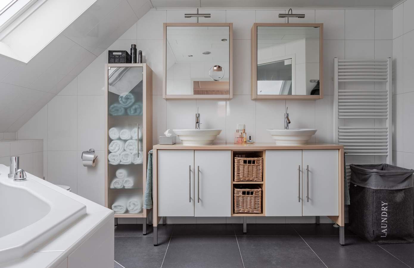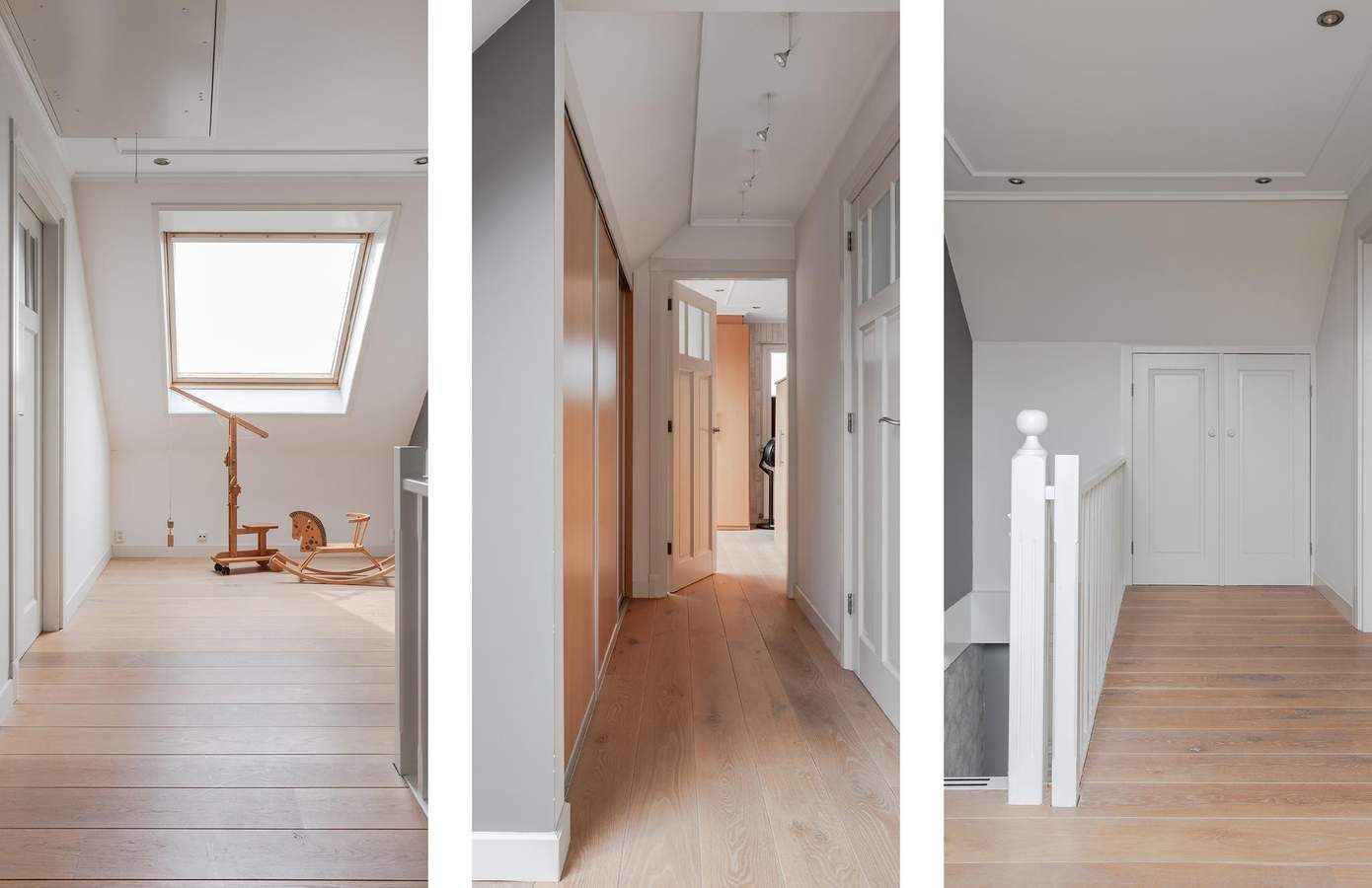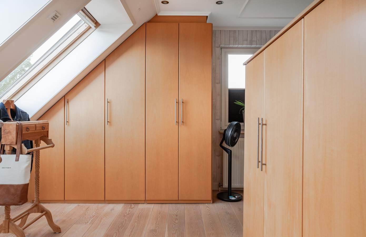 Op de verdieping zijn in totaal drie slaapkamers en de badkamer. De verdiepingsvloer heeft een massief eiken houten vloer. De badkamer is compleet ingericht met een whirlpool, stoomdouche, dubbele wastafel en toilet. Vanuit de master bedroom heeft u een fenomenaal uitzicht over de achtergelegen landerijen. Deze kamer heeft op maat gemaakte kasten, een fraai stuk meubelmaatwerk! De bergzolder loopt over de gehele breedte van de woning, hier is veel bergruimte.