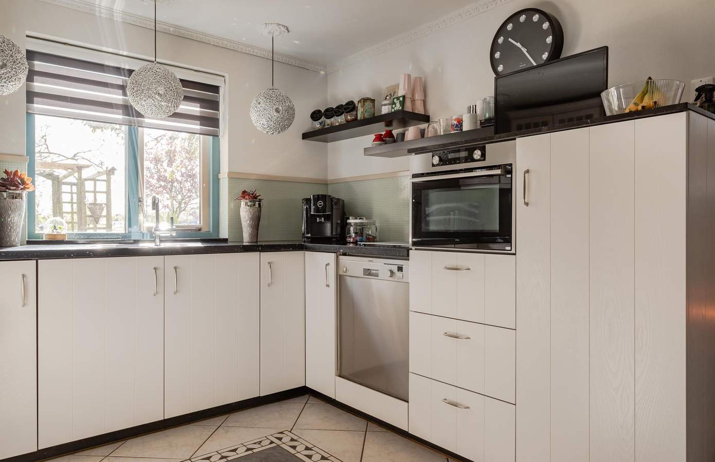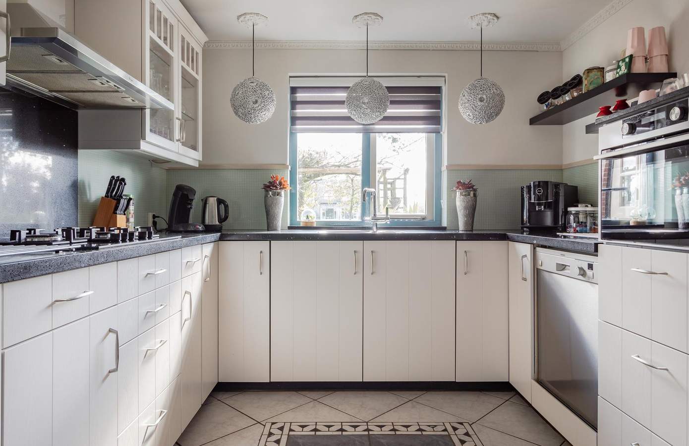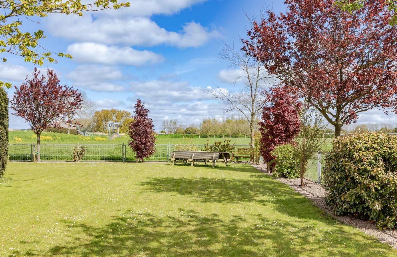 Vanuit de eetkamer heeft u toegang tot de keuken, die twee treden lager ligt dan het woongedeelte. Deze ruime keuken is volledig uitgerust met een vaatwasser, oven, 5-pits gasfornuis en koelkast. Vanuit de keuken kunt u door naar het achterste deel van de woning, waar de bijkeuken zich bevindt. Hierop aansluitend vindt u de slaapkamer en badkamer, beide op de begane grond. Deze ruime en lichte slaapkamer biedt een prachtig uitzicht op de tuin en de dijk, een schitterend tafereel om mee wakker te worden. Met openslaande deuren naar de tuin heeft u hier zelfs een eigen veranda waar u de dag goed kunt beginnen. De badkamer, die in 2016 is vernieuwd, straalt een warme en moderne sfeer uit en is uitgerust met een ligbad, inloopdouche, dubbele wastafel en toilet.