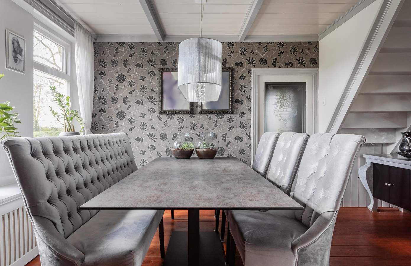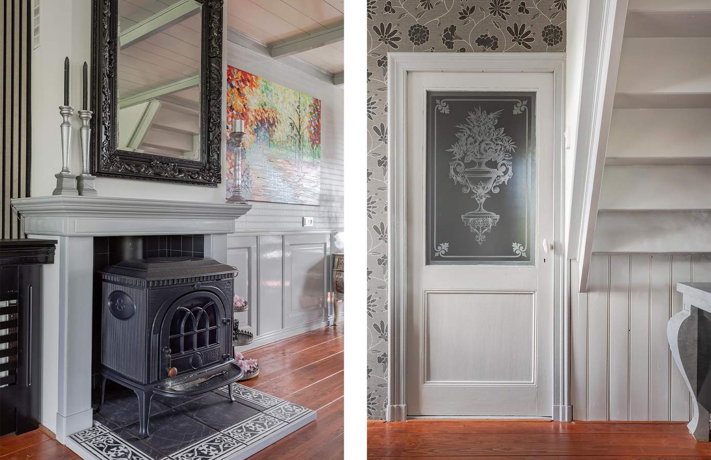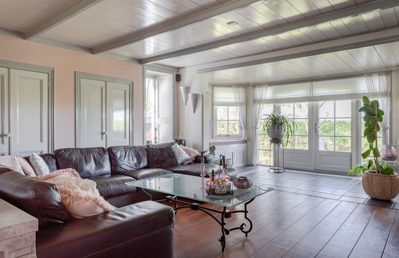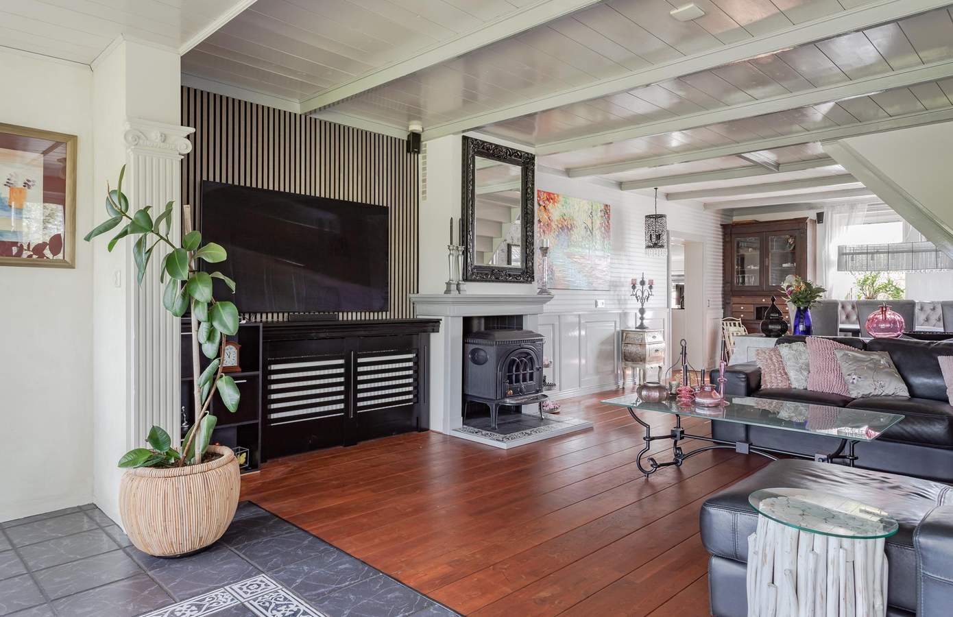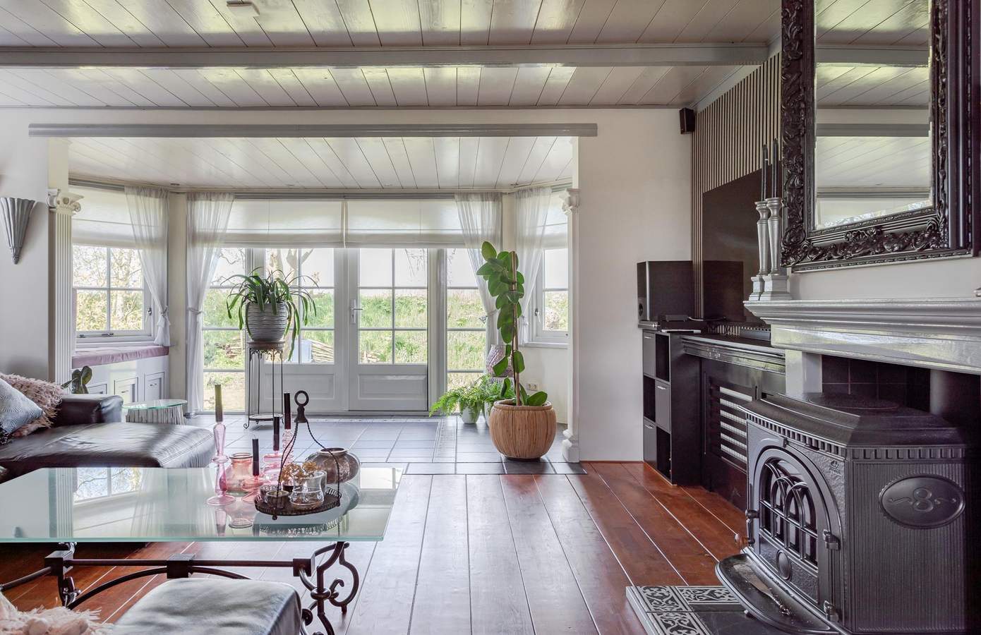 Via de entree komt u binnen in de eetkamer, met aan de overkant de ruime woonkamer die ver naar achteren doorloopt. In het midden van de woonkamer vindt u een sfeervolle schouw met een gezellige houtkachel. Neem plaats in de uitgebouwde erker met openslaande deuren en geniet van het uitzicht op de achtertuin.