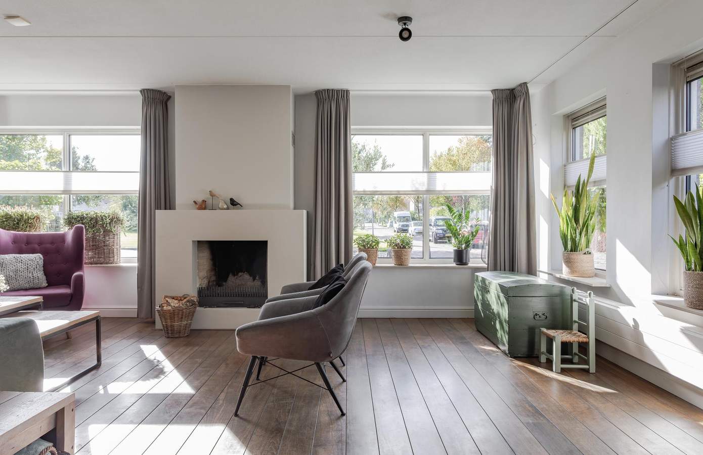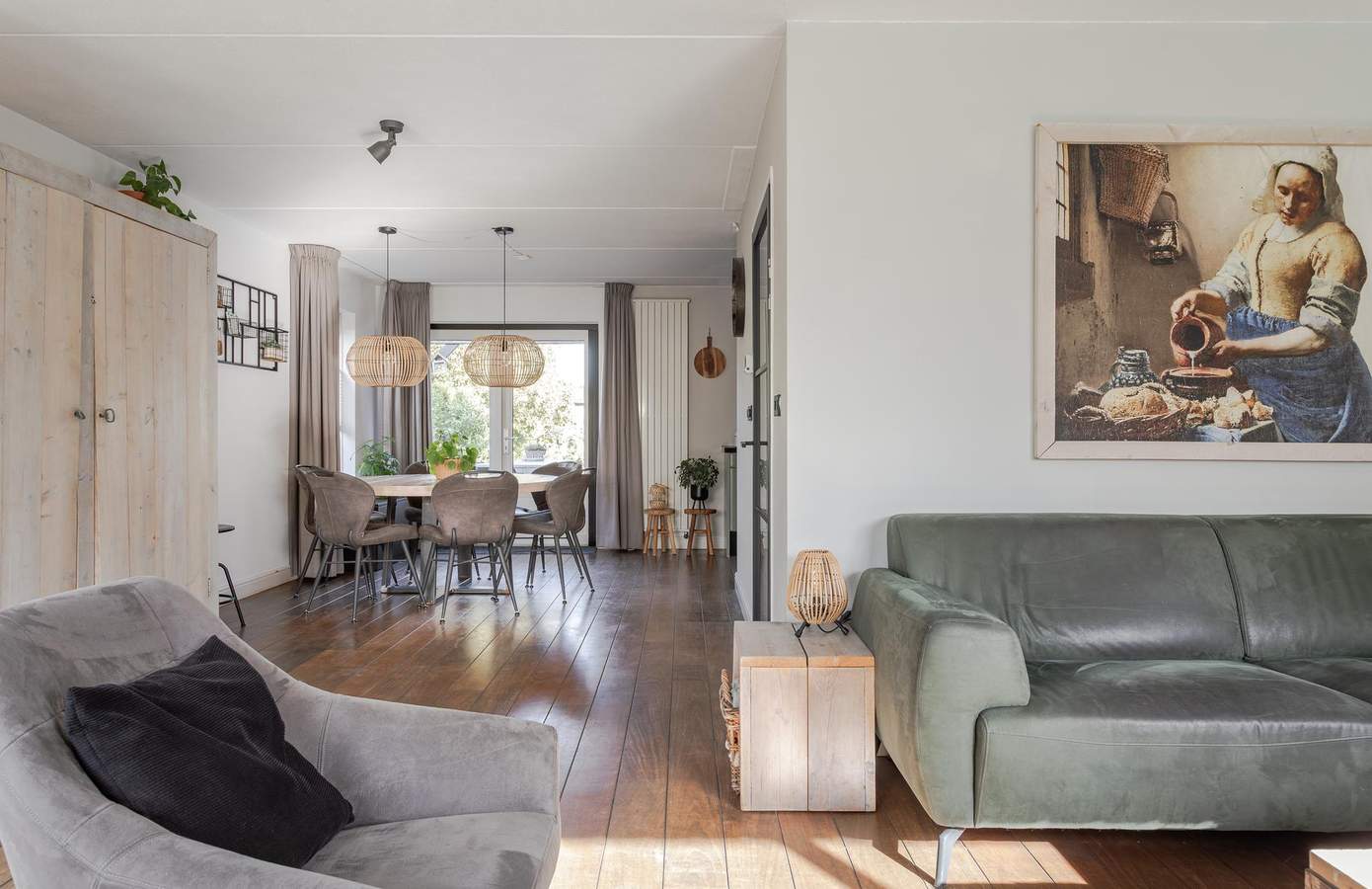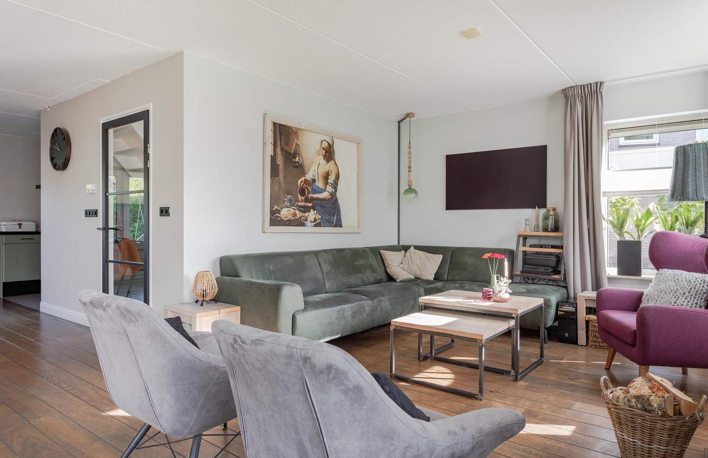 Via de zij-entree stapt u binnen in een lichte hal met toegang tot het moderne toilet (vernieuwd in 2024), de trapopgang (2025) en de woonkamer. De royale woonkamer, gelegen aan de straatzijde, is dankzij de vele ramen heerlijk licht en biedt een vrij uitzicht over de wijk. De zithoek met sfeervolle haard vormt een warme plek om te ontspannen, terwijl de eethoek in open verbinding staat met de keuken. De keuken is praktisch ingericht en voorzien van een oven, vaatwasmachine en keramische kookplaat. Met voldoende kastruimte, een koffiecorner en een moderne uitstraling is dit een fijne plek om te koken. Via de tuindeur staat u direct in de achtertuin, waardoor binnen en buiten mooi in elkaar overlopen. Aansluitend vindt u de bijkeuken met aansluitingen voor de wasmachine en droger, gevolgd door de inpandige garage.