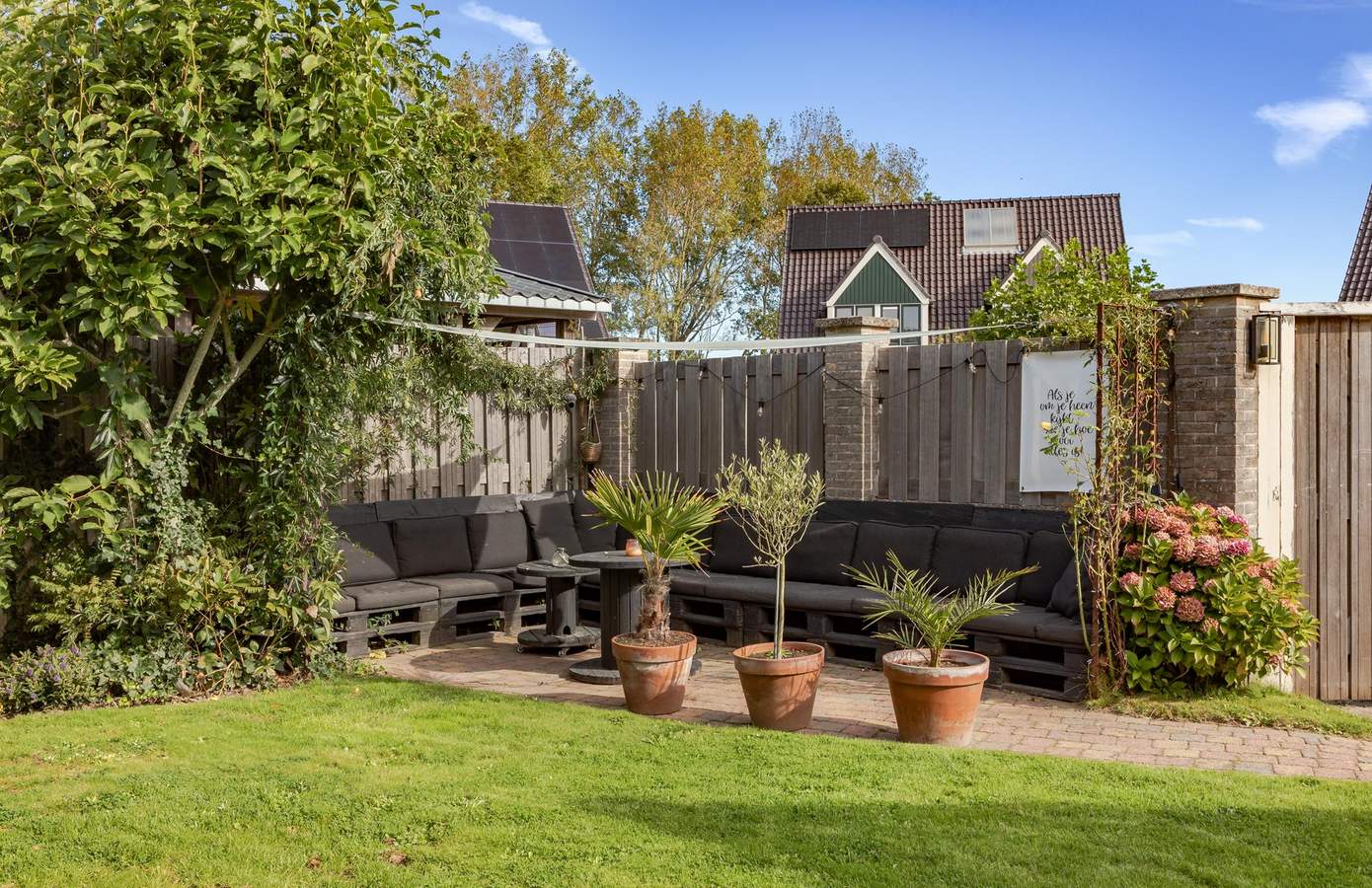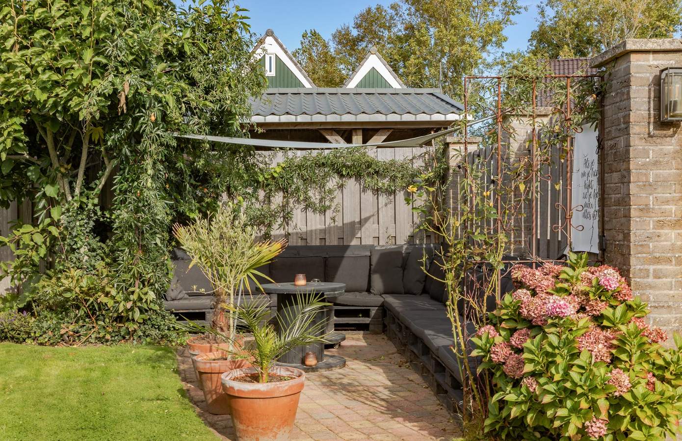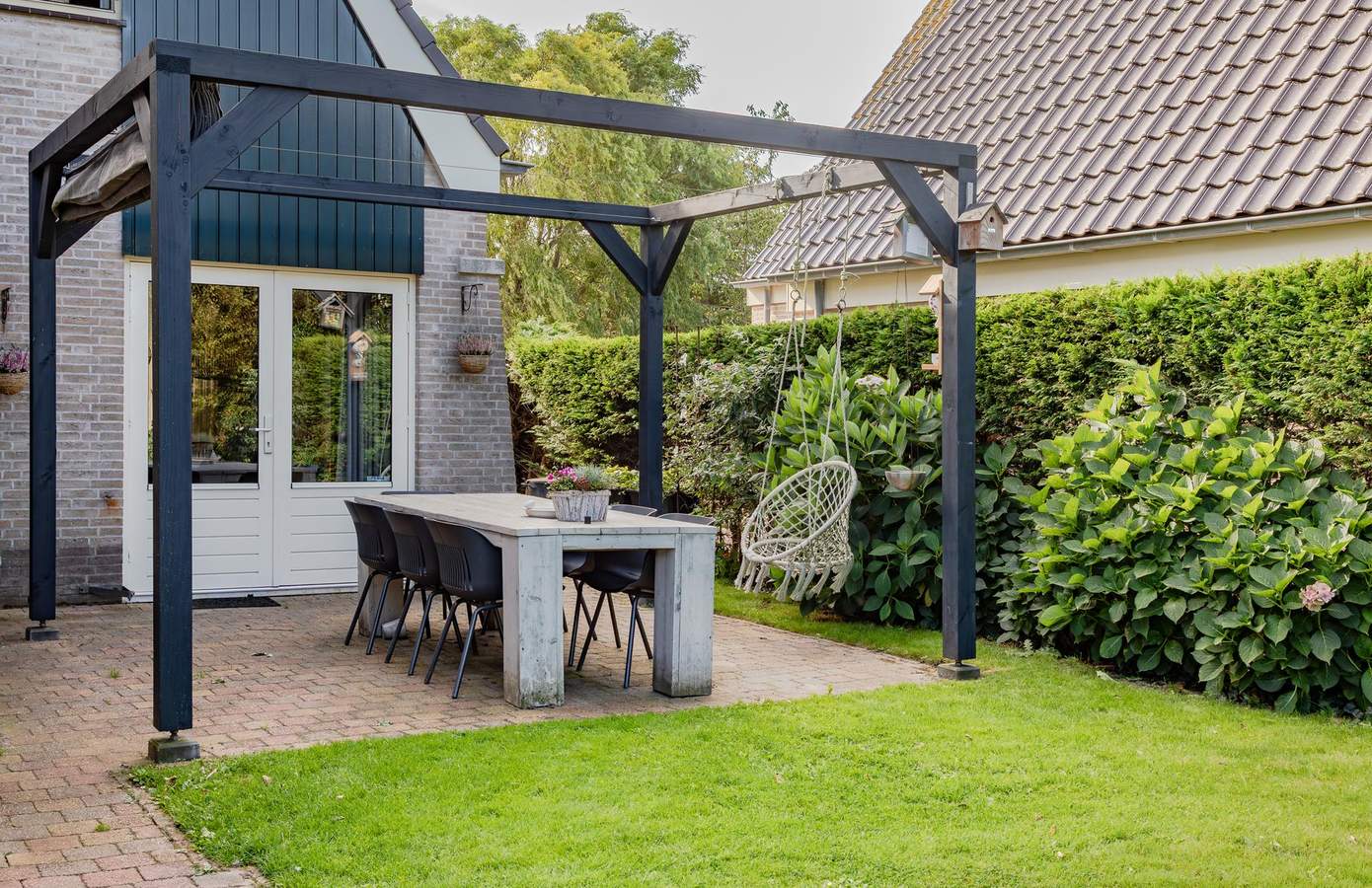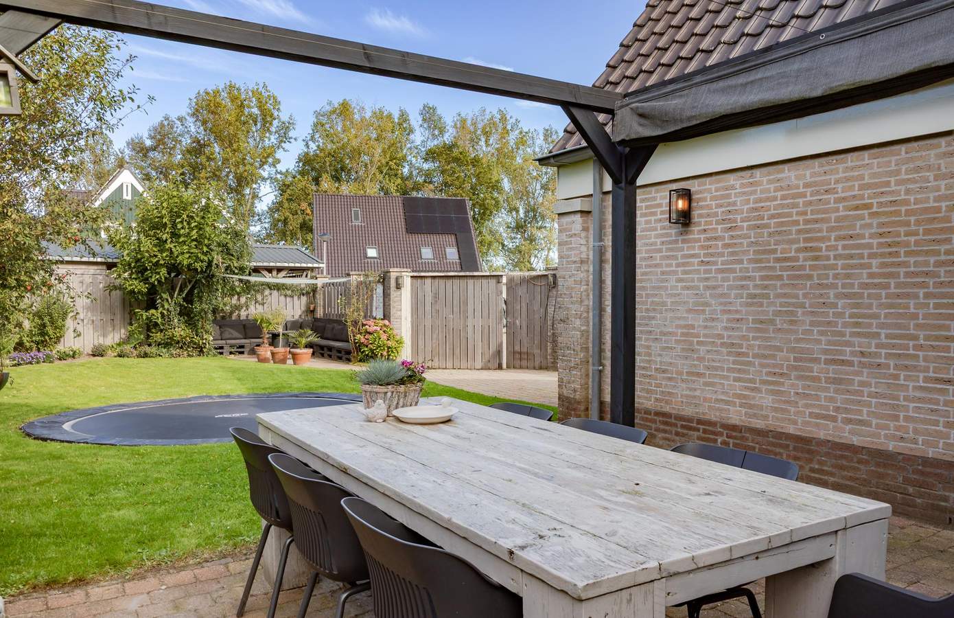 De voortuin is in 2024 volledig vernieuwd en verzorgd aangelegd. De inpandige garage biedt niet alleen extra bergruimte, maar kan ook uitstekend dienen als hobby- of werkruimte. De achtertuin is sfeervol ingericht en biedt volop mogelijkheden om te ontspannen en te genieten. Achterin de tuin vindt u een gezellige zithoek met palletbank en een op maat gemaakt schaduwdoek. Daarnaast is er een terras met pergola en schaduwdoek, waar u ook op warme dagen heerlijk beschut kunt zitten. Hier geniet u de hele dag door van zon én privacy, een ideale plek om te tuinieren, te spelen of lange zomeravonden door te brengen met vrienden en familie.