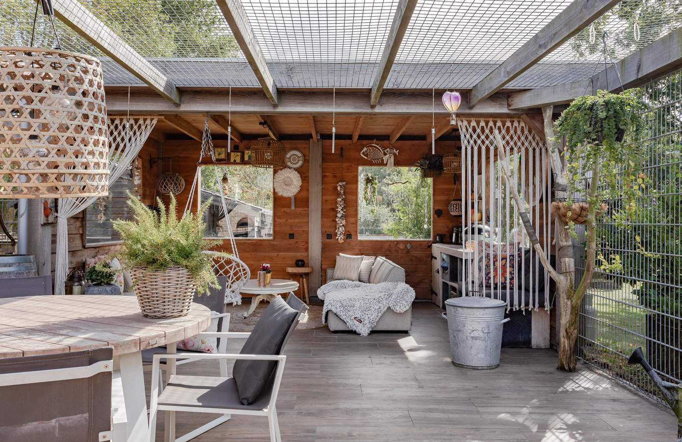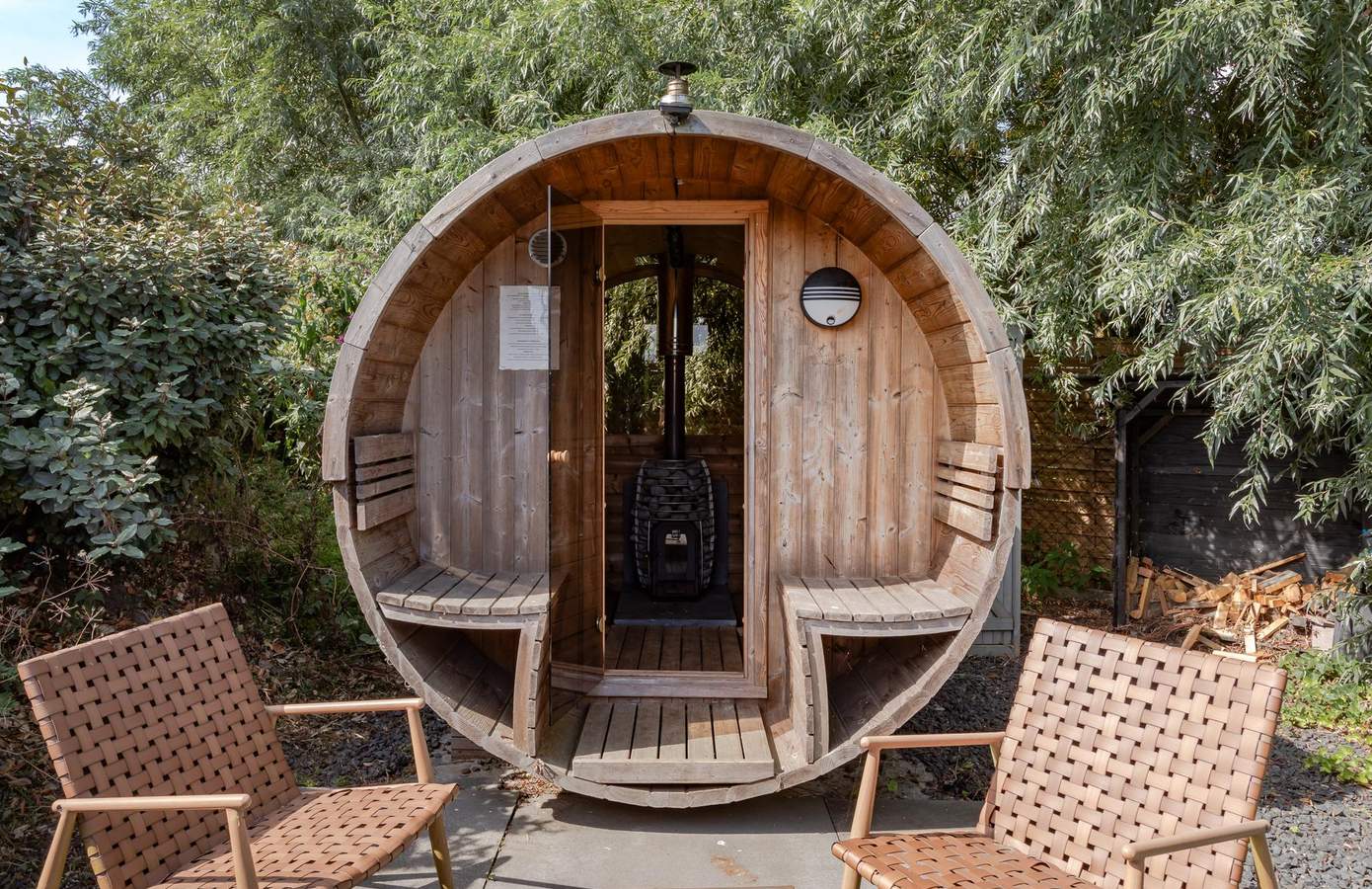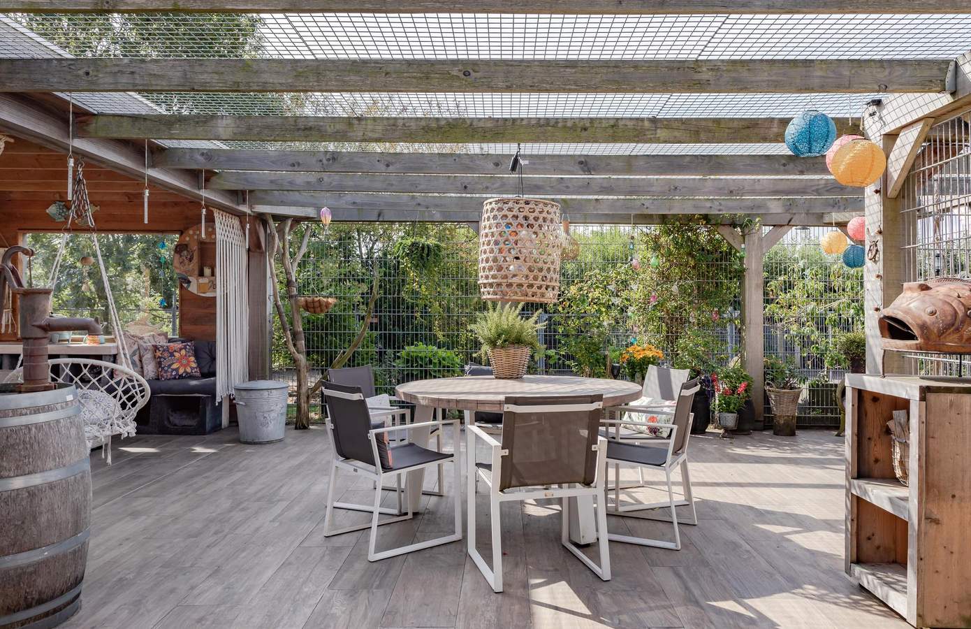 Het buitenterrein van deze woning is een waar paradijs voor wie houdt van ruimte, natuur en het buitenleven. Rondom het huis vindt u verschillende zit- en loungeplekken, waaronder een royale overkapping met ruimte voor een grote eettafel en een sfeervolle loungehoek. Voor dierenliefhebbers biedt dit erf alles wat u zich maar kunt wensen. De zeer ruime kavel is ideaal ingericht voor het houden van paarden en andere dieren. Zo is er een paardenrijbak aanwezig en een stal geschikt voor twee paarden, maar ook diverse voorzieningen voor het houden van kleinvee. Daarnaast leent de tuin zich uitstekend om een deel in te richten als siertuin, terwijl er tegelijkertijd plek genoeg is om te tuinieren of groenten en fruit te verbouwen. Een bijzonder element van dit erf is de eigen wellnessruimte, hier komt ontspanning samen met luxe. U beschikt over een Fins hout gestookte sauna en een emmerdouche, waardoor u het ultieme wellness gevoel ervaart in uw eigen tuin. Het geheel ligt beschut tussen het groen, waardoor u optimale privacy ervaart en tegelijkertijd verbonden blijft met het weidse Noord-Hollandse landschap.