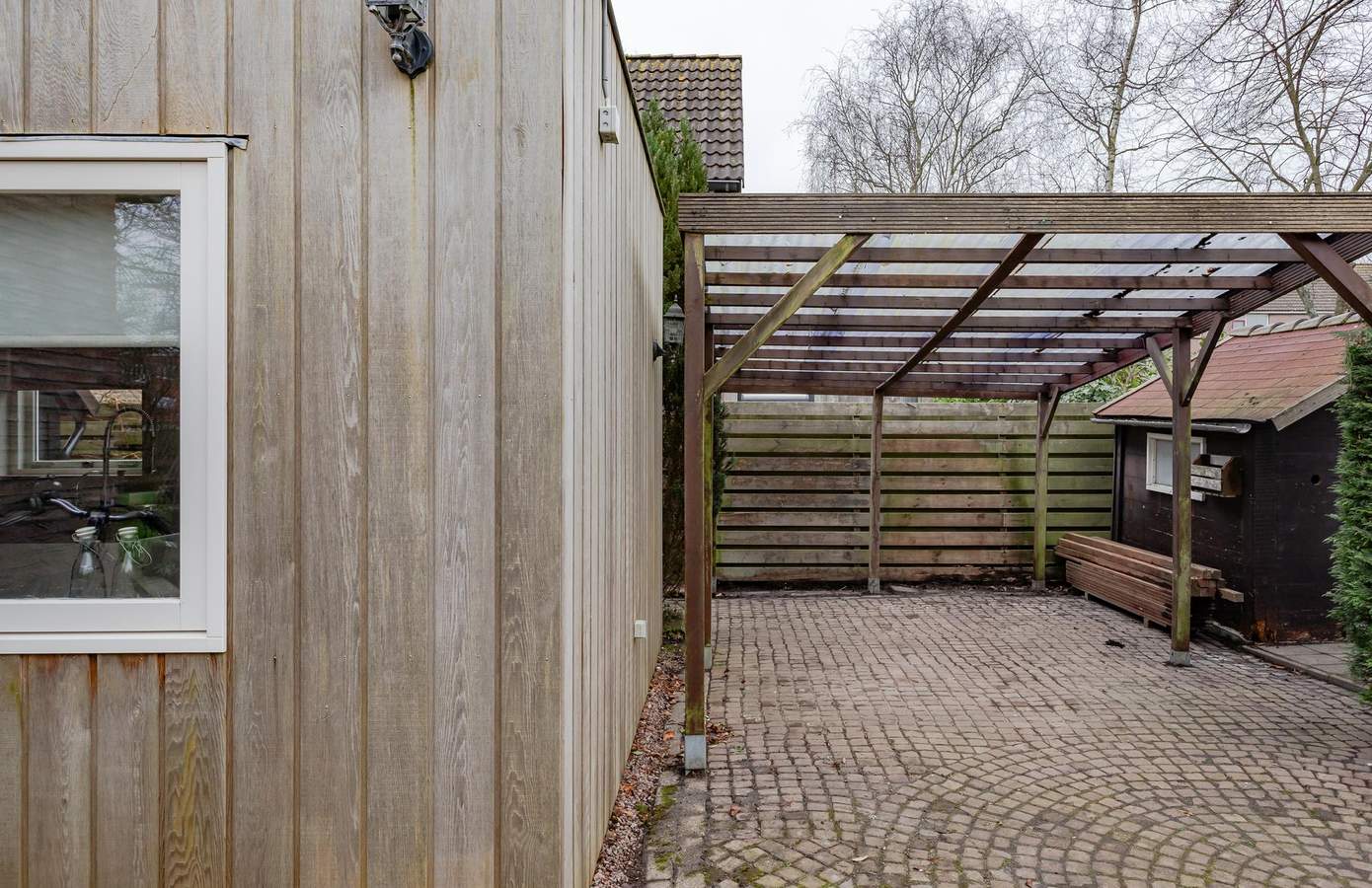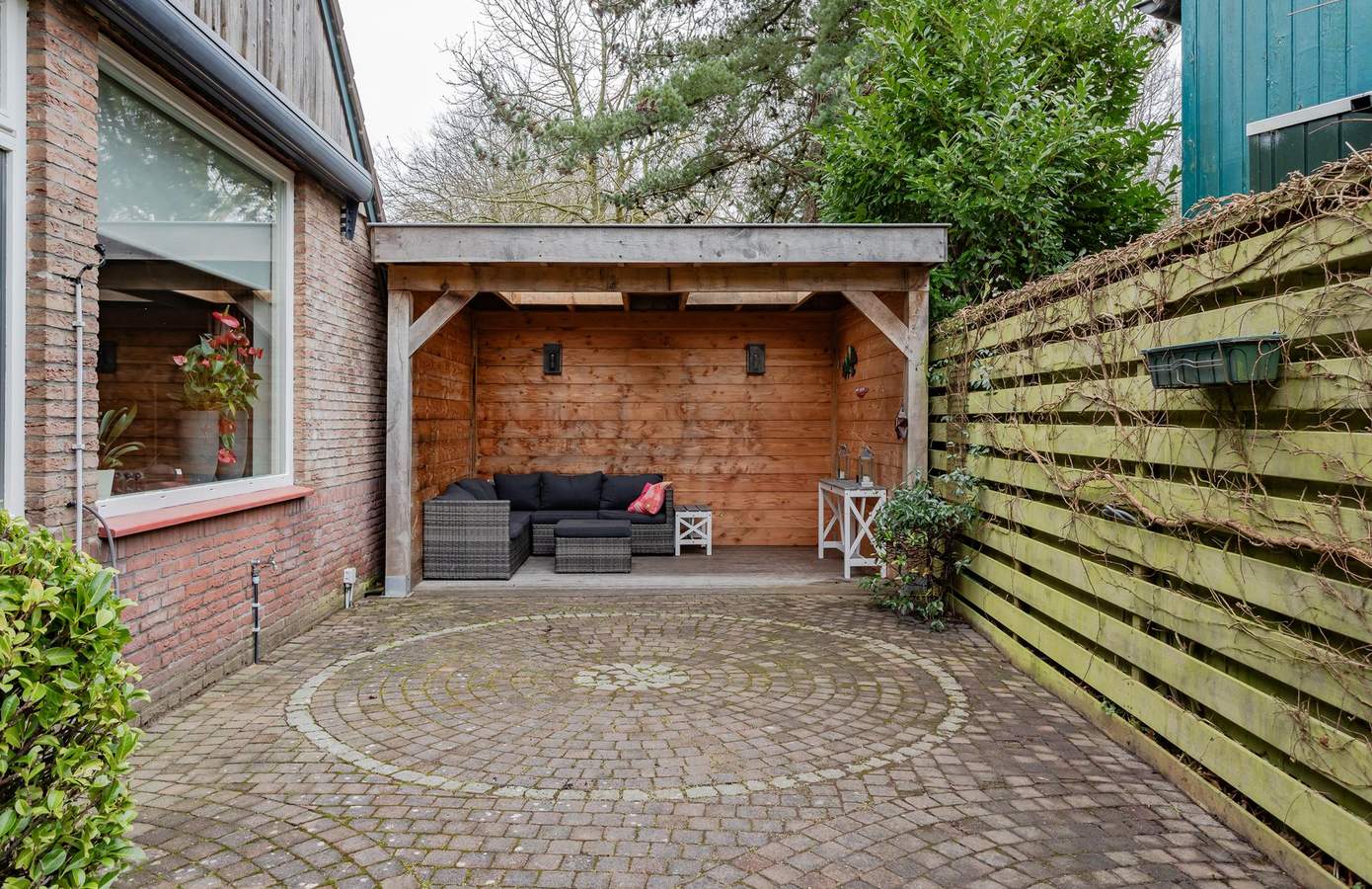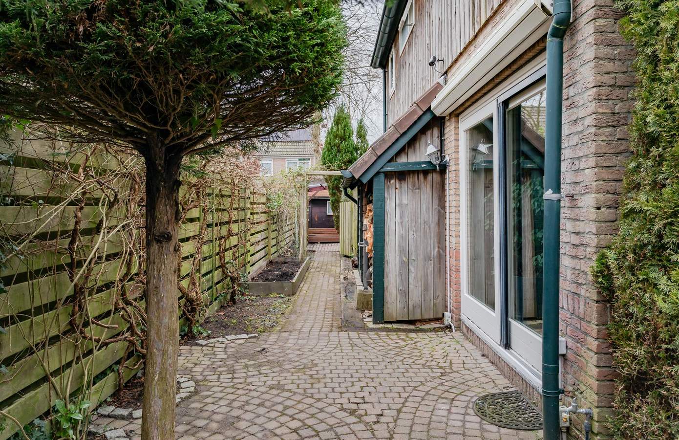 De tuin is rondom de woning gelegen en heeft een overdekte zithoek op het zuidwesten om heerlijk van het zonnetje te genieten. Verder is er een tuinschuurtje aanwezig en een carport. Het is dus mogelijk om de auto op eigen terrein te parkeren, maar er is ook voldoende parkeerplaats in de wijk. Het tuinhek van de voortuin is gemaakt van originele ankerkettingen en de windvaan op het dak van de woning is een schip. Beiden verwijzen naar water, wat ook in de straatnaam en in de omgeving veel terugkomt.