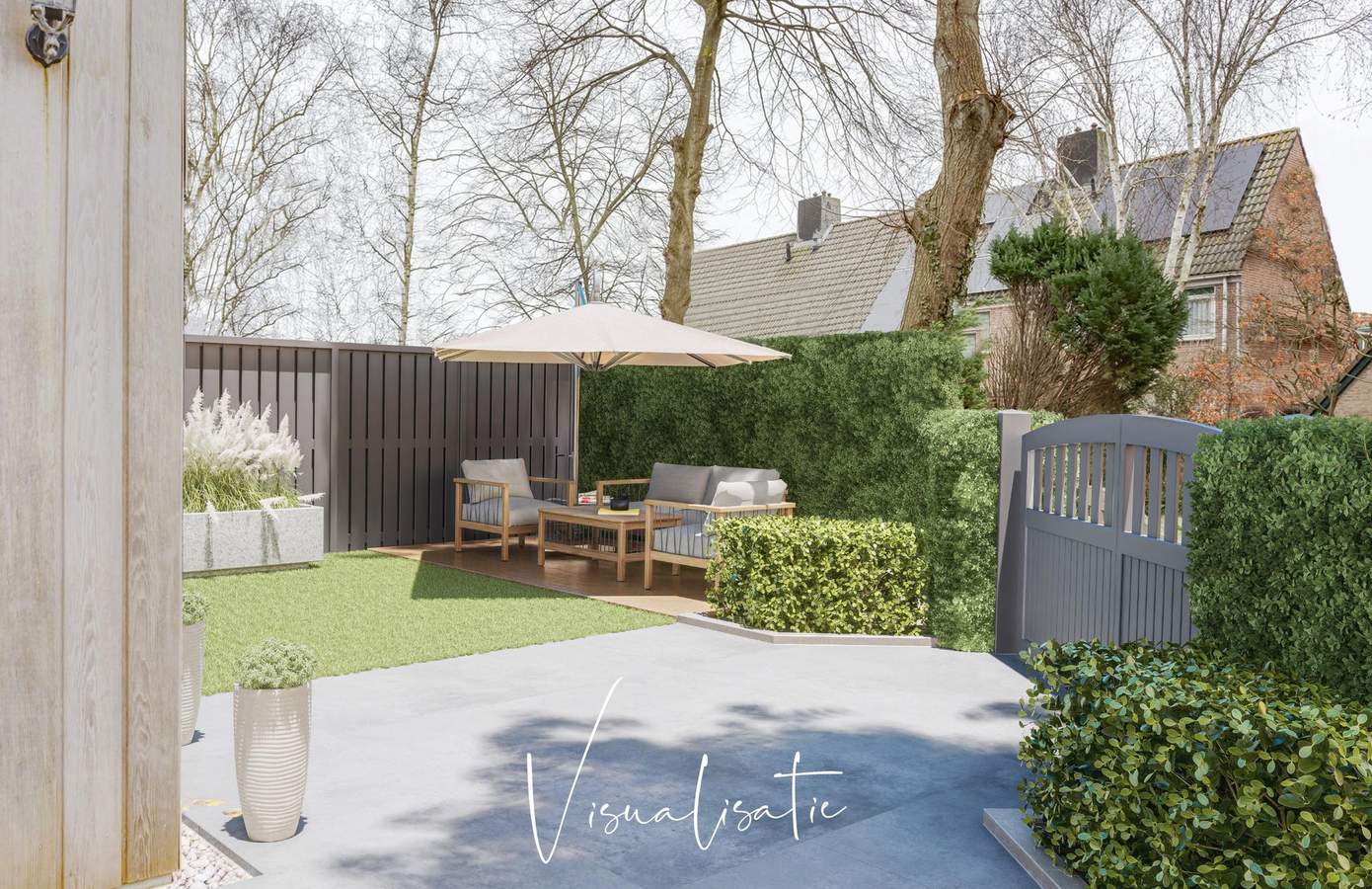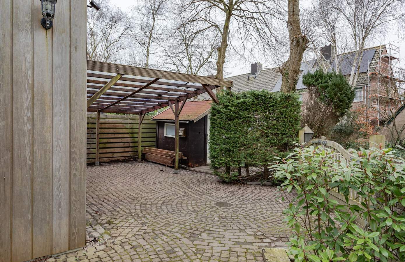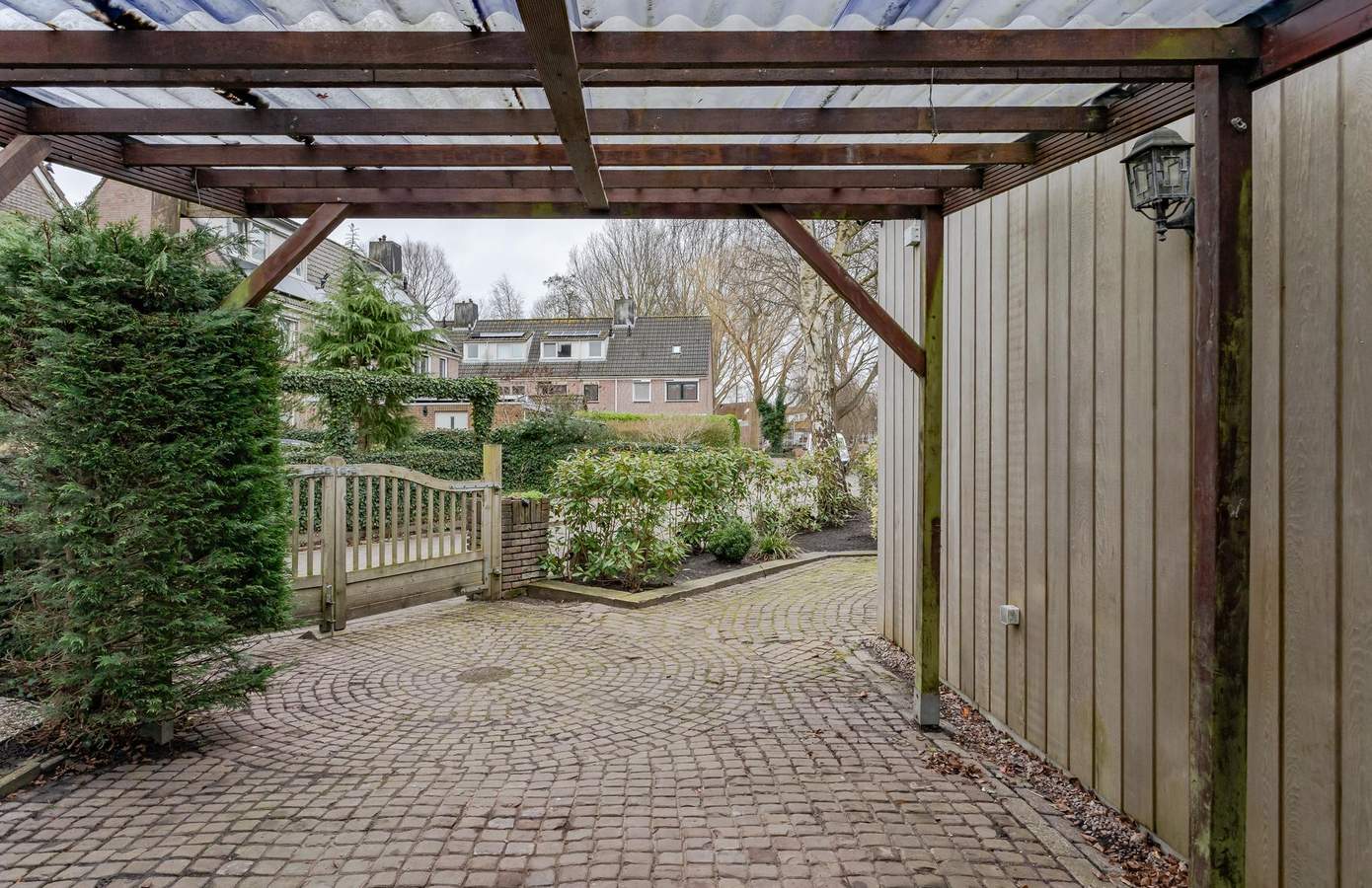 De tuin is rondom de woning gelegen en heeft een overdekte zithoek op het zuidwesten om heerlijk van het zonnetje te genieten. Verder is er een tuinschuurtje aanwezig en een carport. Het is dus mogelijk om de auto op eigen terrein te parkeren, maar er is ook voldoende parkeerplaats in de wijk. Het tuinhek van de voortuin is gemaakt van originele ankerkettingen en de windvaan op het dak van de woning is een schip. Beiden verwijzen naar water, wat ook in de straatnaam en in de omgeving veel terugkomt.
