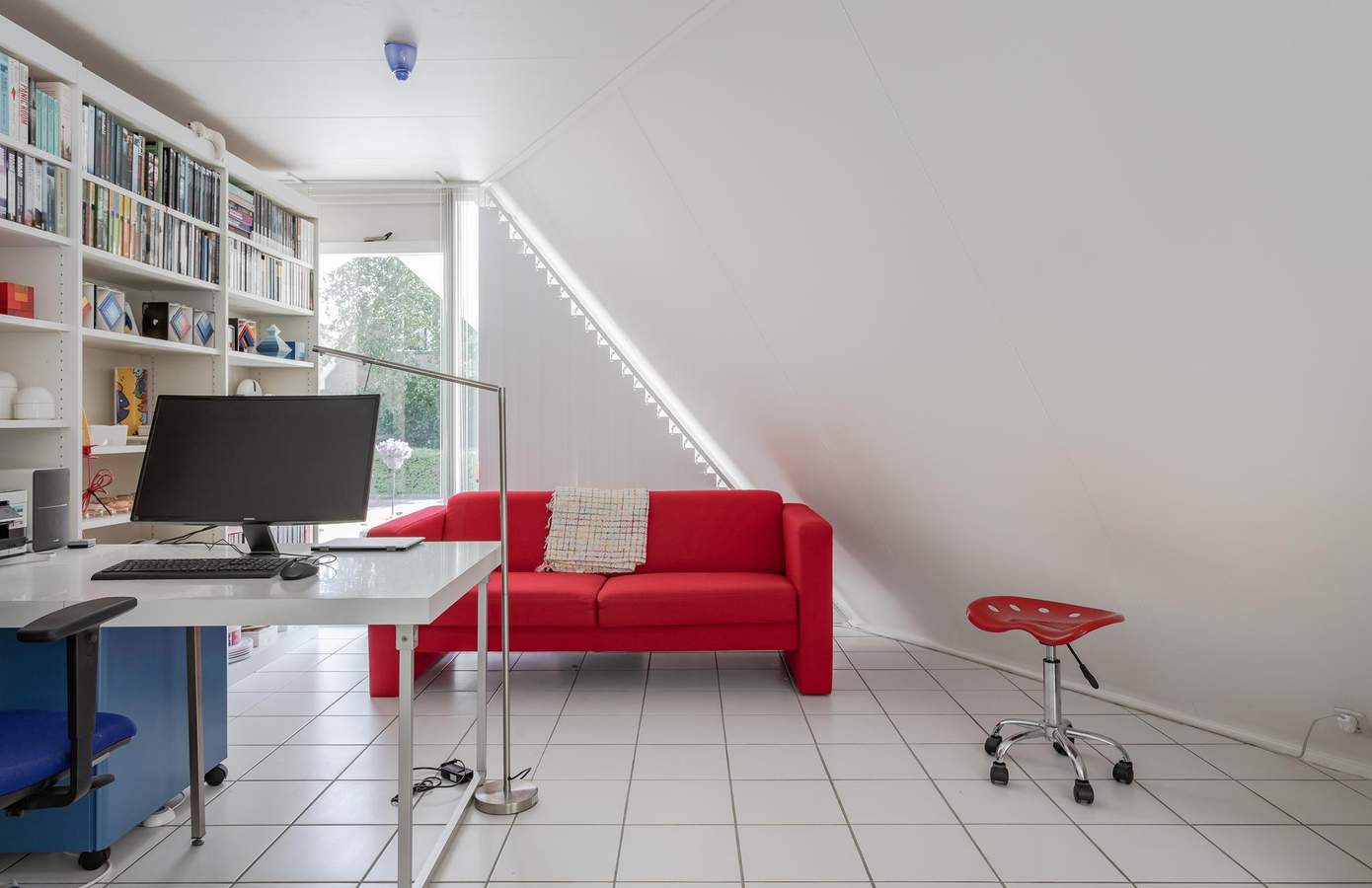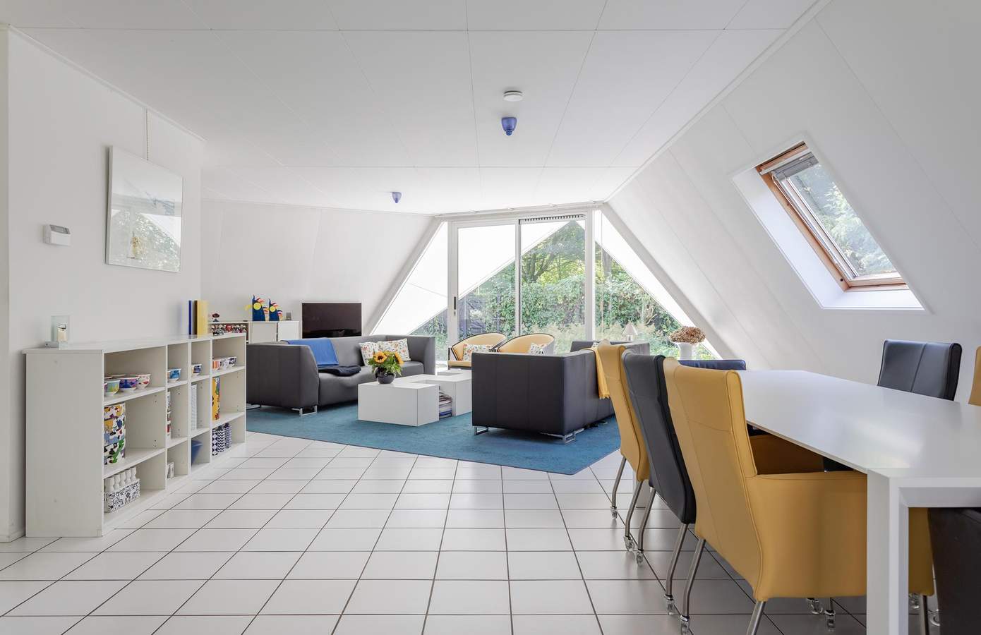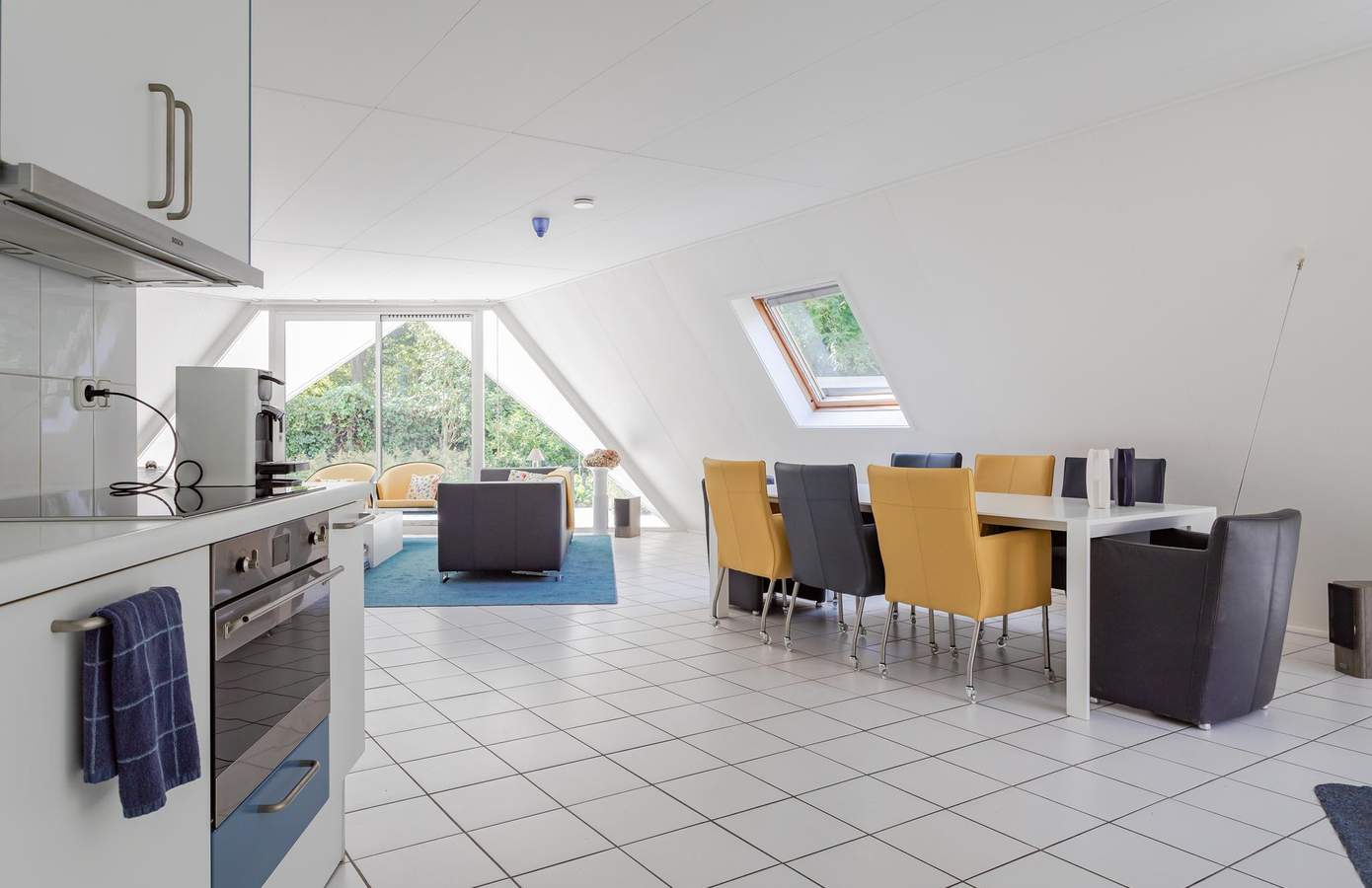 Aan de woonkamer grenst een extra ruimte met een badkamer op de begane grond. Momenteel in gebruik als een open kantoor, kan deze ruimte eenvoudig worden omgebouwd tot een extra slaapkamer met eigen badkamer, waardoor gelijkvloers wonen mogelijk wordt. De keuken is uitgerust met inbouwapparatuur en heeft een deur in de glazen pui die toegang biedt tot de tuin, wat de verbinding tussen binnen en buiten versterkt. De gehele begane grond is voorzien van zowel vloerverwarming als luchtverwarming, wat zorgt voor een aangenaam binnenklimaat.