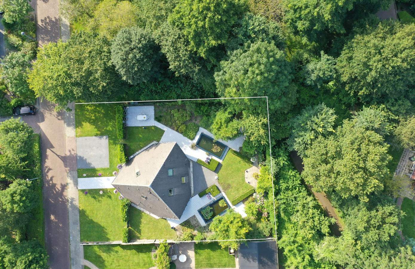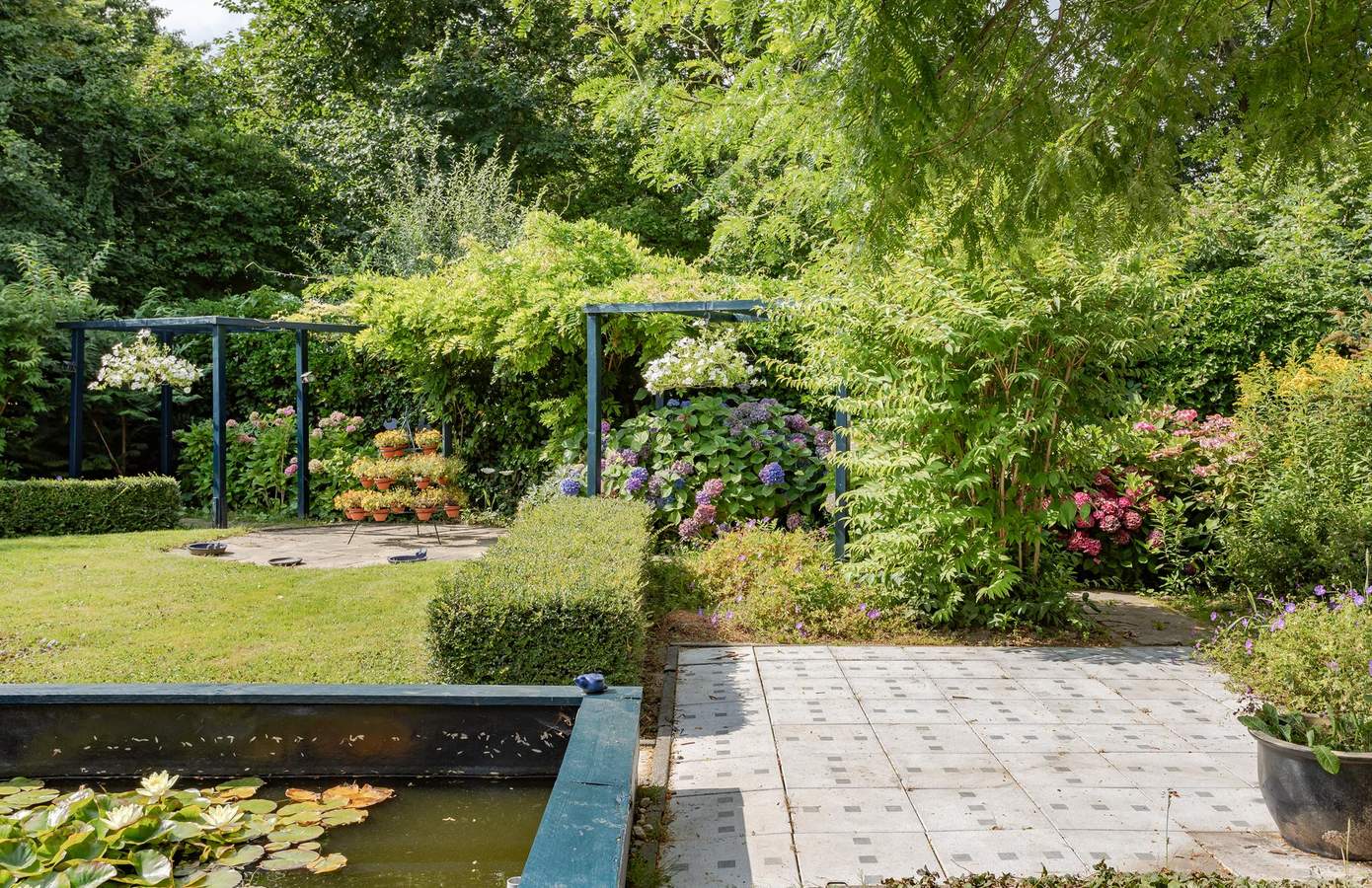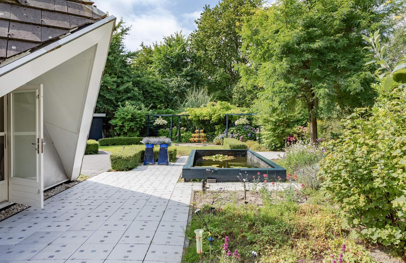 Rondom de woning ligt een verzorgde tuin met fraaie beplanting, een gazon en diverse terrassen. Het perceel is omsloten door volwassen groen, wat een prachtig parkachtig gevoel geeft. In de tuin bevinden zich aan weerszijden twee vijvers die een thuis bieden aan vissen en waterplanten. De verschillende terrassen en zitjes bieden u de mogelijkheid om zowel van de zon als van de schaduw te genieten. Dankzij de ligging aan het park heeft u volop privacy en kunt u genieten van de rust en het geluid van de vogels. Deze idyllische tuin is een perfecte plek om te ontspannen en te genieten van de natuur.