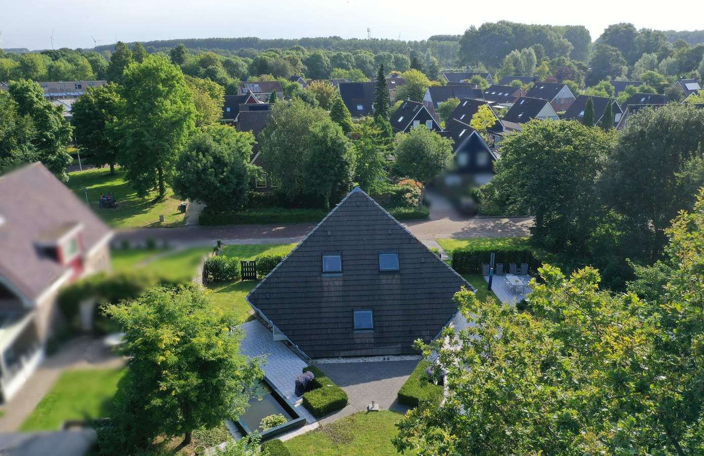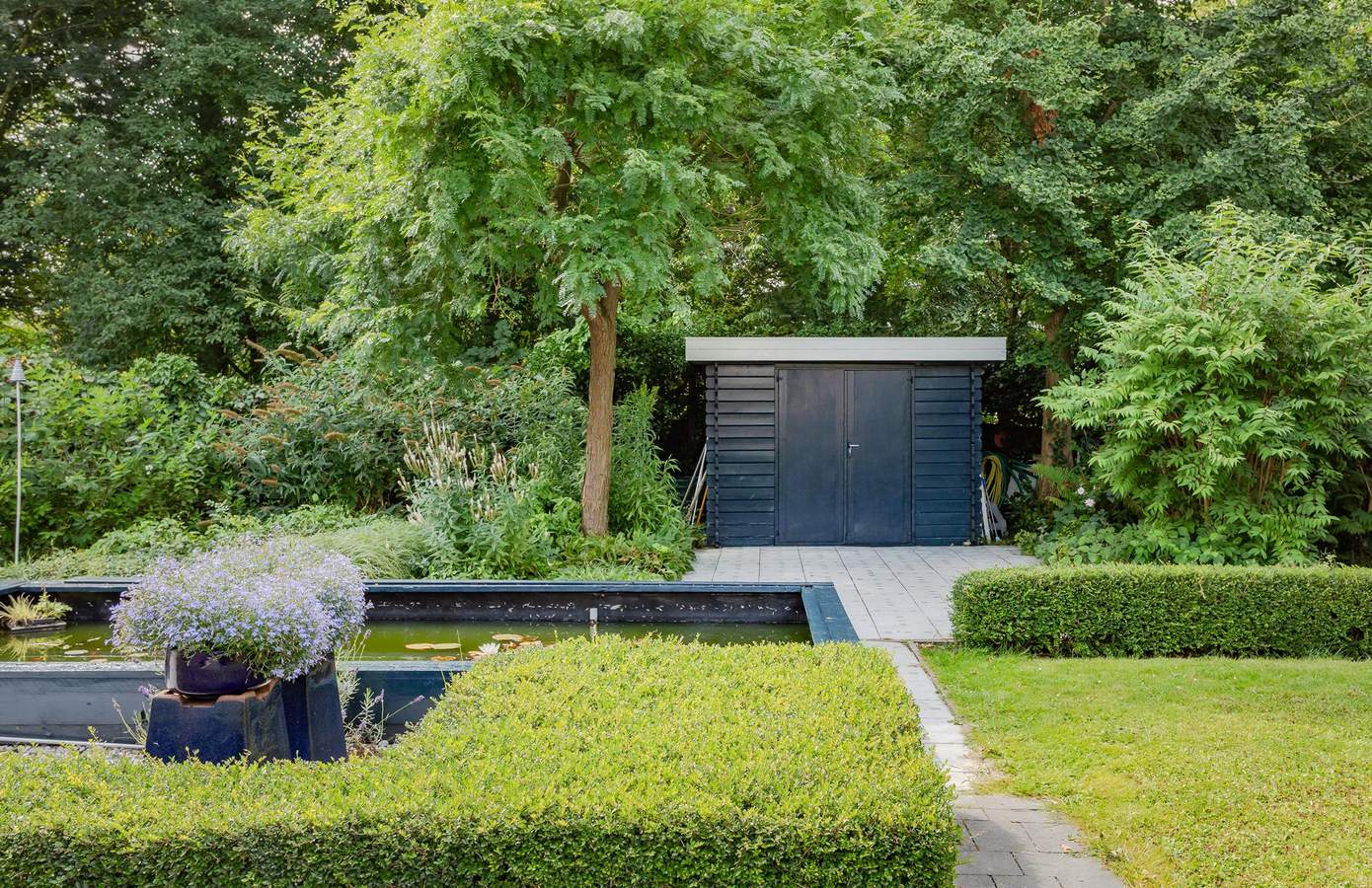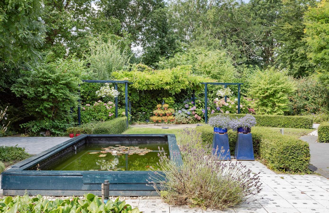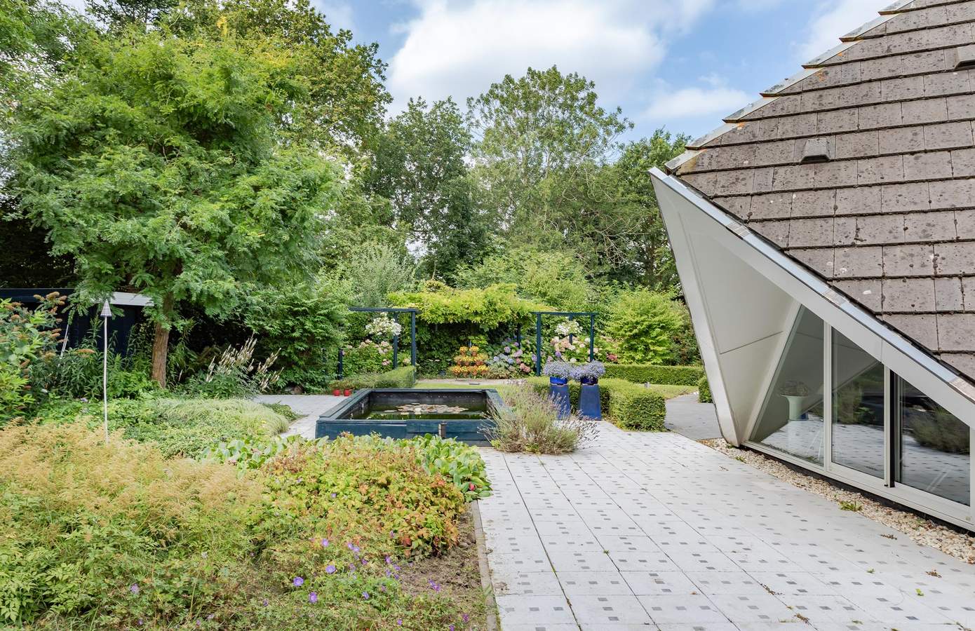 Rondom de woning ligt een verzorgde tuin met fraaie beplanting, een gazon en diverse terrassen. Het perceel is omsloten door volwassen groen, wat een prachtig parkachtig gevoel geeft. In de tuin bevinden zich aan weerszijden twee vijvers die een thuis bieden aan vissen en waterplanten. De verschillende terrassen en zitjes bieden u de mogelijkheid om zowel van de zon als van de schaduw te genieten. Dankzij de ligging aan het park heeft u volop privacy en kunt u genieten van de rust en het geluid van de vogels. Deze idyllische tuin is een perfecte plek om te ontspannen en te genieten van de natuur.