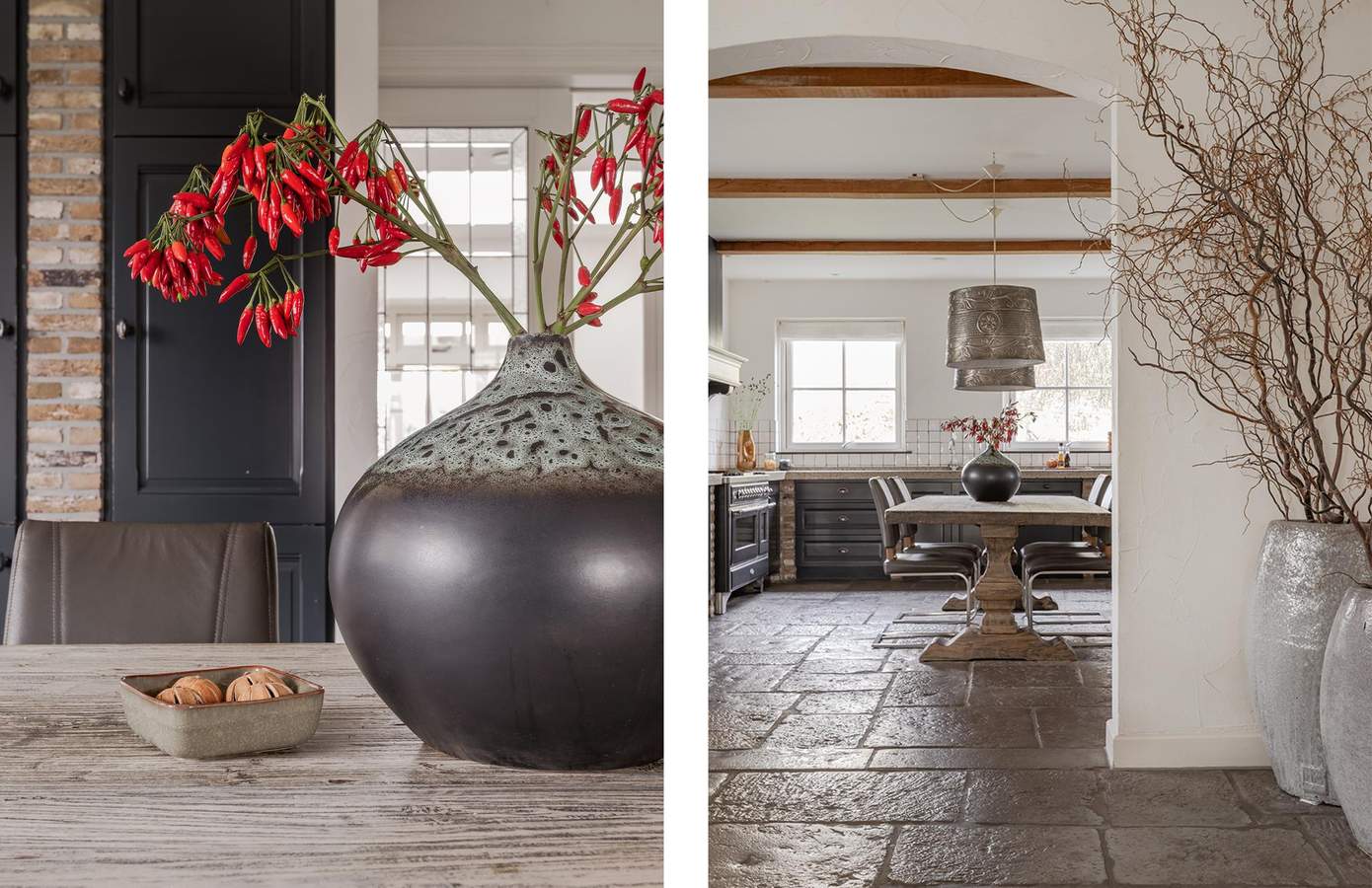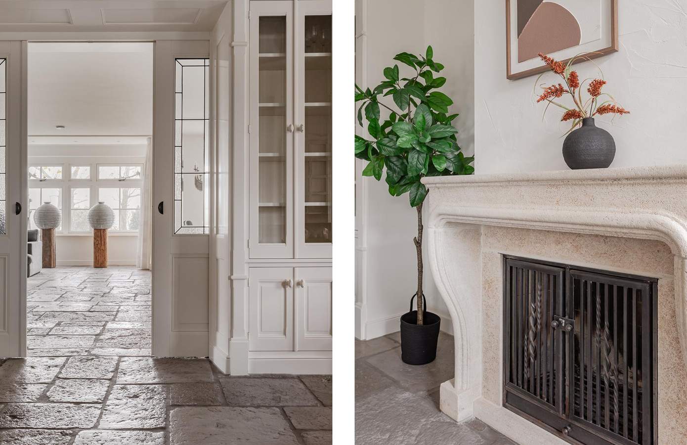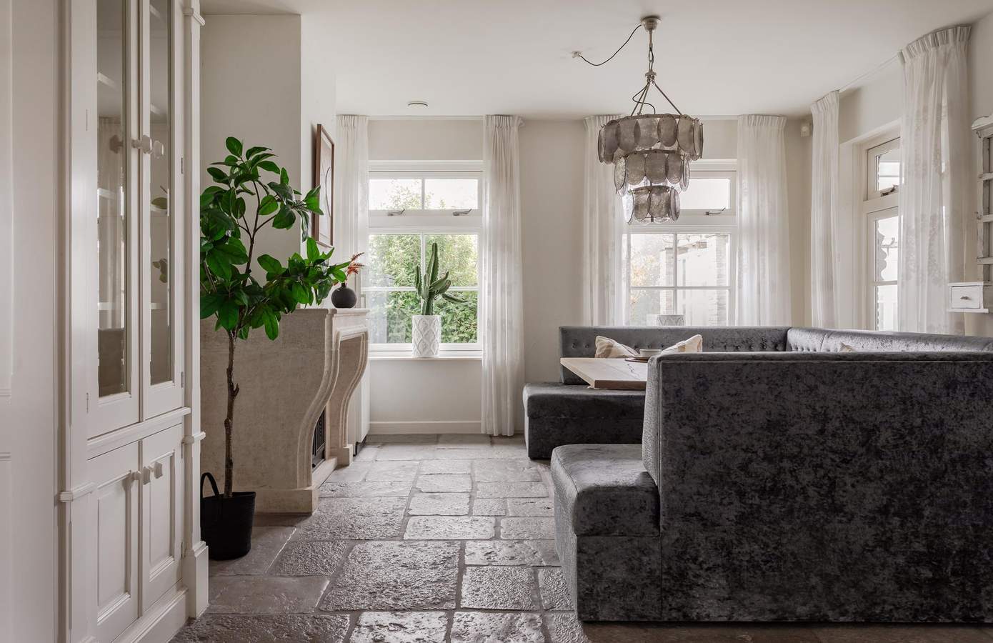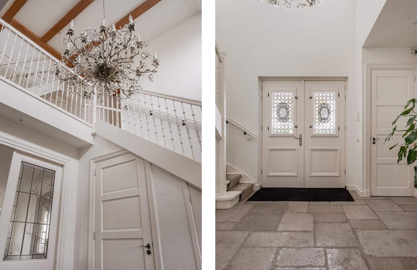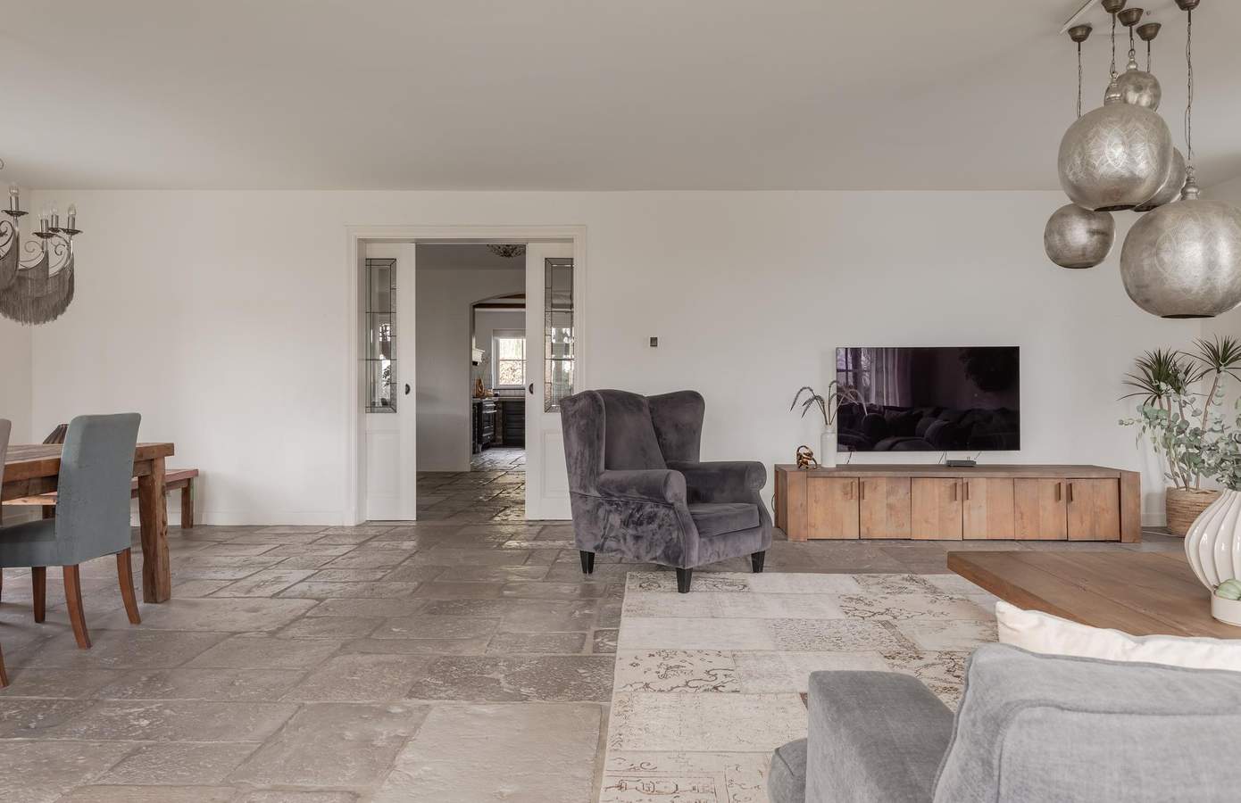 De woning verwelkomt u met een royale hal met vide en dubbele deuren naar de leefruimtes. De living van ruim 60 m² biedt volop licht, sfeer en uitzicht op de tuin, terwijl de aparte zitkamer met open haard perfect is voor knusse avonden. De royale woonkeuken is volledig uitgerust met onder meer een Boretti fornuis, terrazzo aanrechtblad, Quooker, dubbele koelkast en openslaande deuren naar de veranda. Aangrenzend aan de keuken is er nog een aparte ruimte die bereikbaar is met en suite deuren, deze ruimte kan worden ingericht als eetkamer of als kantoor. Via de gang bereikt u het ‘bijgebouw, hier vindt u een bar/keuken en een kantoorruimte met openslaande deuren naar de tuin.