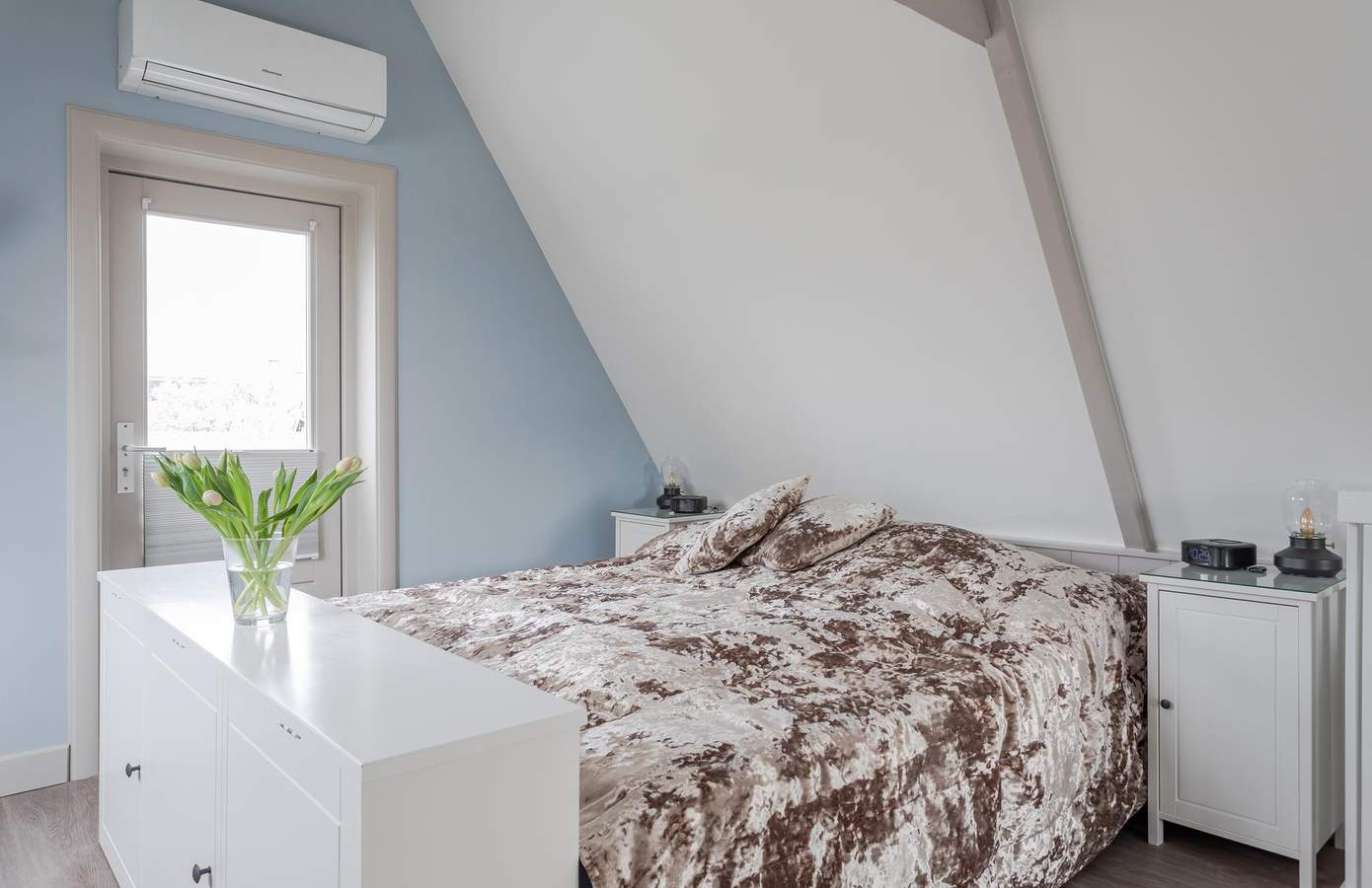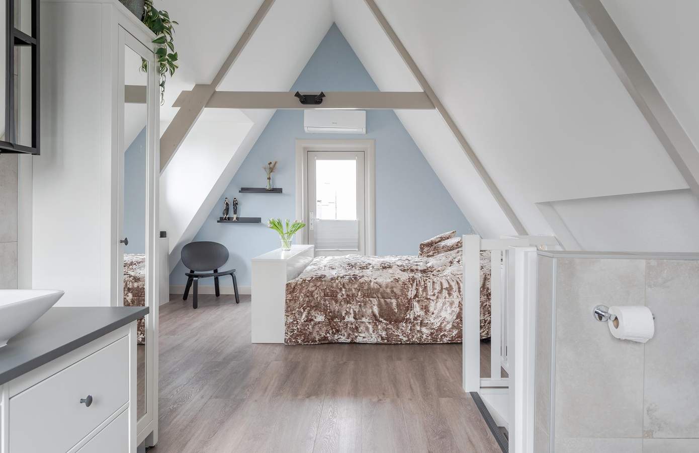 Vanuit de sfeervolle woonkamer kijkt u uit over de levendige Dorpsstraat, een dorps uitzicht dat nooit verveelt. Binnen zorgt de sfeervolle gashaard voor een warme, uitnodigende sfeer. De royale boerenleefkeuken is een absolute eyecatcher en vormt het kloppend hart van de woning. Hier wordt gekookt, gepraat en geleefd. Op de verdieping wacht een stijlvolle slaapkamer in loftstijl, waar comfort en karakter hand in hand gaan. De ruimte heeft airconditioning (voor zowel koelen als verwarmen) en beschikt over een toilet, wastafel en een ruime inloopdouche. De originele houten balken, prachtig in het zicht gelaten, geven de kamer een warme en authentieke uitstraling.