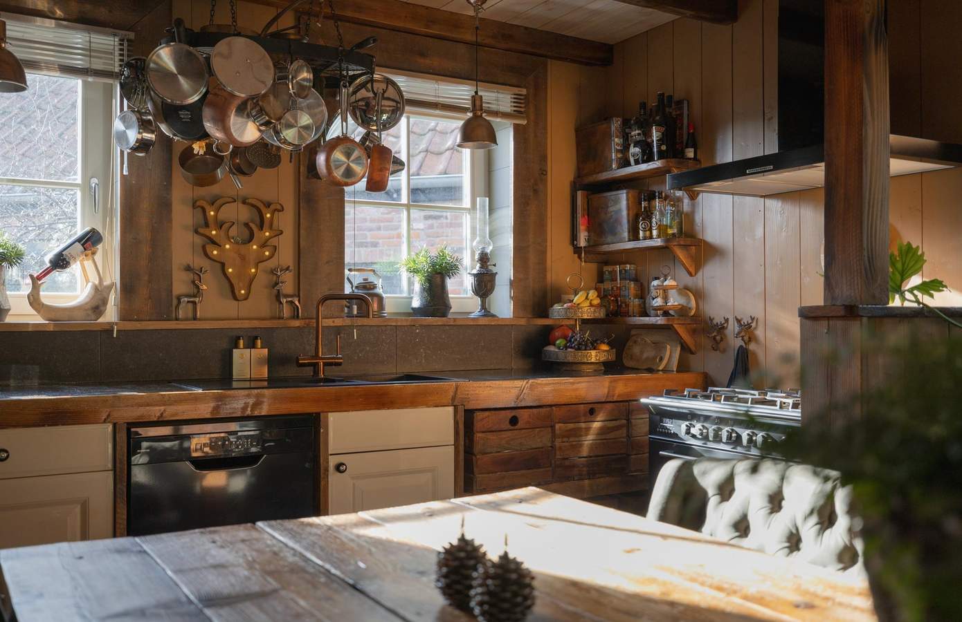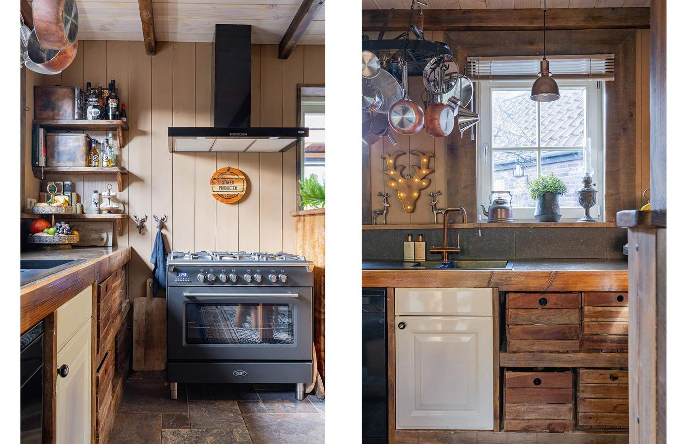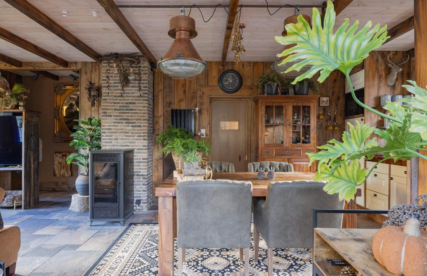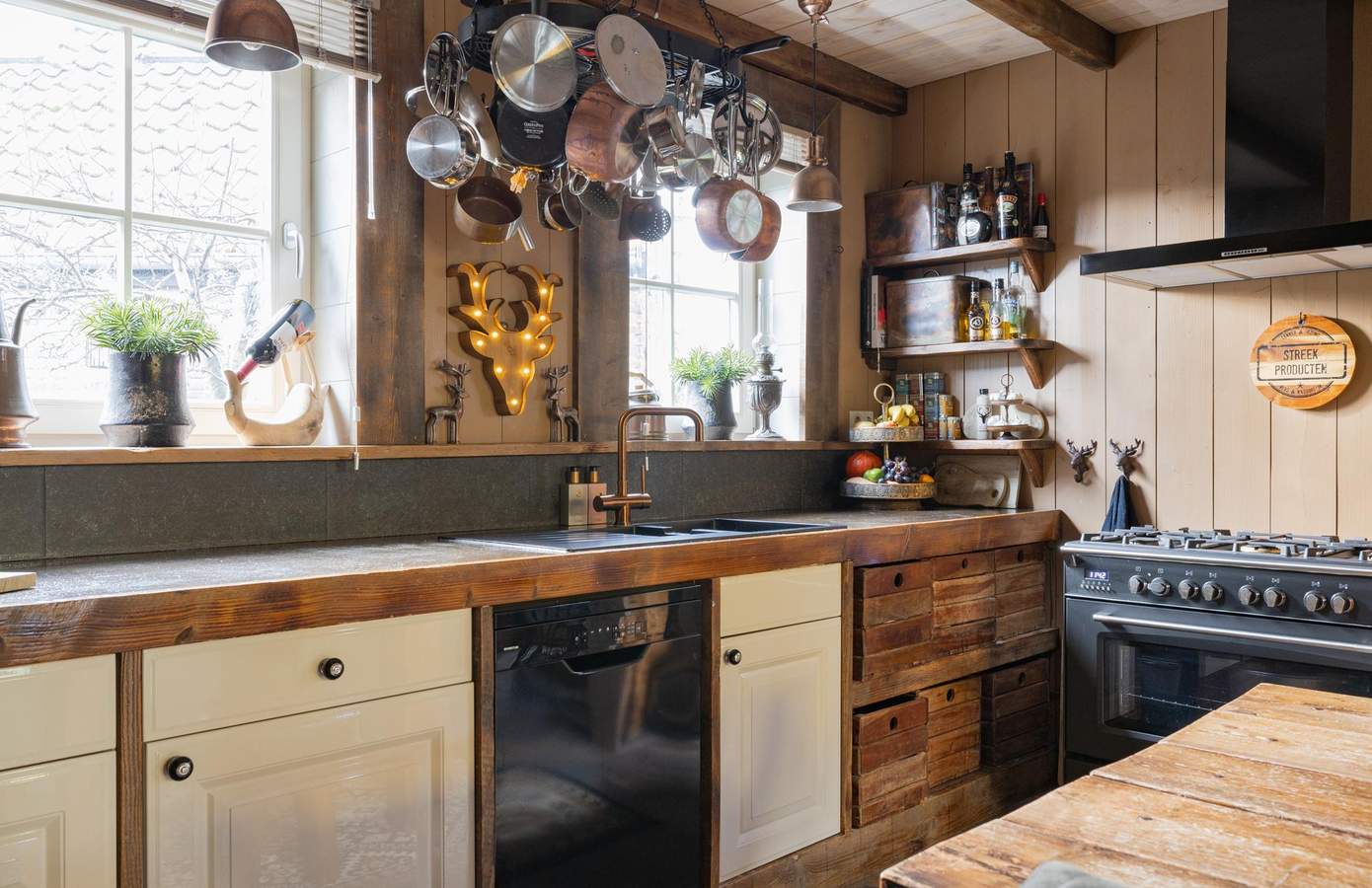 Zodra u de woning binnenstapt, wordt u direct omarmd door warmte, karakter en nostalgie. De houten wanden, zichtbare balken en stijlvolle details creëren een sfeer die tegelijk authentiek en comfortabel aanvoelt. De woonkamer heeft een knusse zithoek rond de houtkachel, grote ramen met zicht op de straat en een harmonieus samenspel van natuurlijke materialen die rust uitstralen. De keuken is ambachtelijk ingericht met houten fronten, een Boretti-fornuis en een robuuste spoelbak. Koperen details, een stoere eettafel en hangende pottenrekken geven het geheel een landelijke, Bourgondische uitstraling.