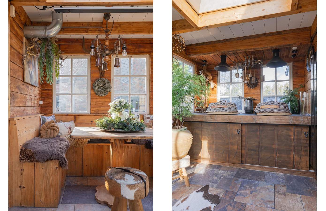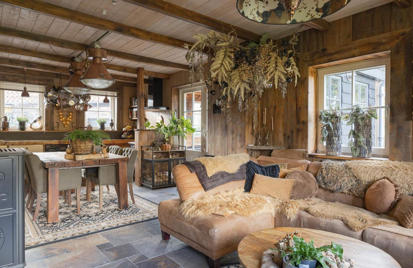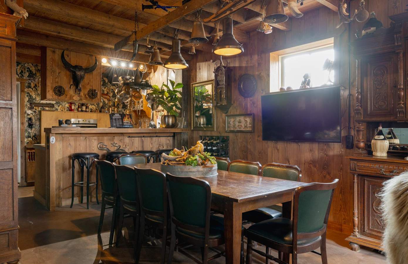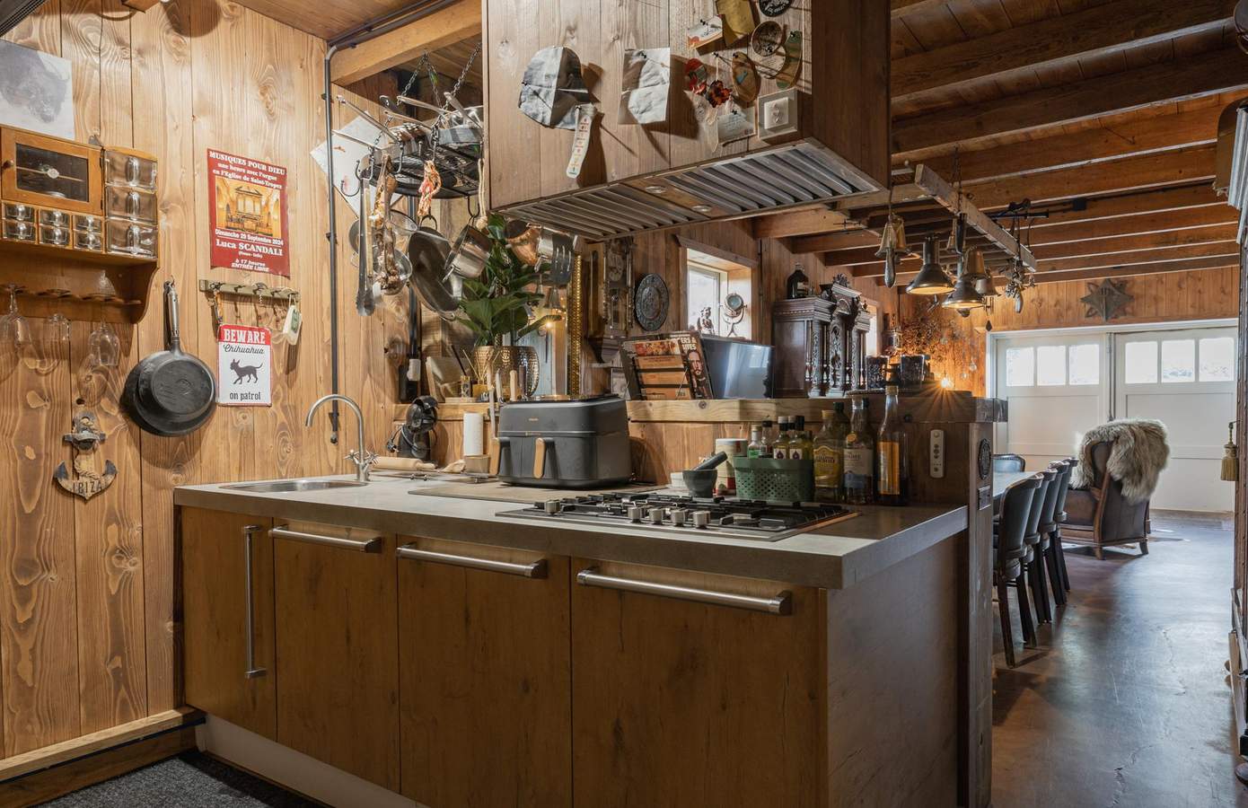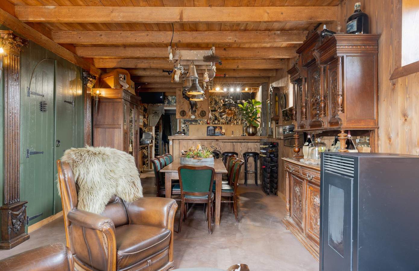 Zodra u de woning binnenstapt, wordt u direct omarmd door warmte, karakter en nostalgie. De houten wanden, zichtbare balken en stijlvolle details creëren een sfeer die tegelijk authentiek en comfortabel aanvoelt. De woonkamer heeft een knusse zithoek rond de houtkachel, grote ramen met zicht op de straat en een harmonieus samenspel van natuurlijke materialen die rust uitstralen. De keuken is ambachtelijk ingericht met houten fronten, een Boretti-fornuis en een robuuste spoelbak. Koperen details, een stoere eettafel en hangende pottenrekken geven het geheel een landelijke, Bourgondische uitstraling.