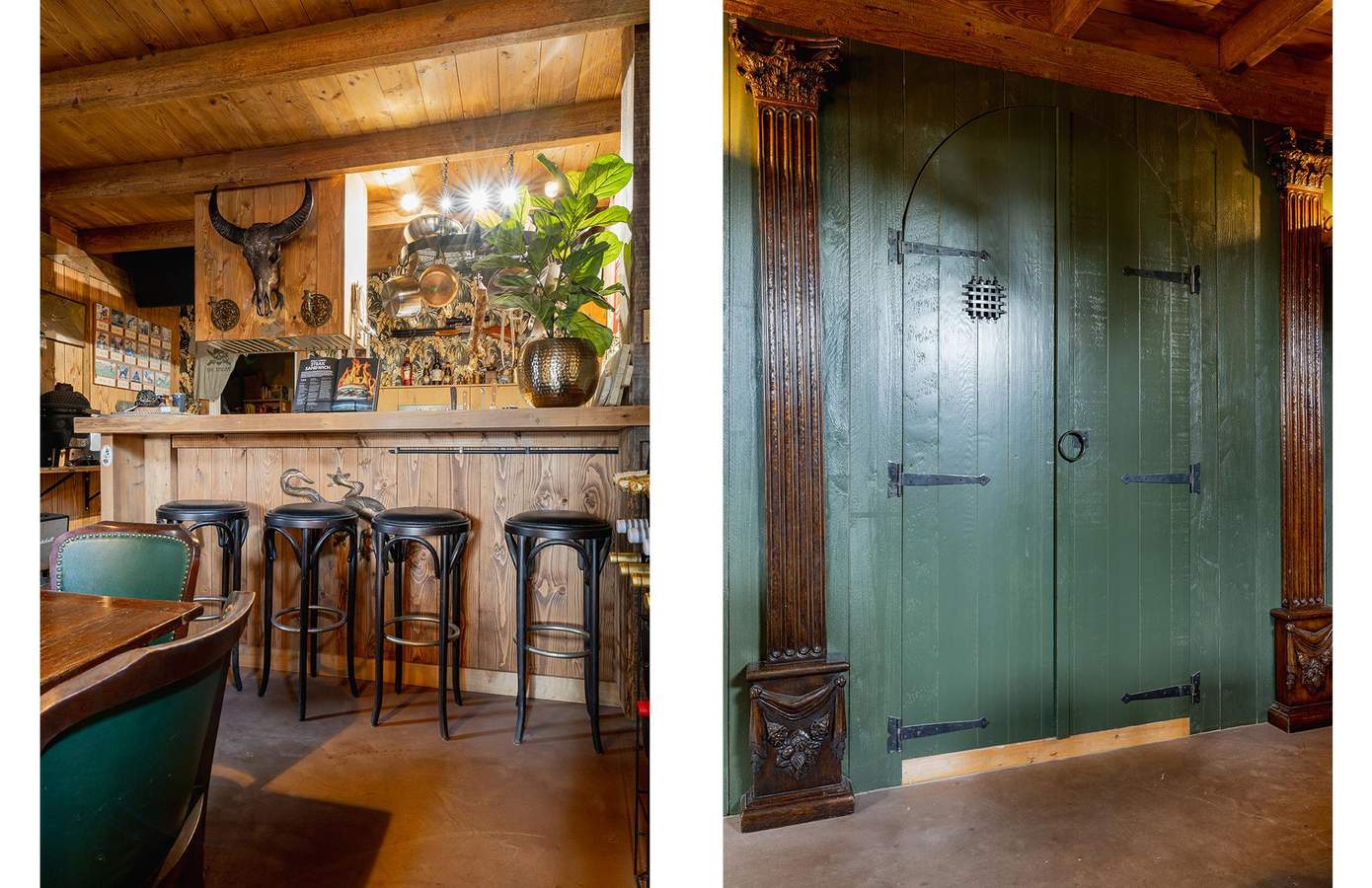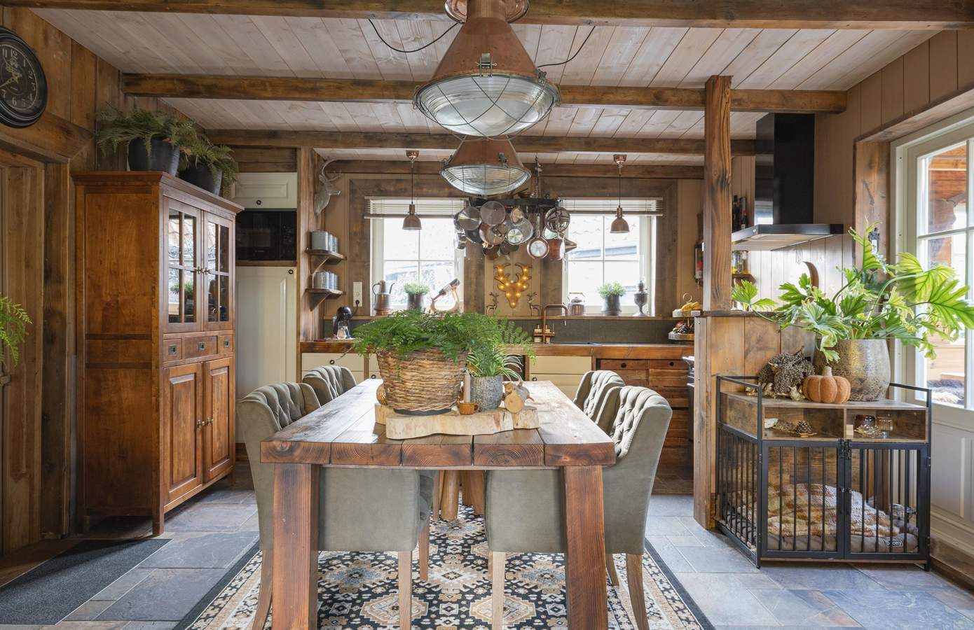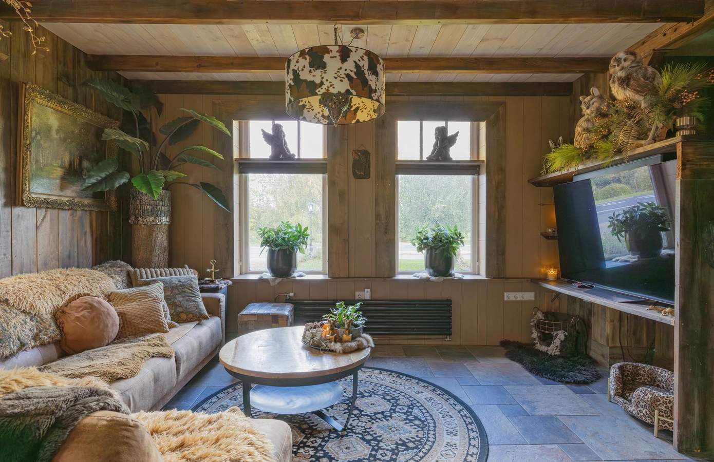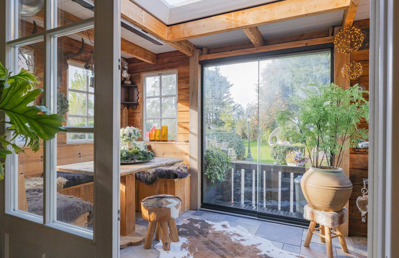 Zodra u de woning binnenstapt, wordt u direct omarmd door warmte, karakter en nostalgie. De houten wanden, zichtbare balken en stijlvolle details creëren een sfeer die tegelijk authentiek en comfortabel aanvoelt. De woonkamer heeft een knusse zithoek rond de houtkachel, grote ramen met zicht op de straat en een harmonieus samenspel van natuurlijke materialen die rust uitstralen. De keuken is ambachtelijk ingericht met houten fronten, een Boretti-fornuis en een robuuste spoelbak. Koperen details, een stoere eettafel en hangende pottenrekken geven het geheel een landelijke, Bourgondische uitstraling.