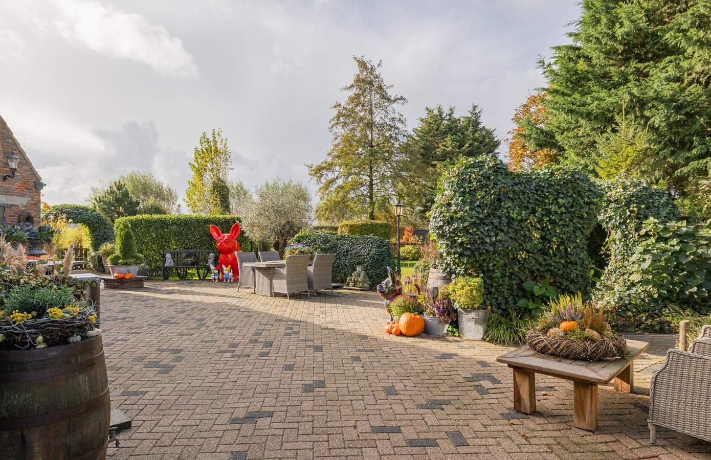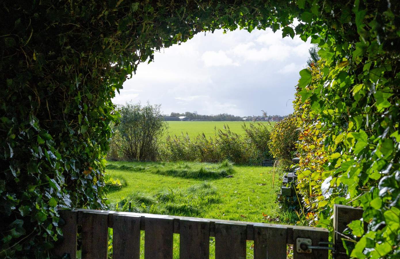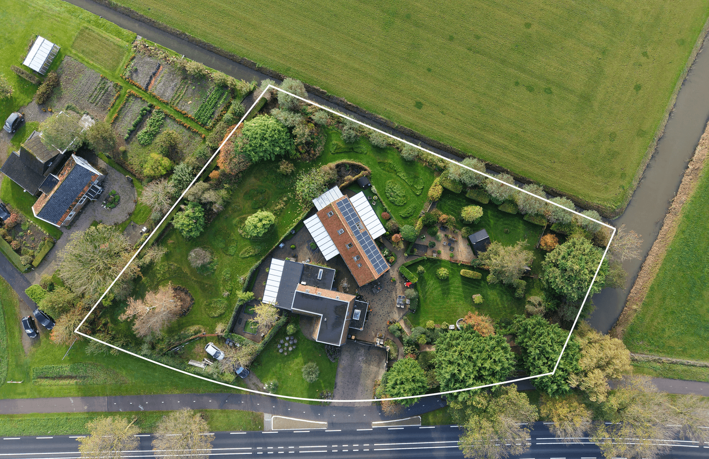 Achter de poort ontvouwt zich uw eigen groene paradijs. Het perceel van ruim 3.300 m² is volwassen aangelegd met een rijke variatie aan beplanting, gazons, borders en wandelpaden. Vanuit elke hoek ontdekt u een ander perspectief: een weelderige boomgaard, een kleurrijk bloemenperk of het weidse uitzicht over de landerijen.