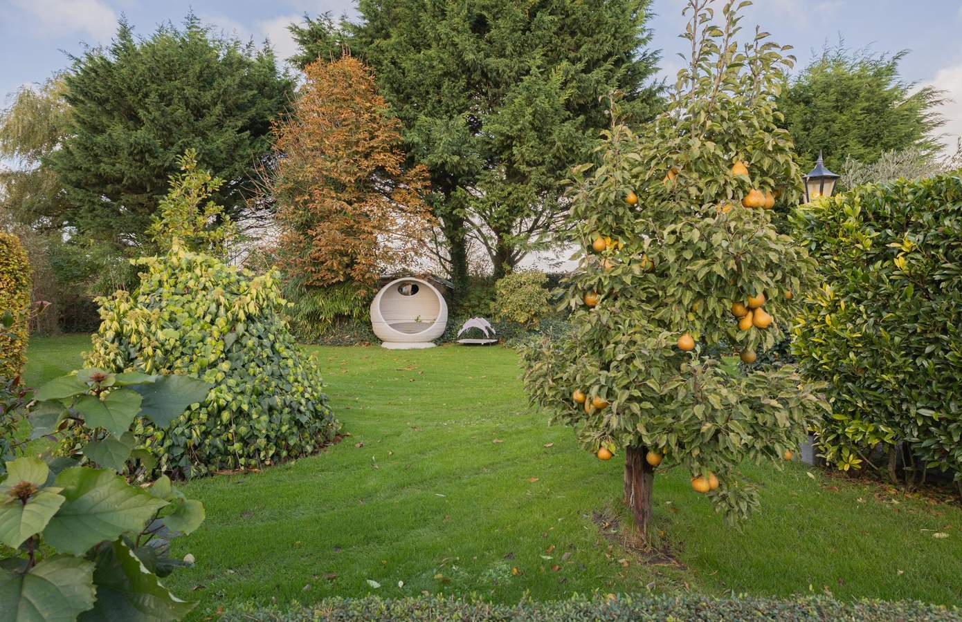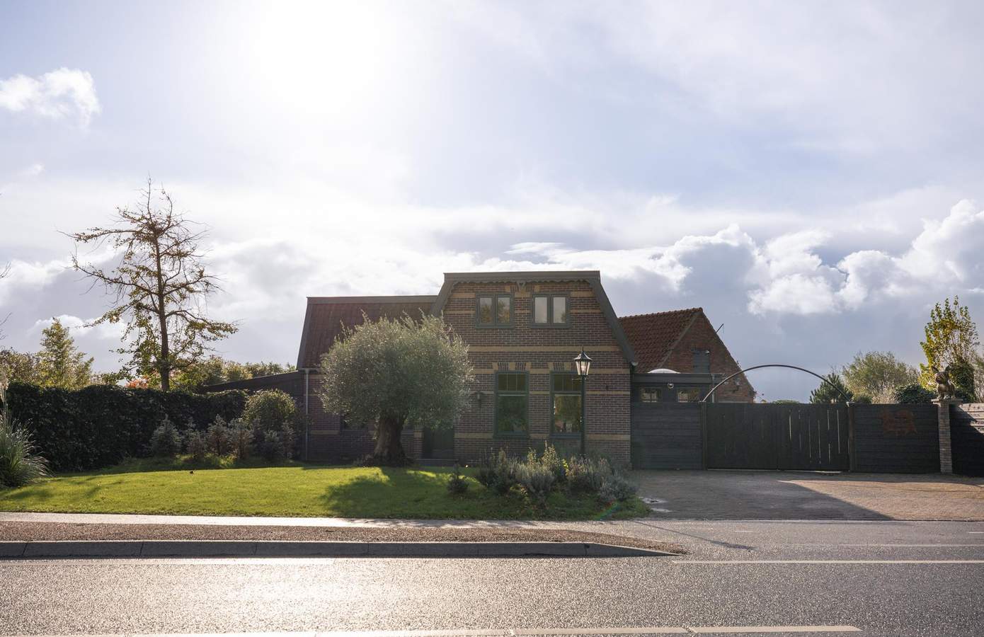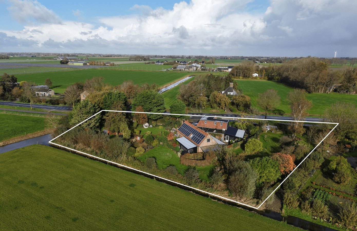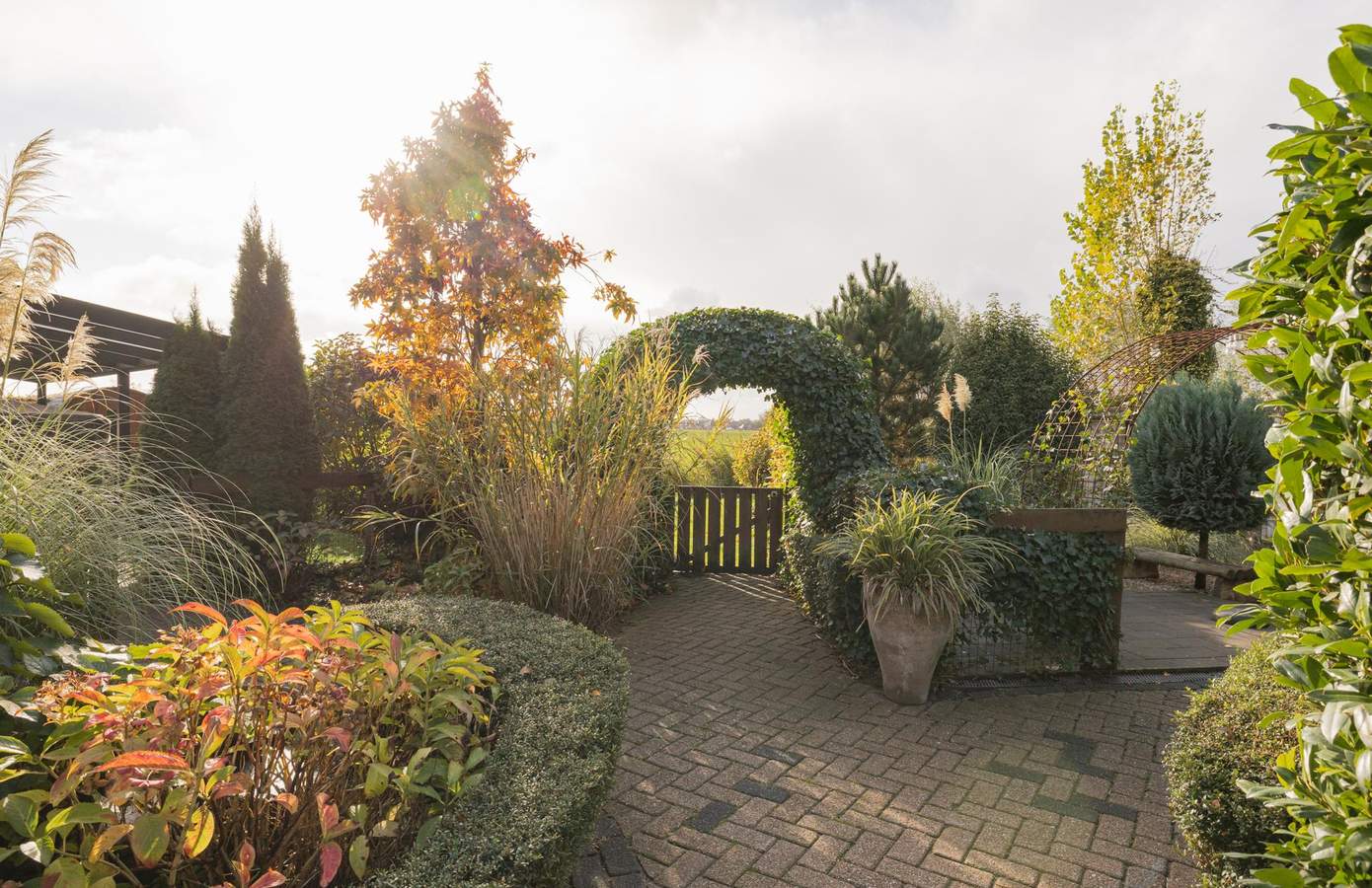 Achter de poort ontvouwt zich uw eigen groene paradijs. Het perceel van ruim 3.300 m² is volwassen aangelegd met een rijke variatie aan beplanting, gazons, borders en wandelpaden. Vanuit elke hoek ontdekt u een ander perspectief: een weelderige boomgaard, een kleurrijk bloemenperk of het weidse uitzicht over de landerijen.