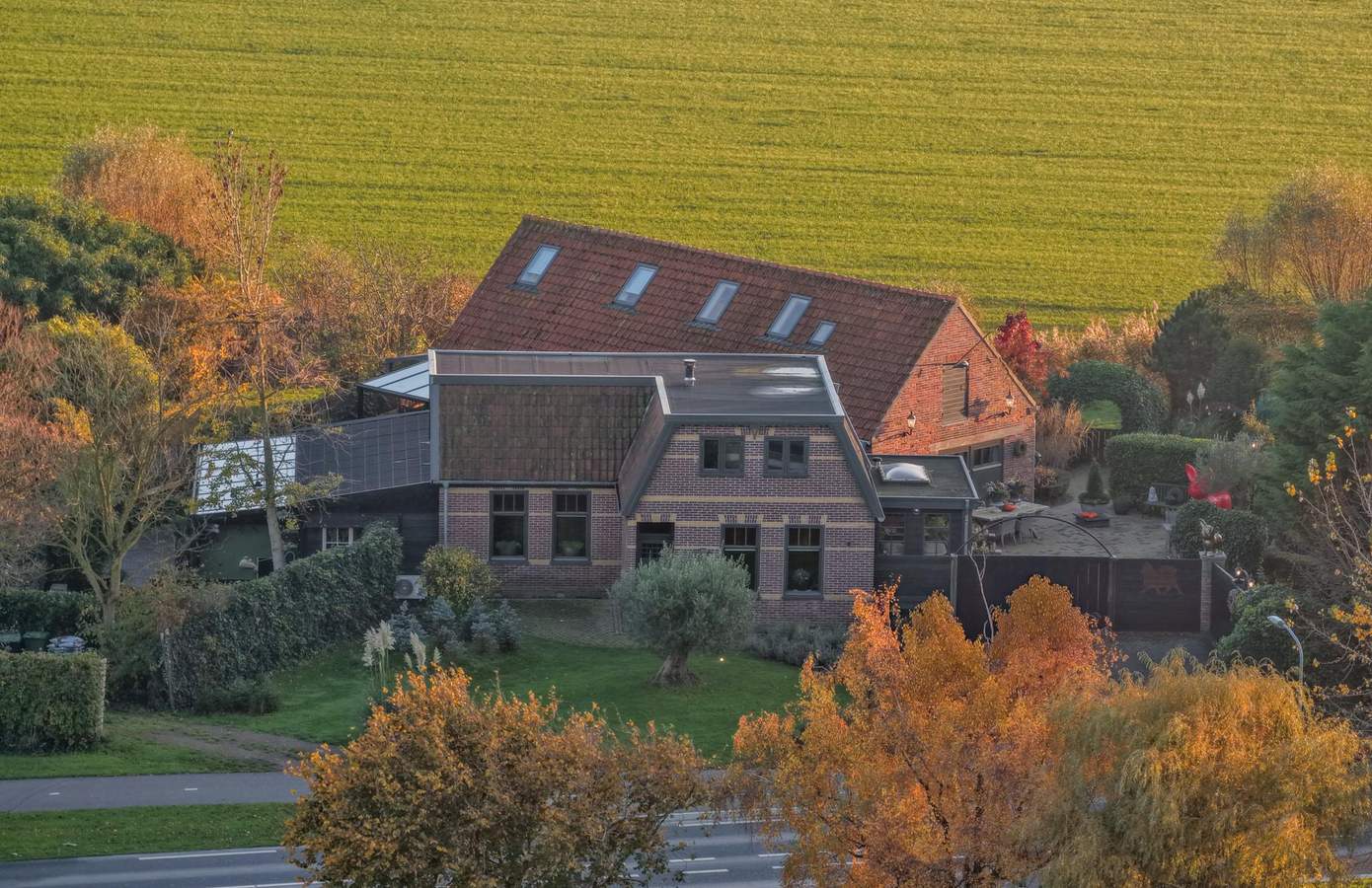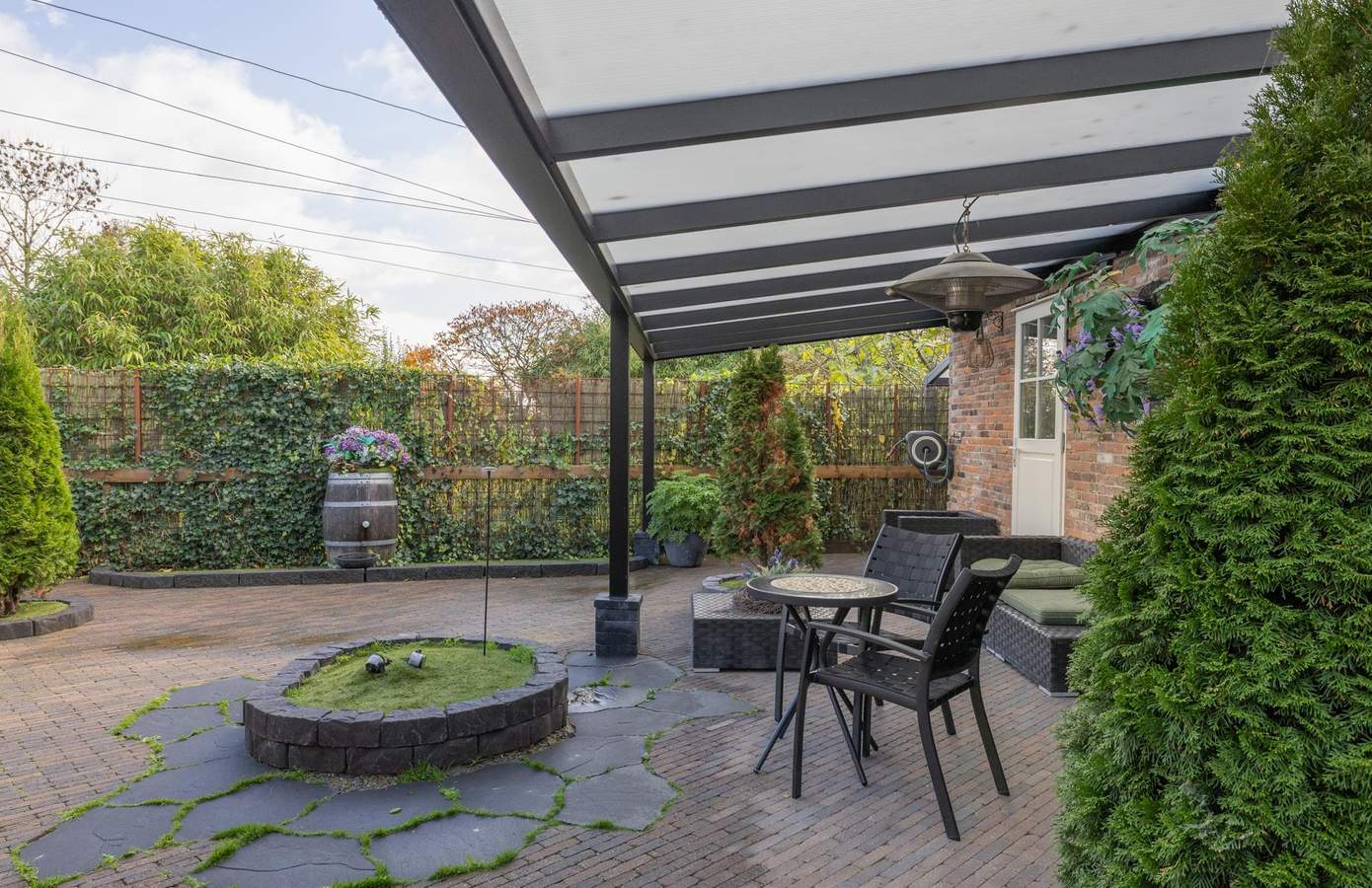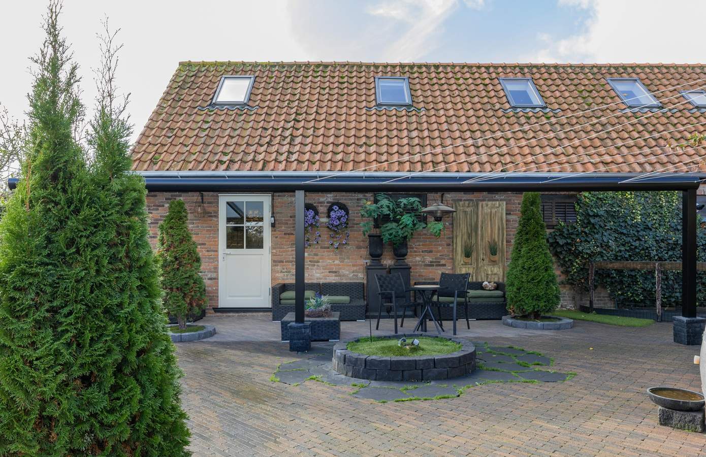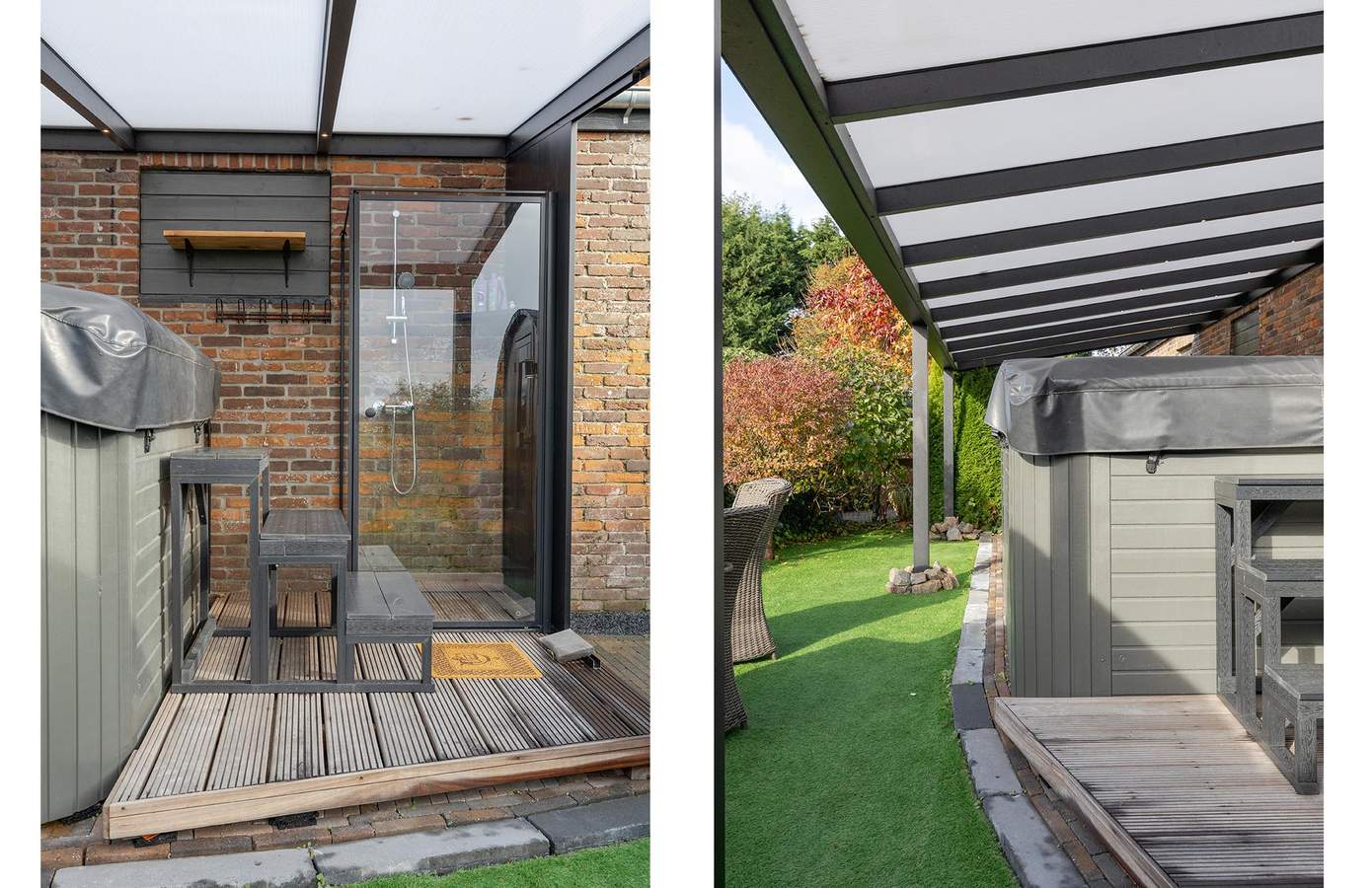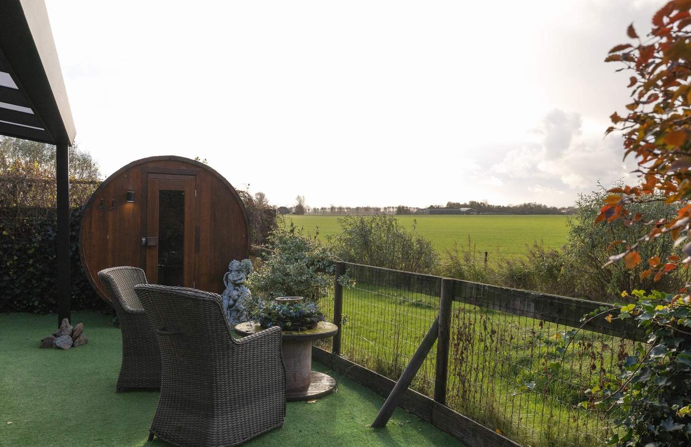 De verschillende terrassen – zowel open als overdekt – nodigen uit tot ontspannen buitenleven. Verderop bevindt zich de zwemspa met warm water, buitendouche en sauna – een plek voor ultieme ontspanning met volledige privacy en een prachtig uitzicht over de landerijen. De tuinverlichting, het kunstgrasveld en de diverse zitplekken maken het geheel compleet.