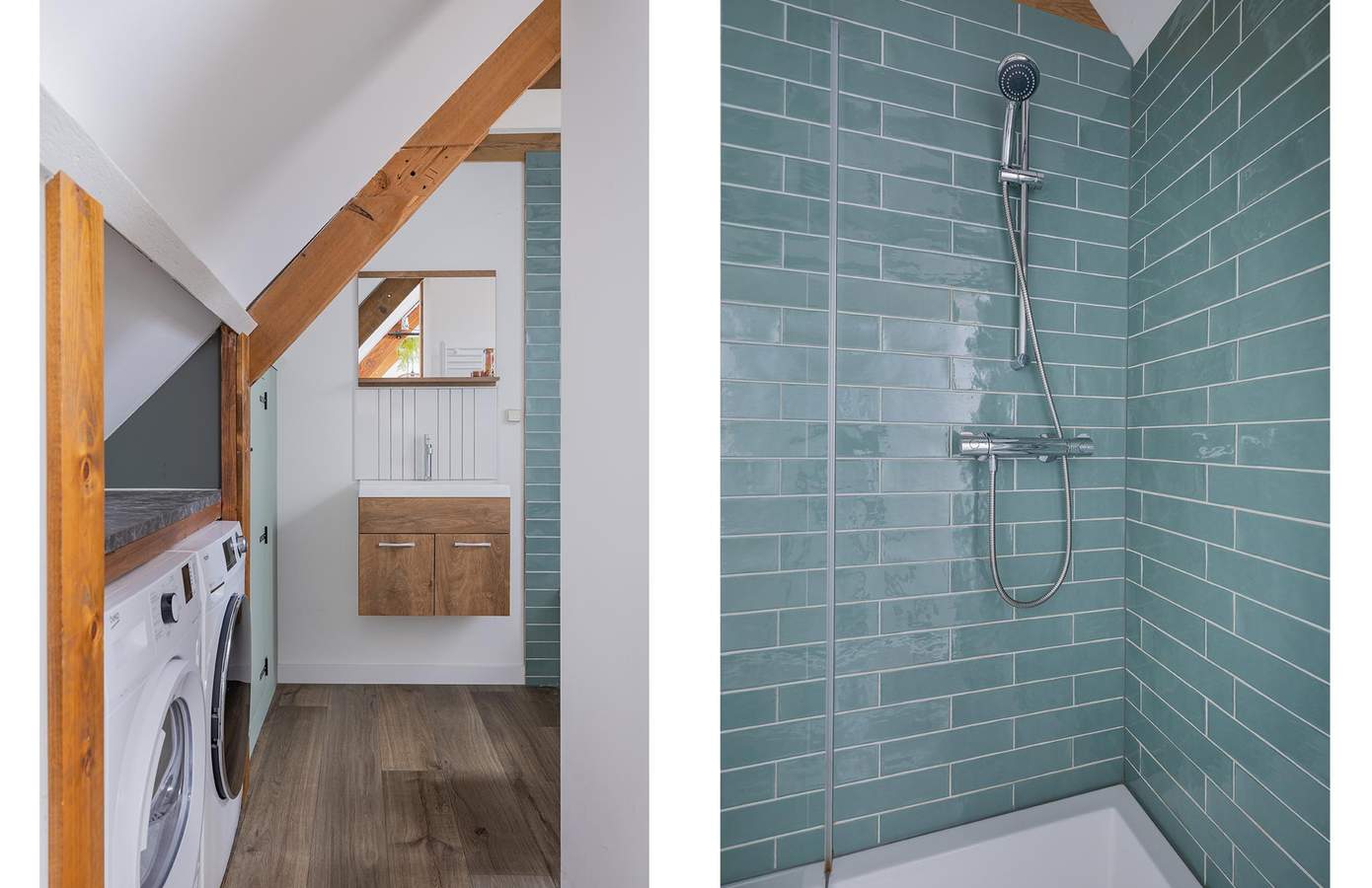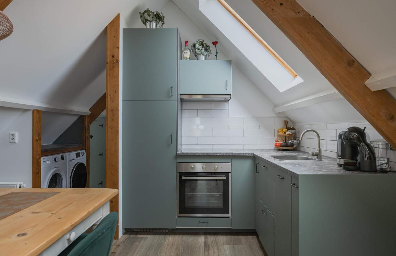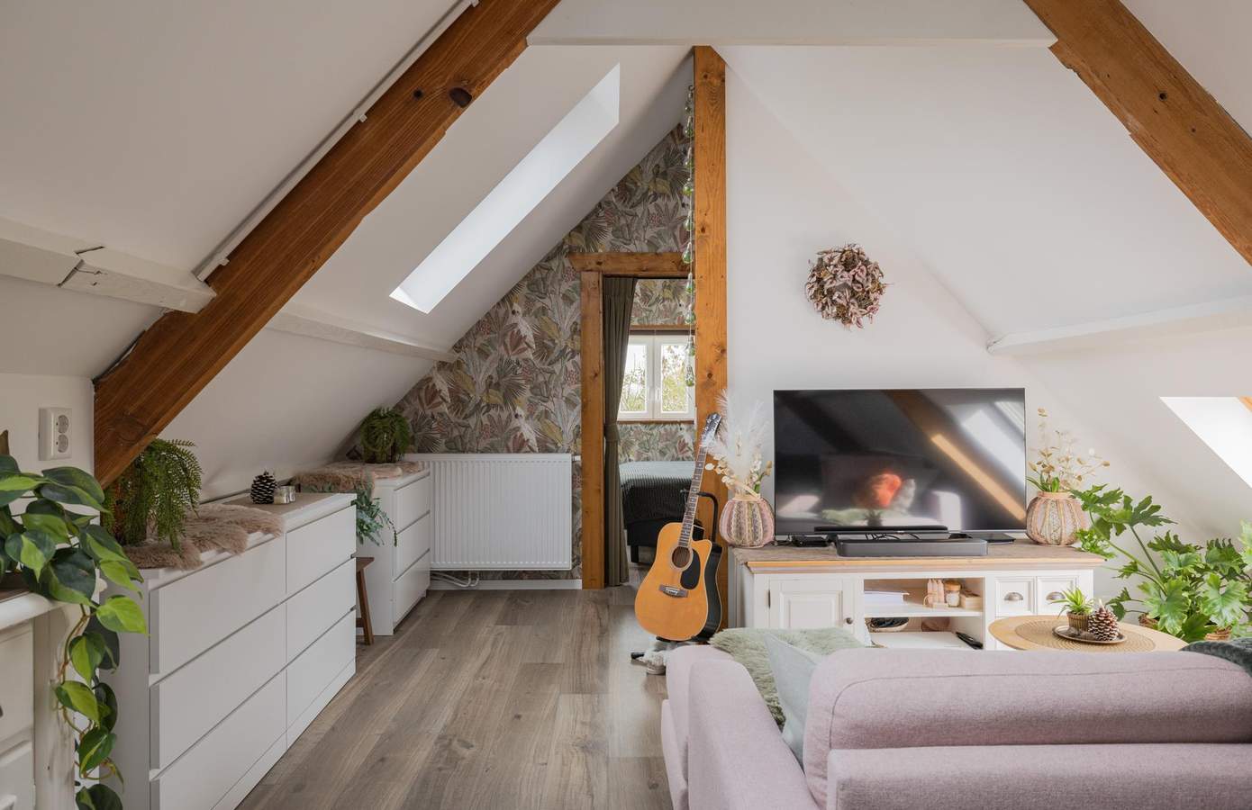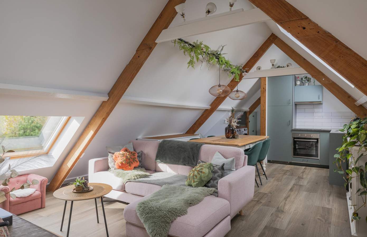 Op de verdieping bevinden zich drie sfeervolle slaapkamers, elk met karakteristieke dakspanten en royale dakramen die het licht rijkelijk binnenlaten.