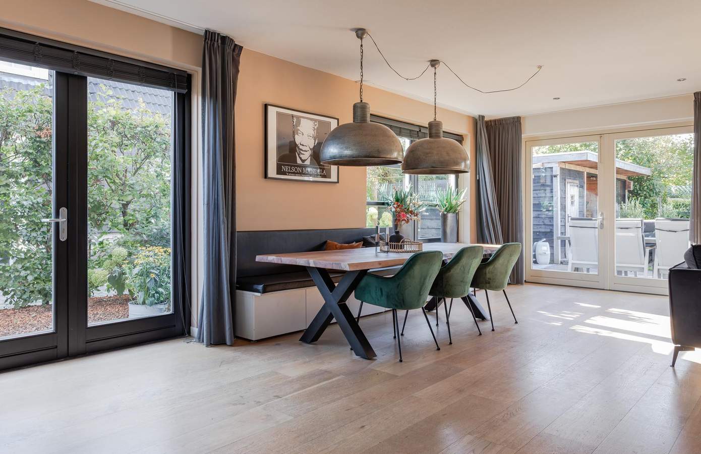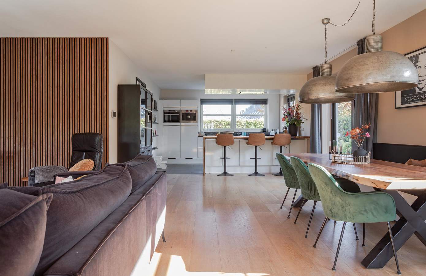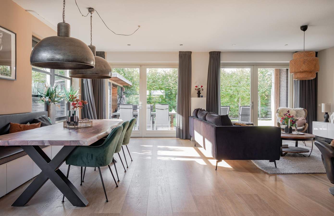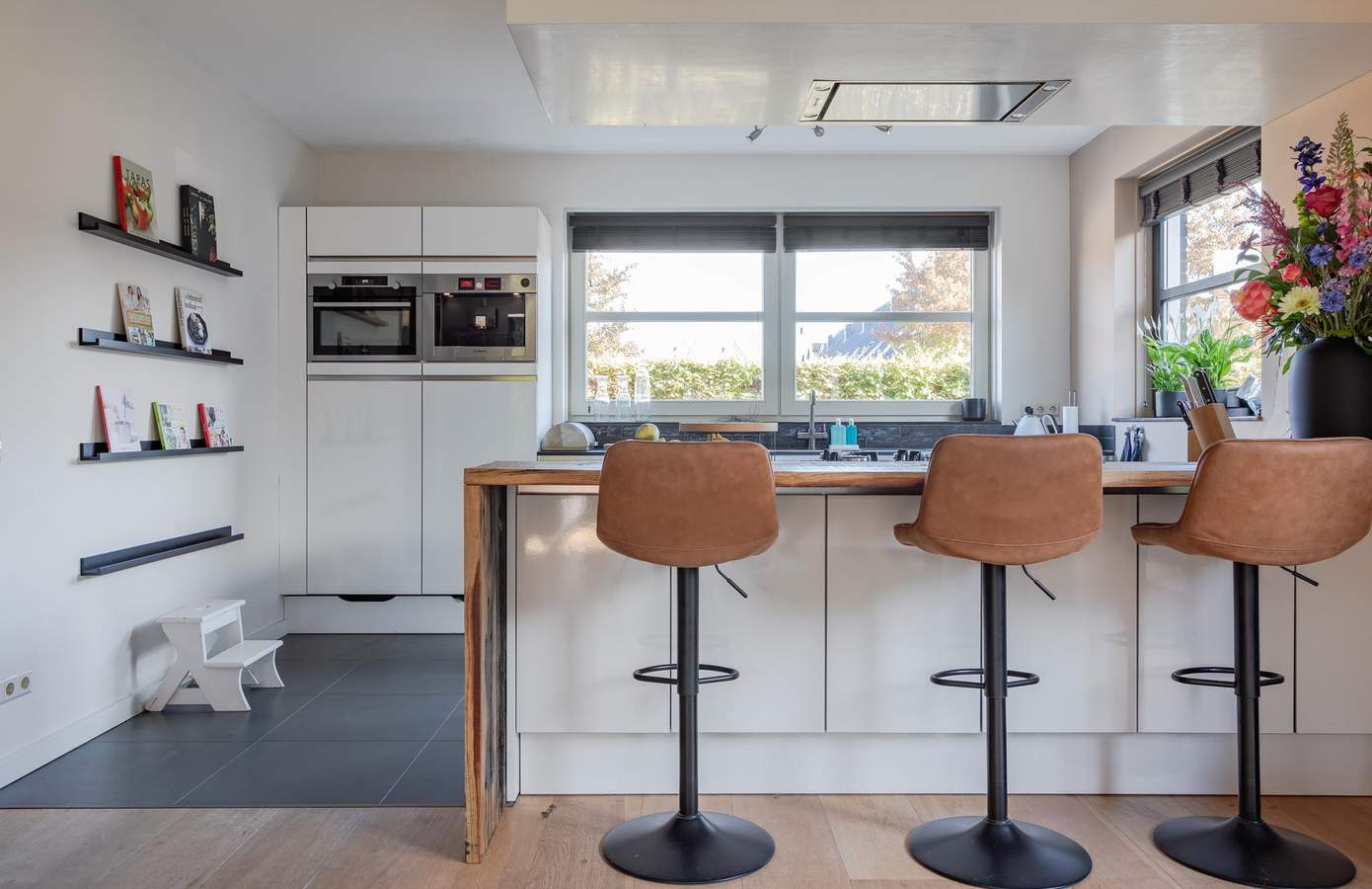 Zodra u de hal binnenstapt, merkt u de zorg en aandacht waarmee dit huis is ingericht. Het voelt ruim, licht en warm. Bij binnenkomst in de woonkamer valt meteen de lichtinval op: grote raampartijen en openslaande deuren naar de tuin zorgen voor een prettige verbinding met buiten. De woonkamer biedt volop ruimte voor zowel een gezellige zithoek als een royale eethoek. De open keuken is een ware eyecatcher. De keuken is voorzien van een strak kookeiland inclusief bar. Daarnaast voorzien van moderne inbouwapparatuur zoals een combi-oven, koffiemachine, nieuwe vaatwasmachine (2023) en maar liefst twee koelkasten. Terwijl u kookt, schuiven familie of vrienden gezellig aan de bar of in de vaste bank die perfect in de ruimte is geïntegreerd.