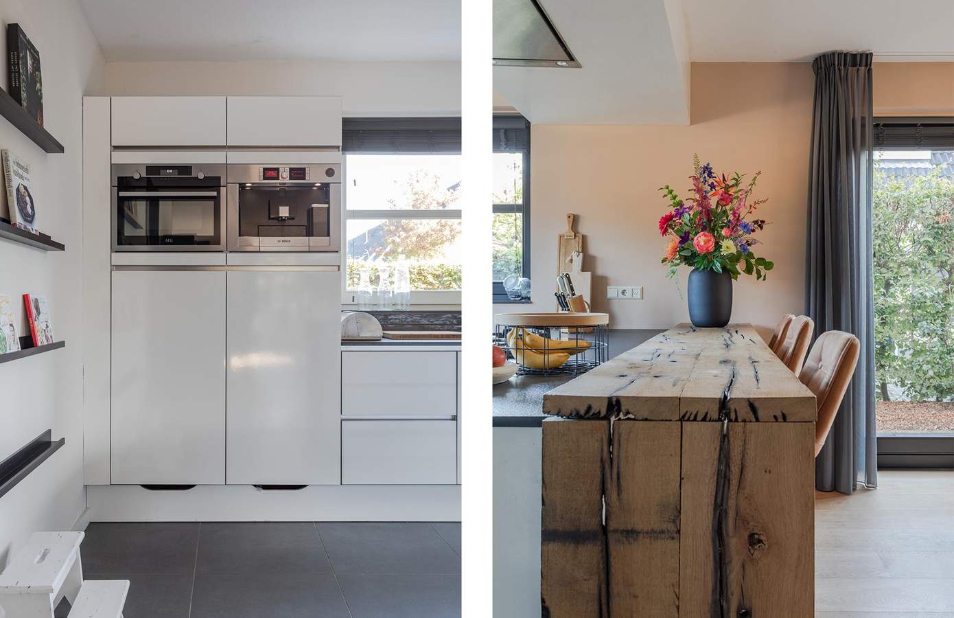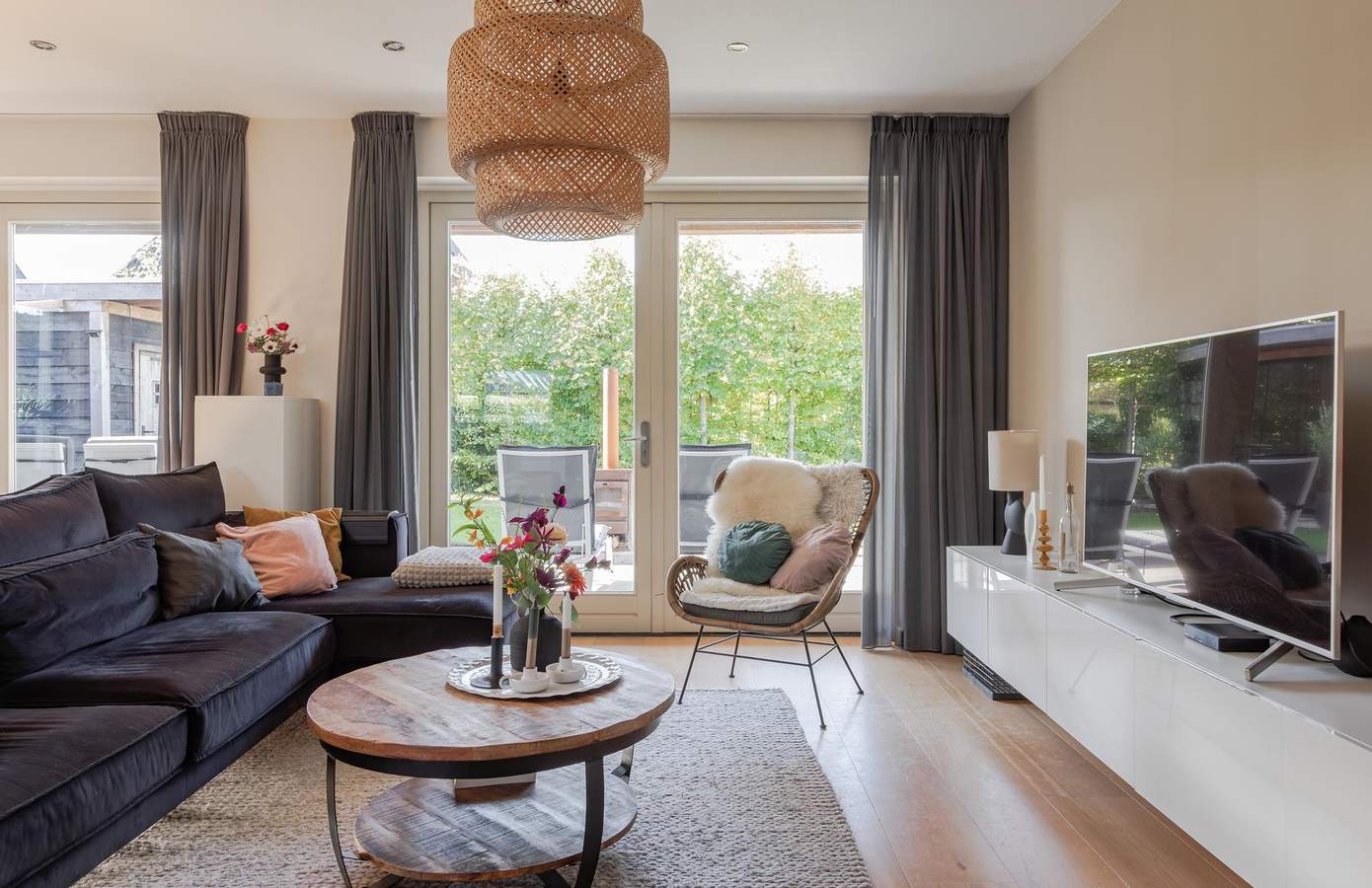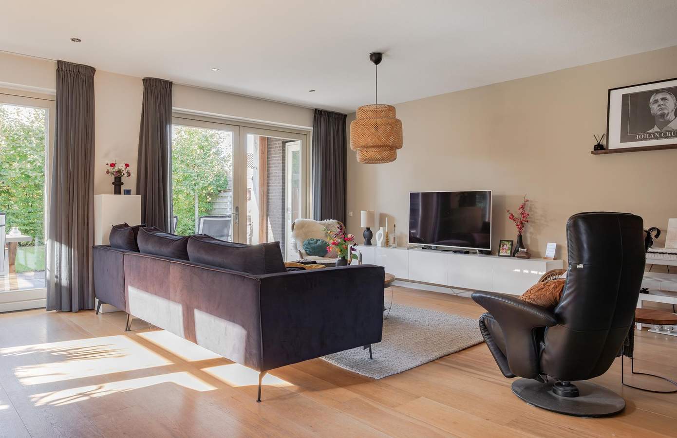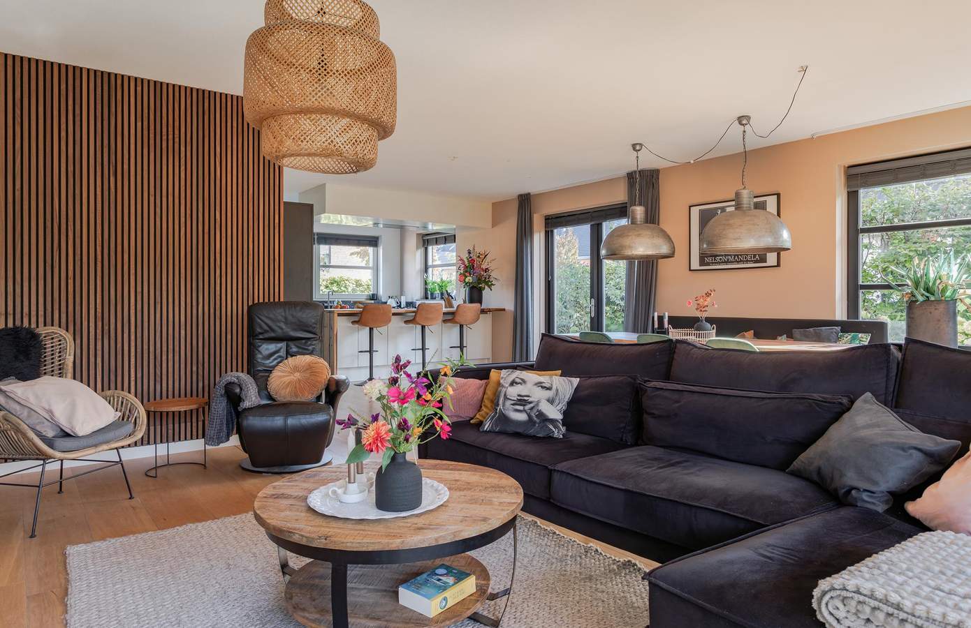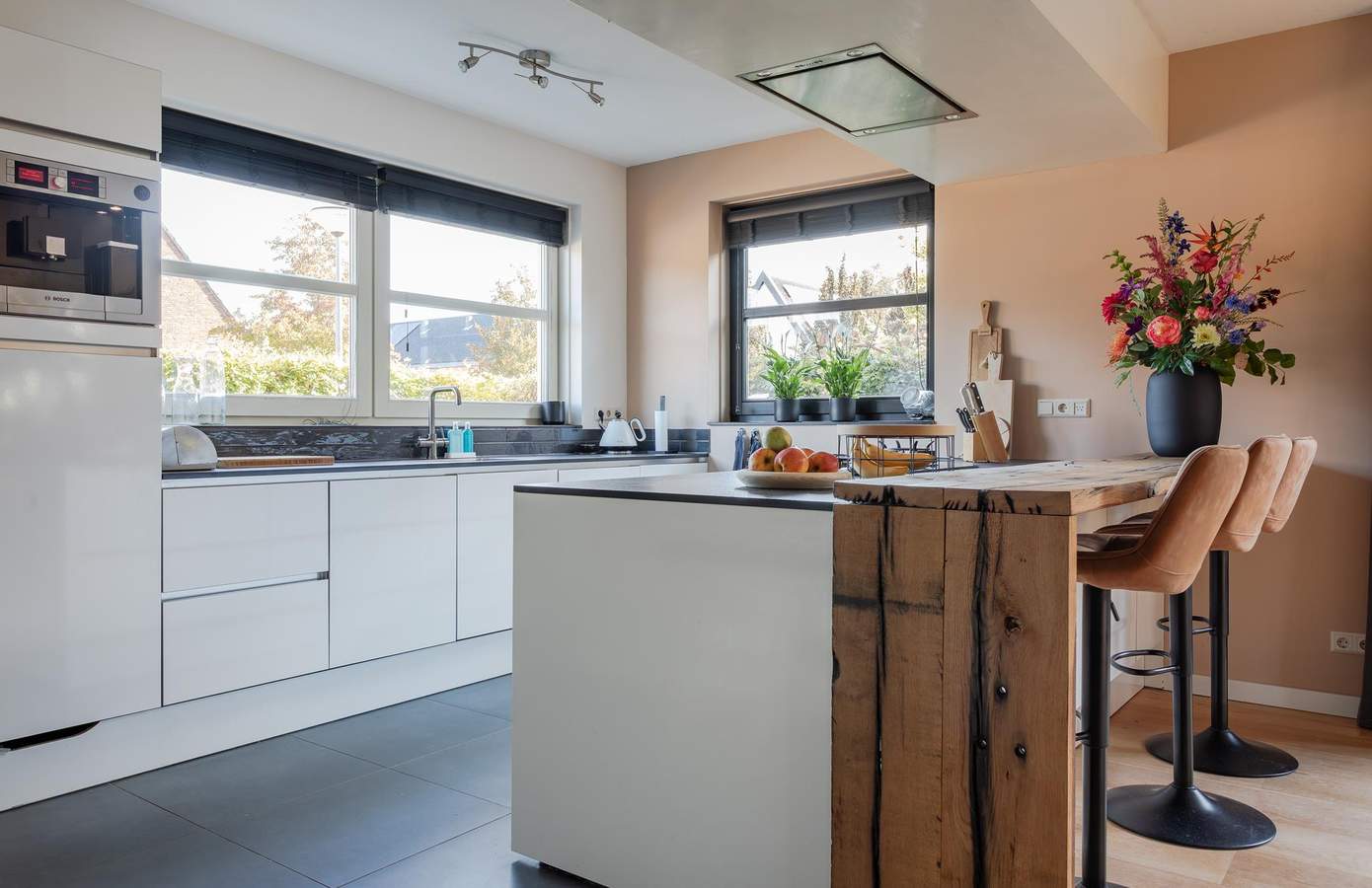 Zodra u de hal binnenstapt, merkt u de zorg en aandacht waarmee dit huis is ingericht. Het voelt ruim, licht en warm. Bij binnenkomst in de woonkamer valt meteen de lichtinval op: grote raampartijen en openslaande deuren naar de tuin zorgen voor een prettige verbinding met buiten. De woonkamer biedt volop ruimte voor zowel een gezellige zithoek als een royale eethoek. De open keuken is een ware eyecatcher. De keuken is voorzien van een strak kookeiland inclusief bar. Daarnaast voorzien van moderne inbouwapparatuur zoals een combi-oven, koffiemachine, nieuwe vaatwasmachine (2023) en maar liefst twee koelkasten. Terwijl u kookt, schuiven familie of vrienden gezellig aan de bar of in de vaste bank die perfect in de ruimte is geïntegreerd.