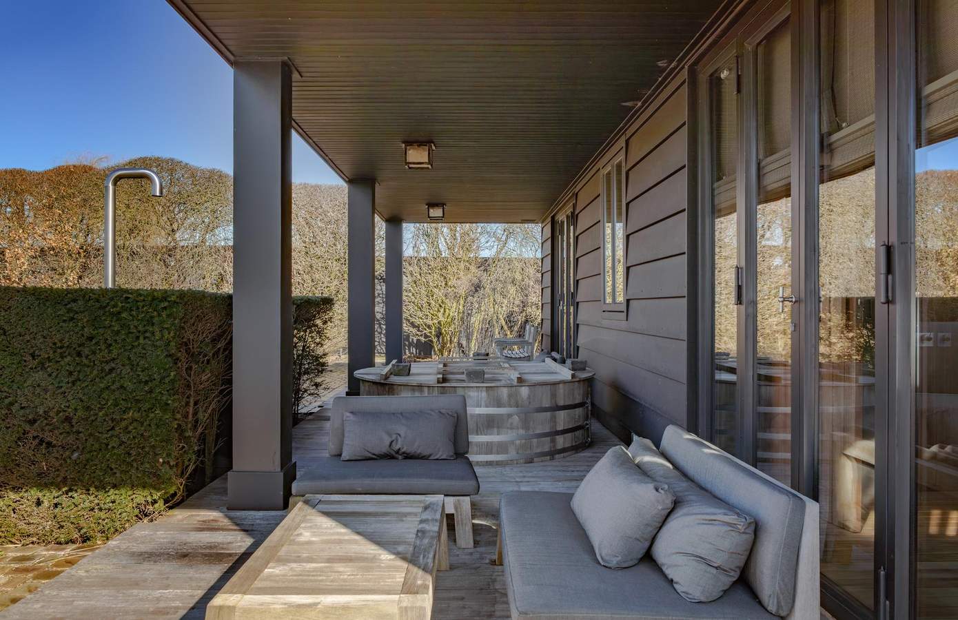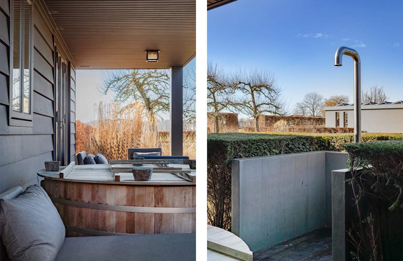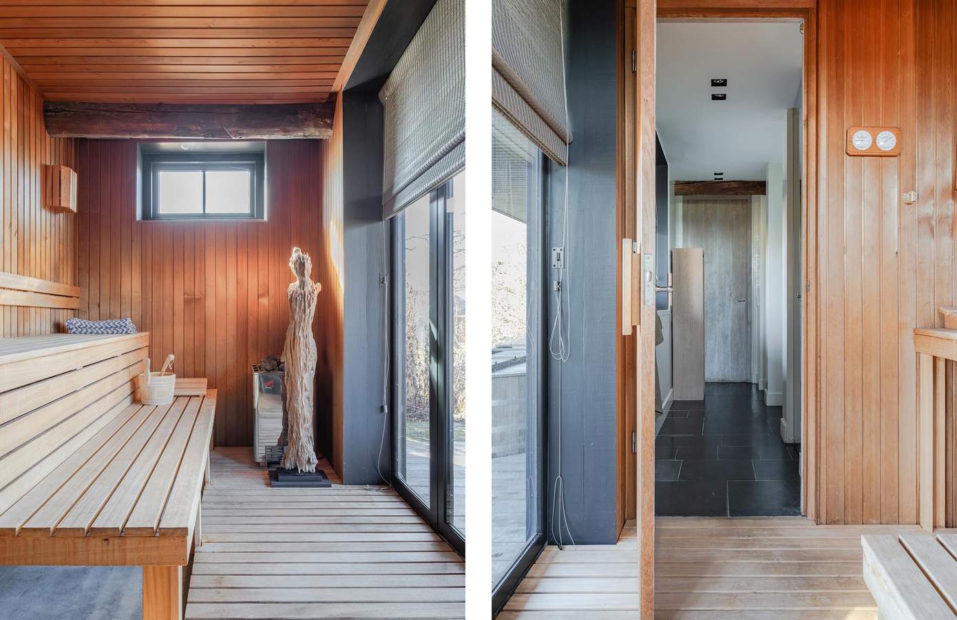 Aan het uiteinde van het zwembad, bevindt zich een bijzonder bijgebouw dat volledig is ingericht als wellness en gastenverblijf. Dit stijlvolle buitenverblijf vormt een volwaardige aanvulling op het landhuis en sluit architectonisch naadloos aan bij het ontwerp van de woning.