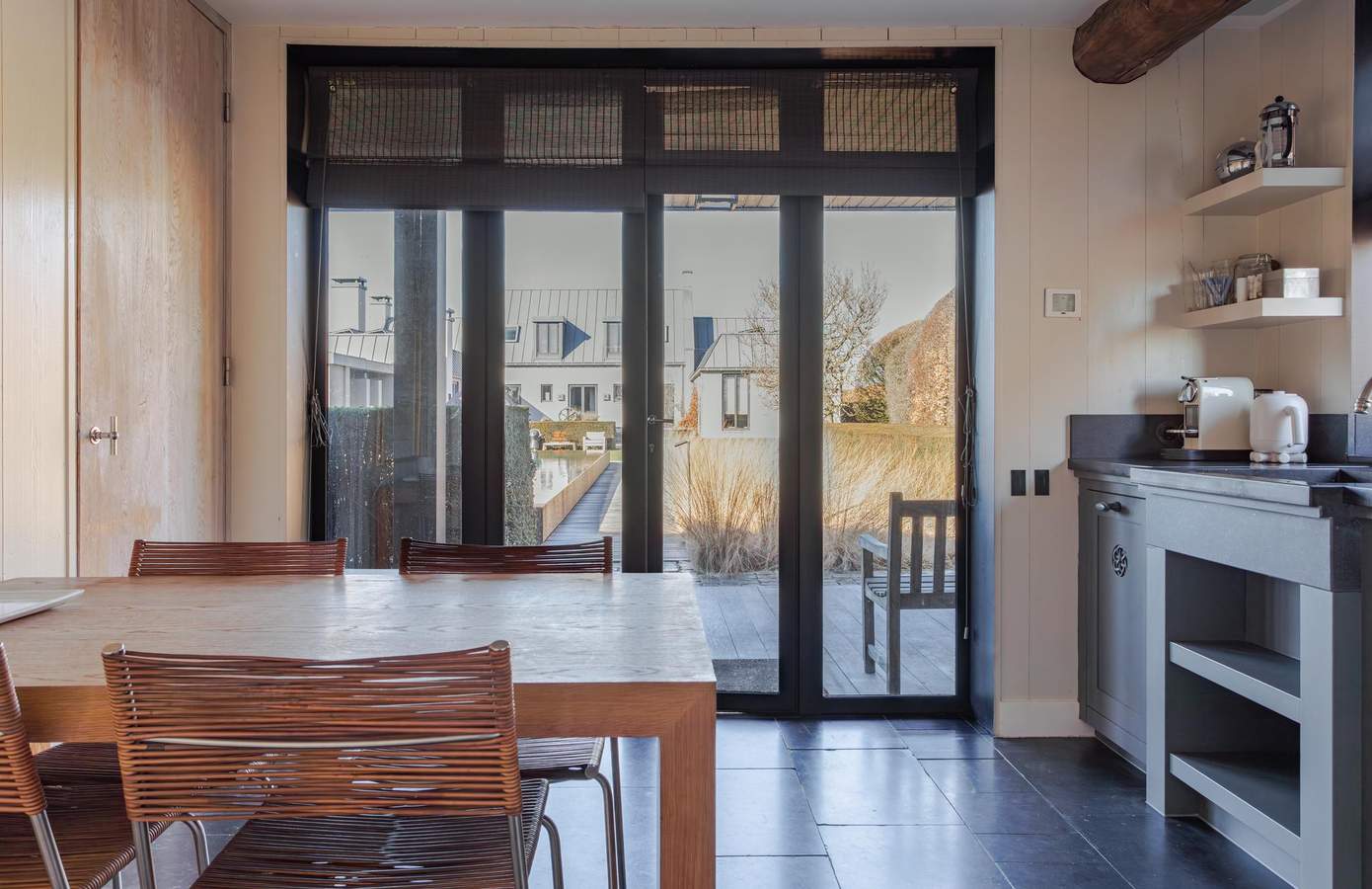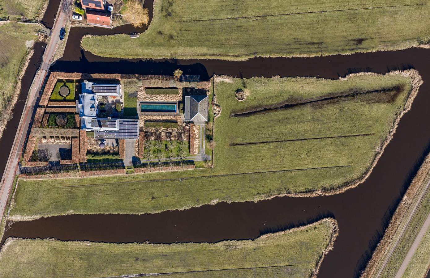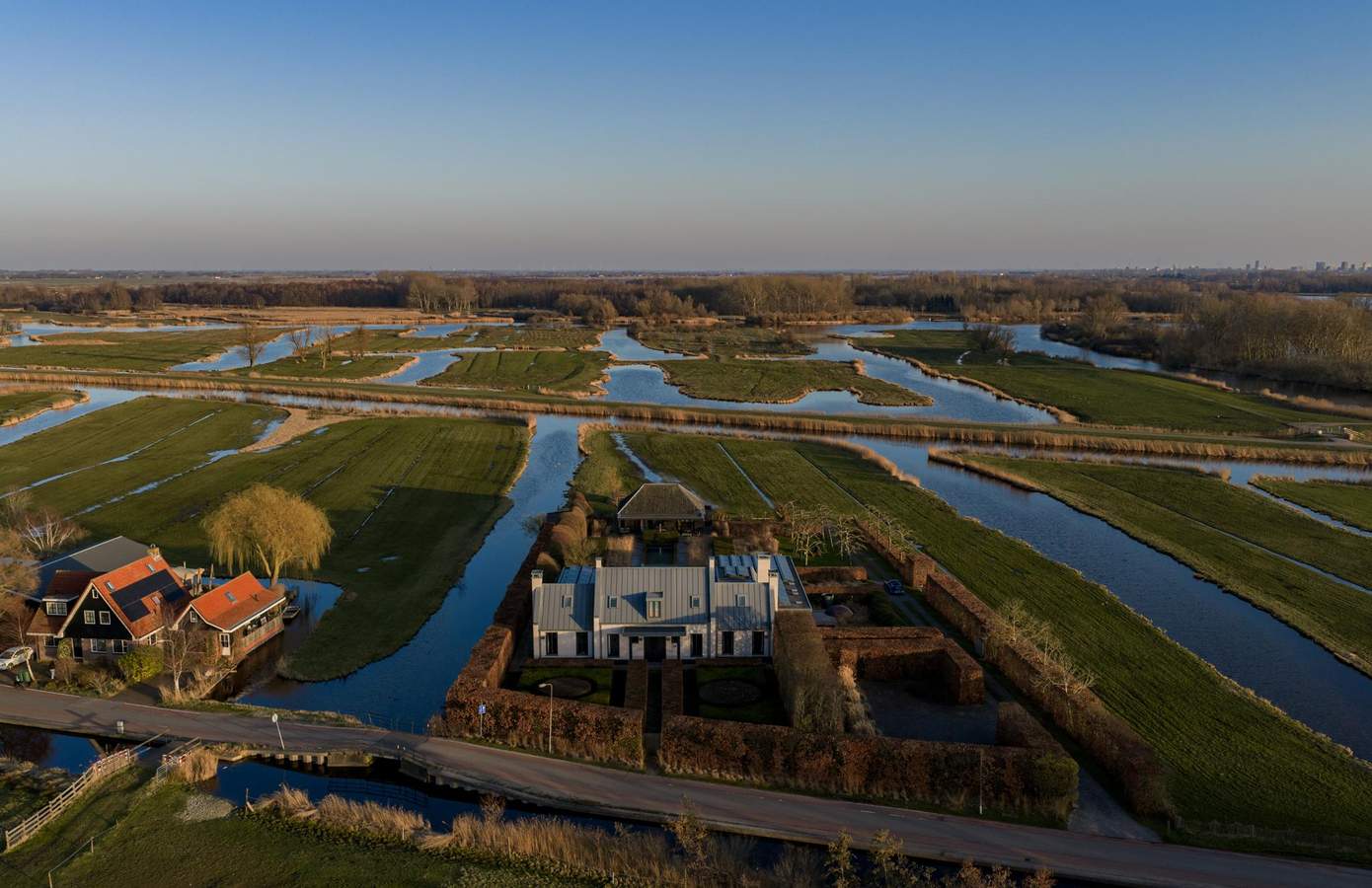 Wat deze plek werkelijk uniek maakt, is de tuin van wereldberoemd landschapsarchitect Piet Oudolf. Zijn ontwerp is geen omlijsting van het huis, maar een integraal onderdeel van de architectuur. Strakke zichtlijnen, krachtige structuren en natuurlijke beplanting zorgen ervoor dat huis en landschap met elkaar in dialoog staan. De U-vormige hoeve ligt centraal op een perceel van 10.000 m², omringd door water en weids polderlandschap. Vanuit vrijwel iedere ruimte is er direct contact met buiten. De verhoudingen, zichtlijnen en symmetrie zijn zo zorgvuldig ontworpen dat alle onderdelen zoals het huis, tuin en omgeving, met elkaar lijken te spreken.