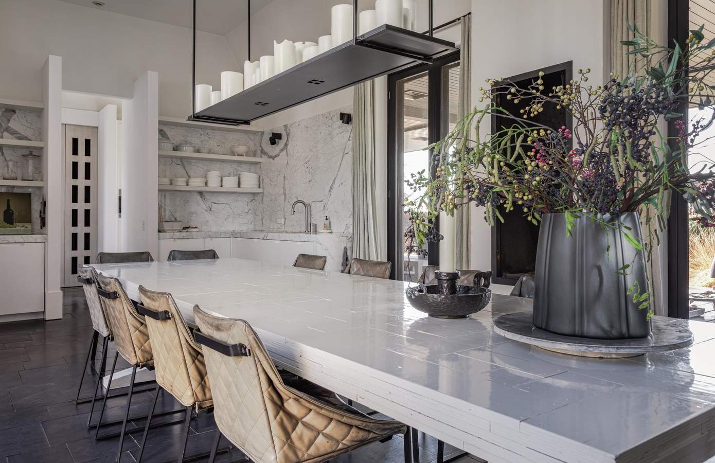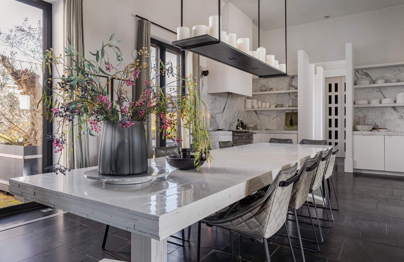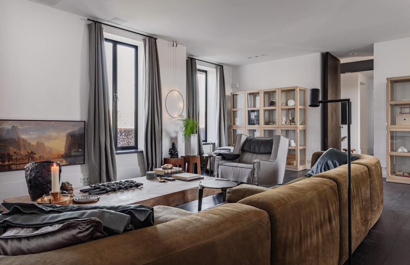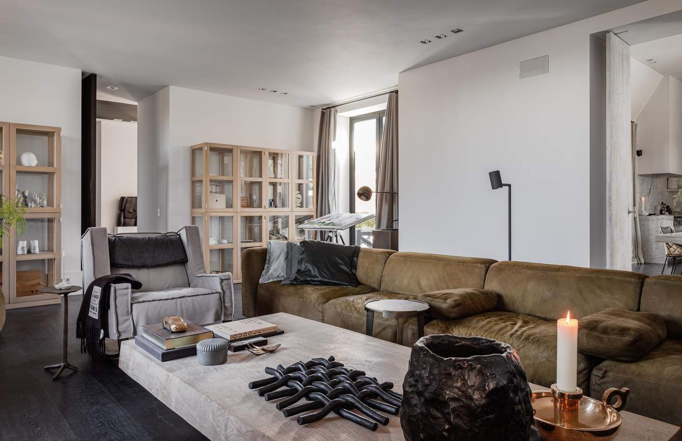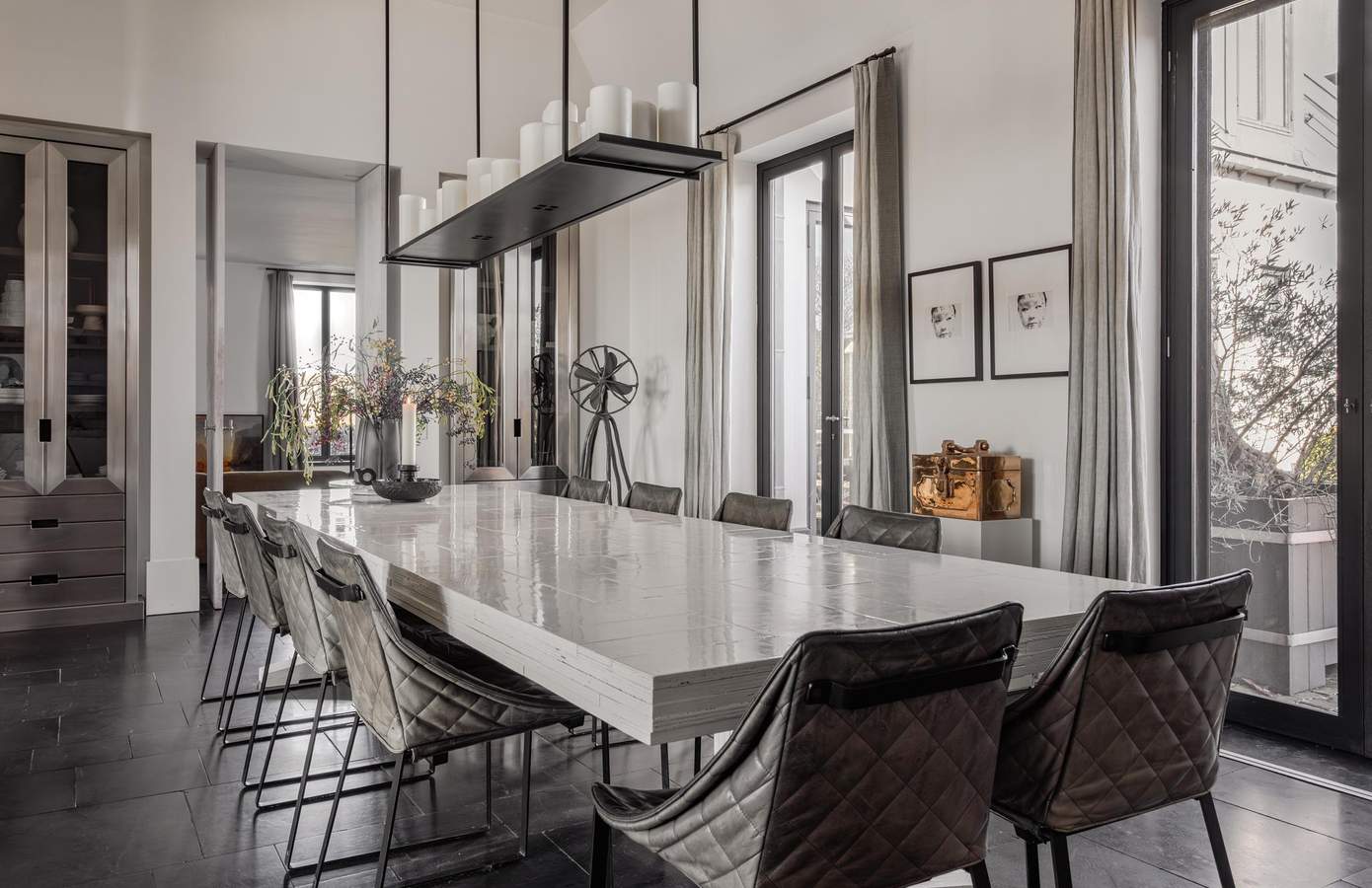 De royale leefruimtes worden gekenmerkt door een verfijnd spel van lijnen en symmetrie, waarbij open haarden tegenover elkaar zijn geplaatst en grote glaspartijen met lage vensters zorgen voor een voortdurende dialoog met de tuin.