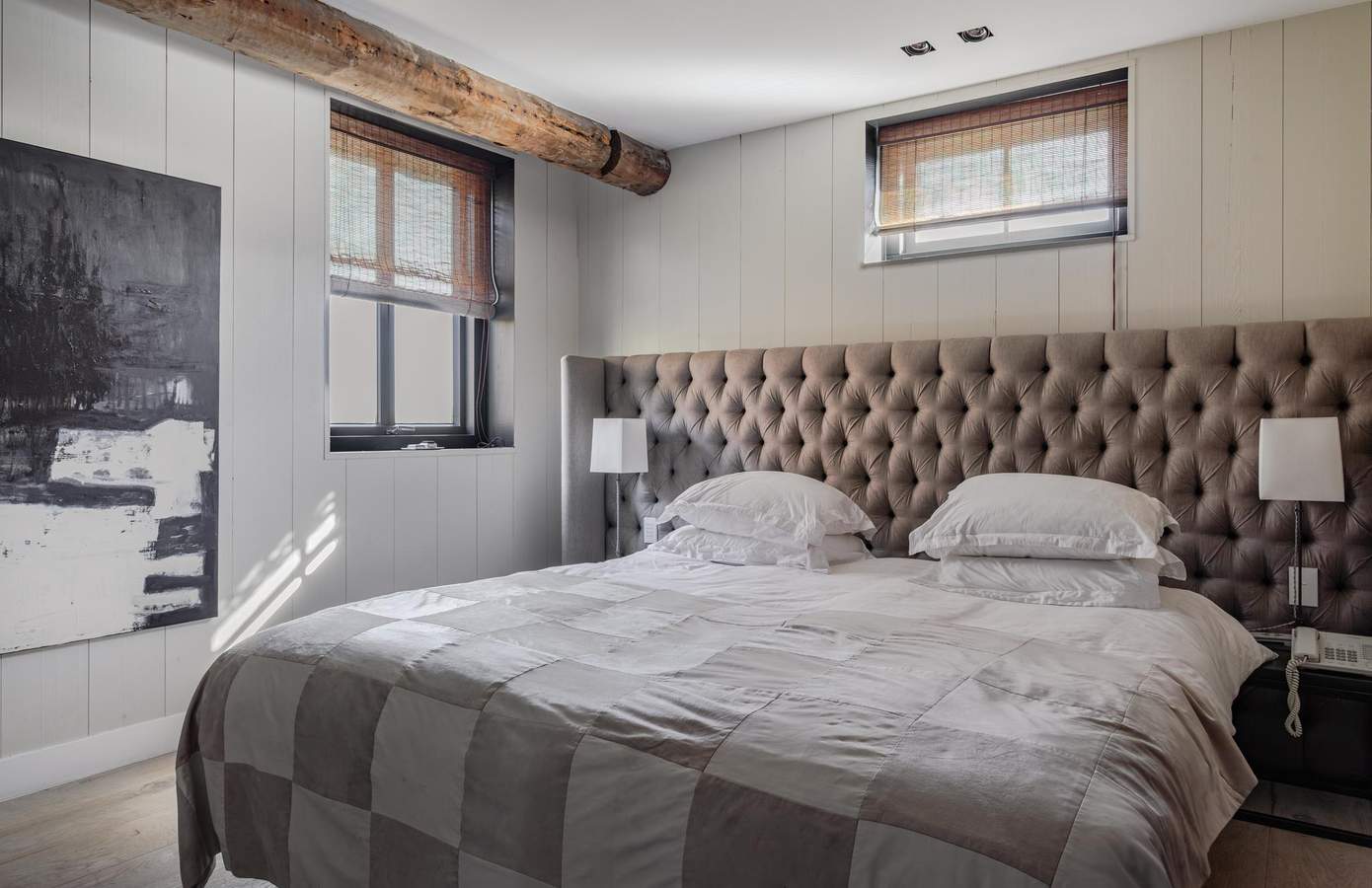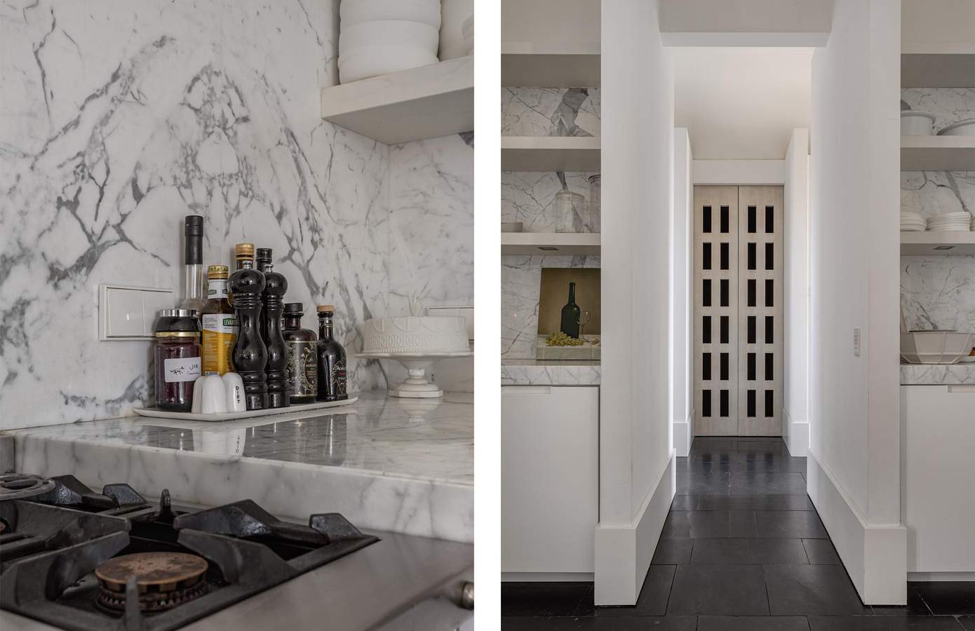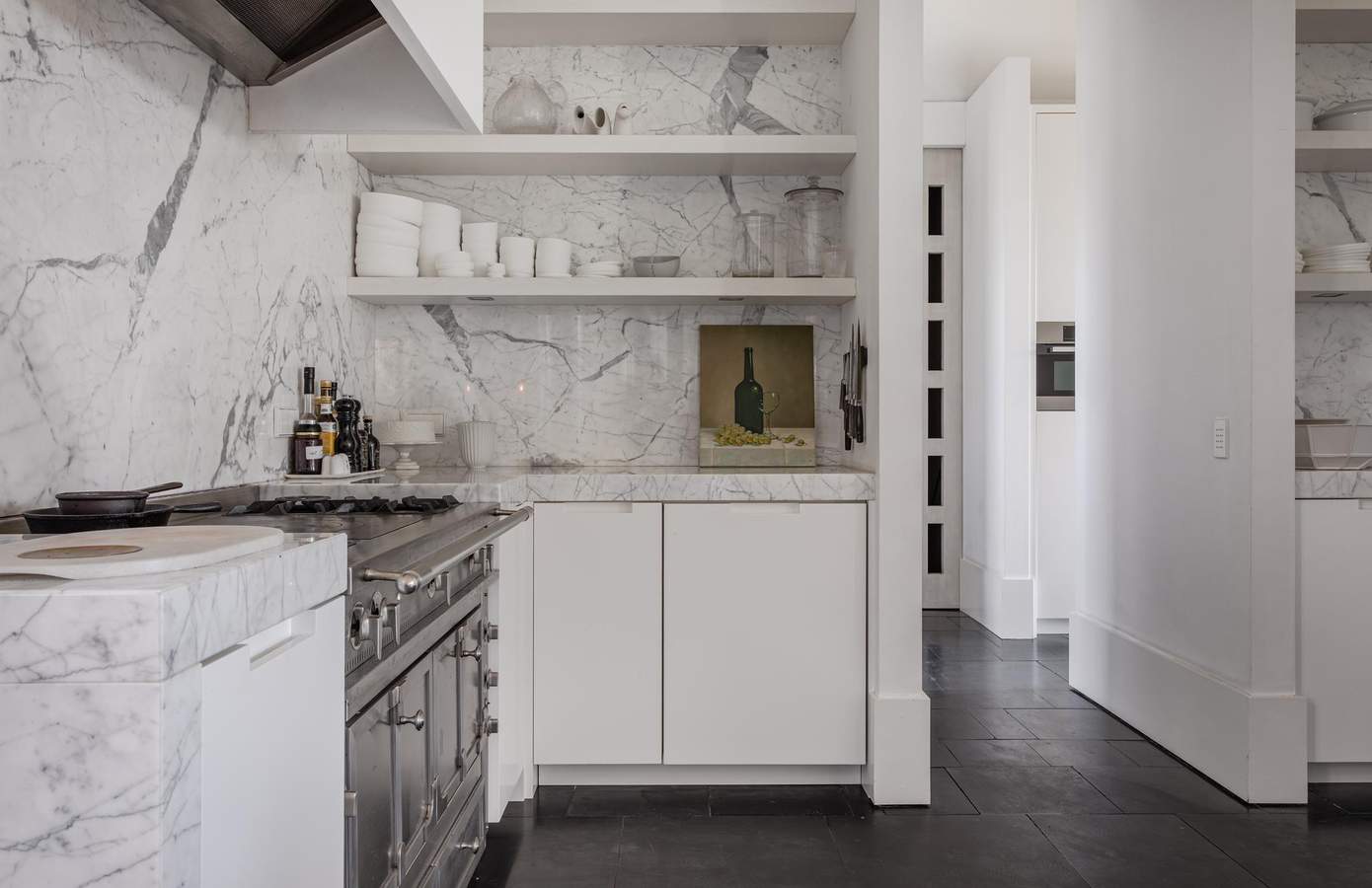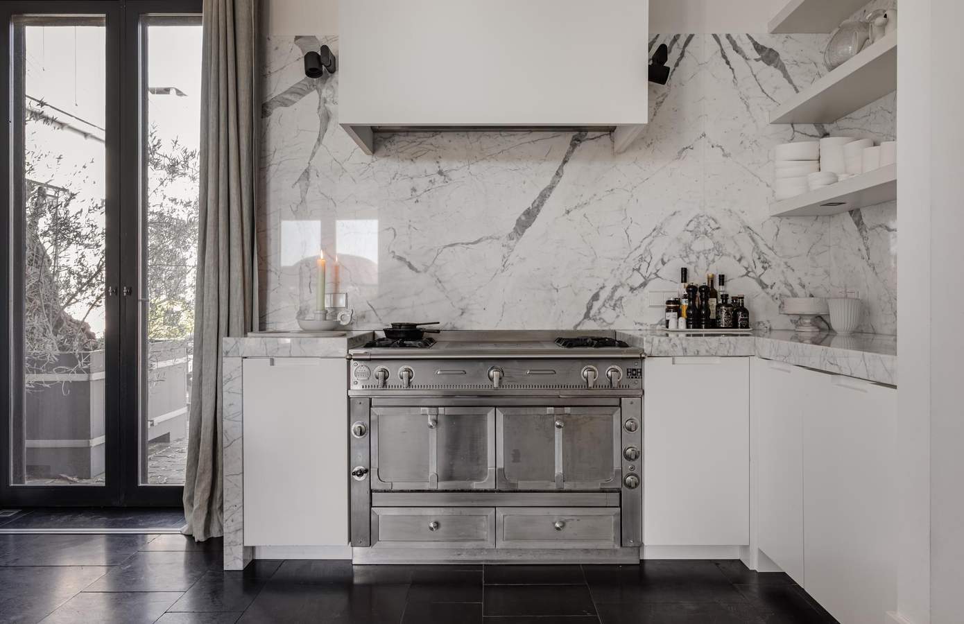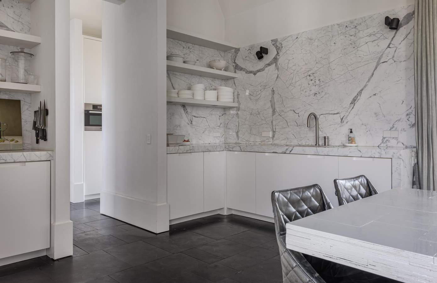 De royale leefruimtes worden gekenmerkt door een verfijnd spel van lijnen en symmetrie, waarbij open haarden tegenover elkaar zijn geplaatst en grote glaspartijen met lage vensters zorgen voor een voortdurende dialoog met de tuin.