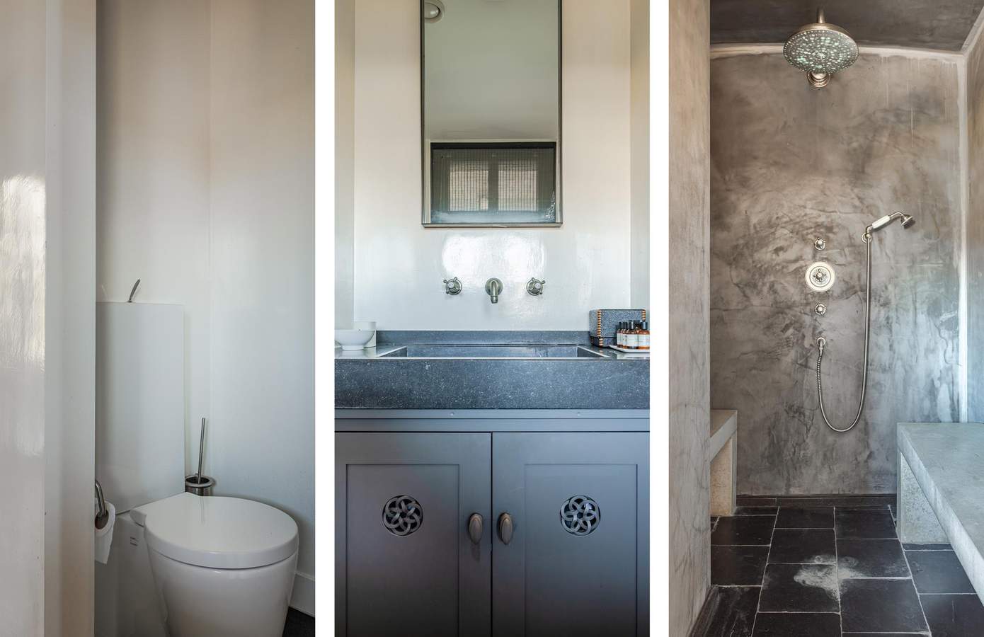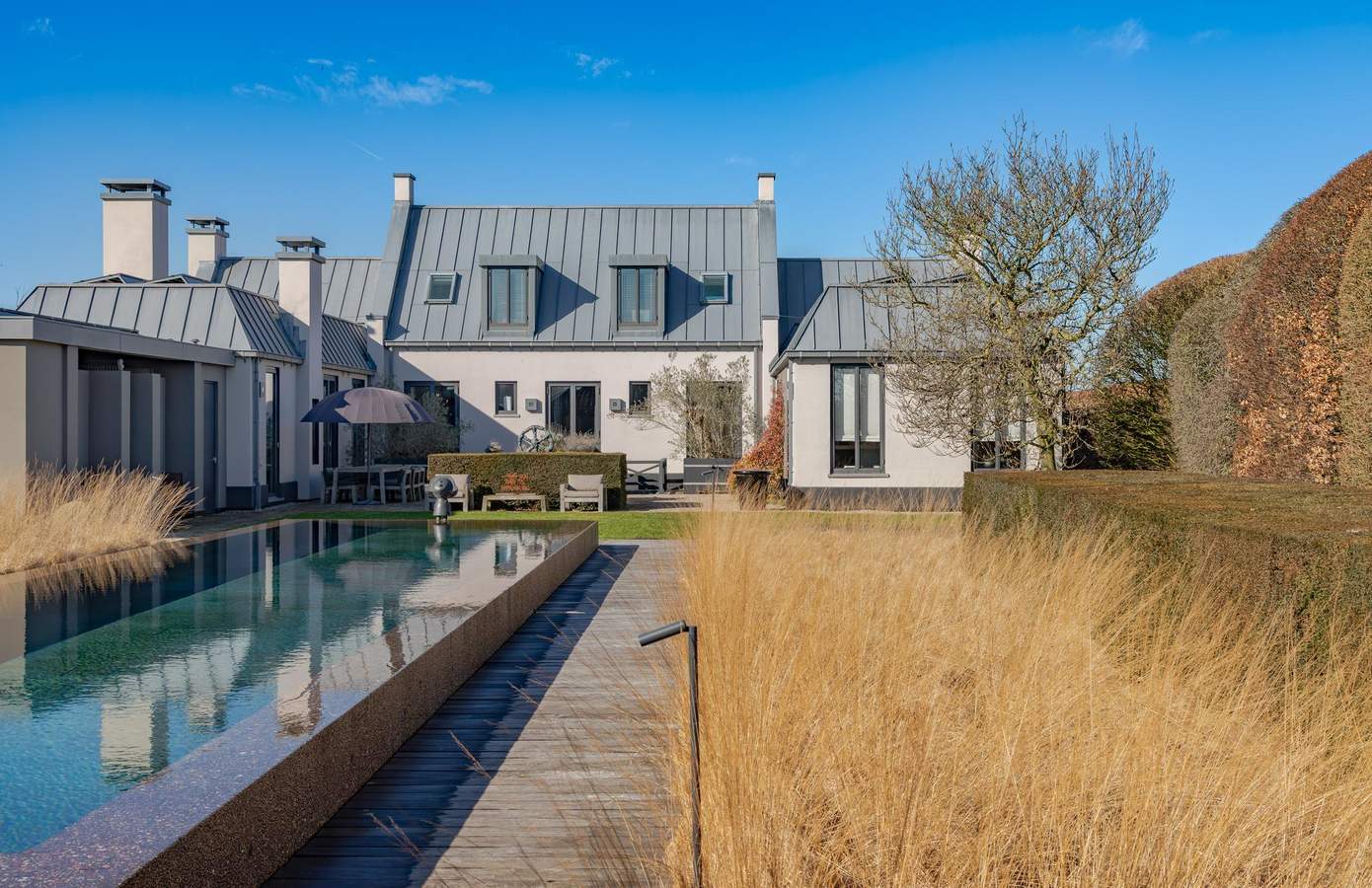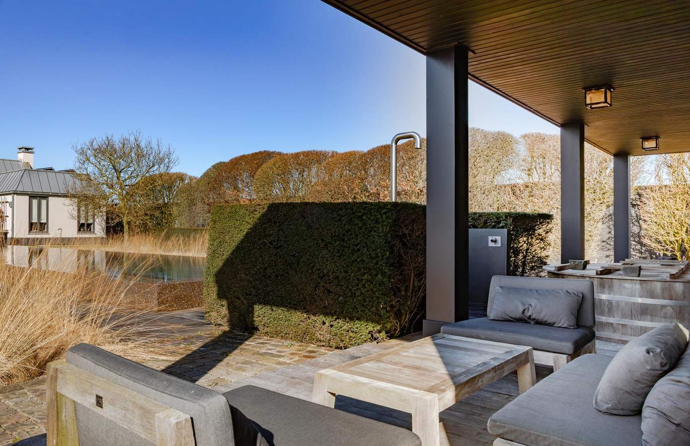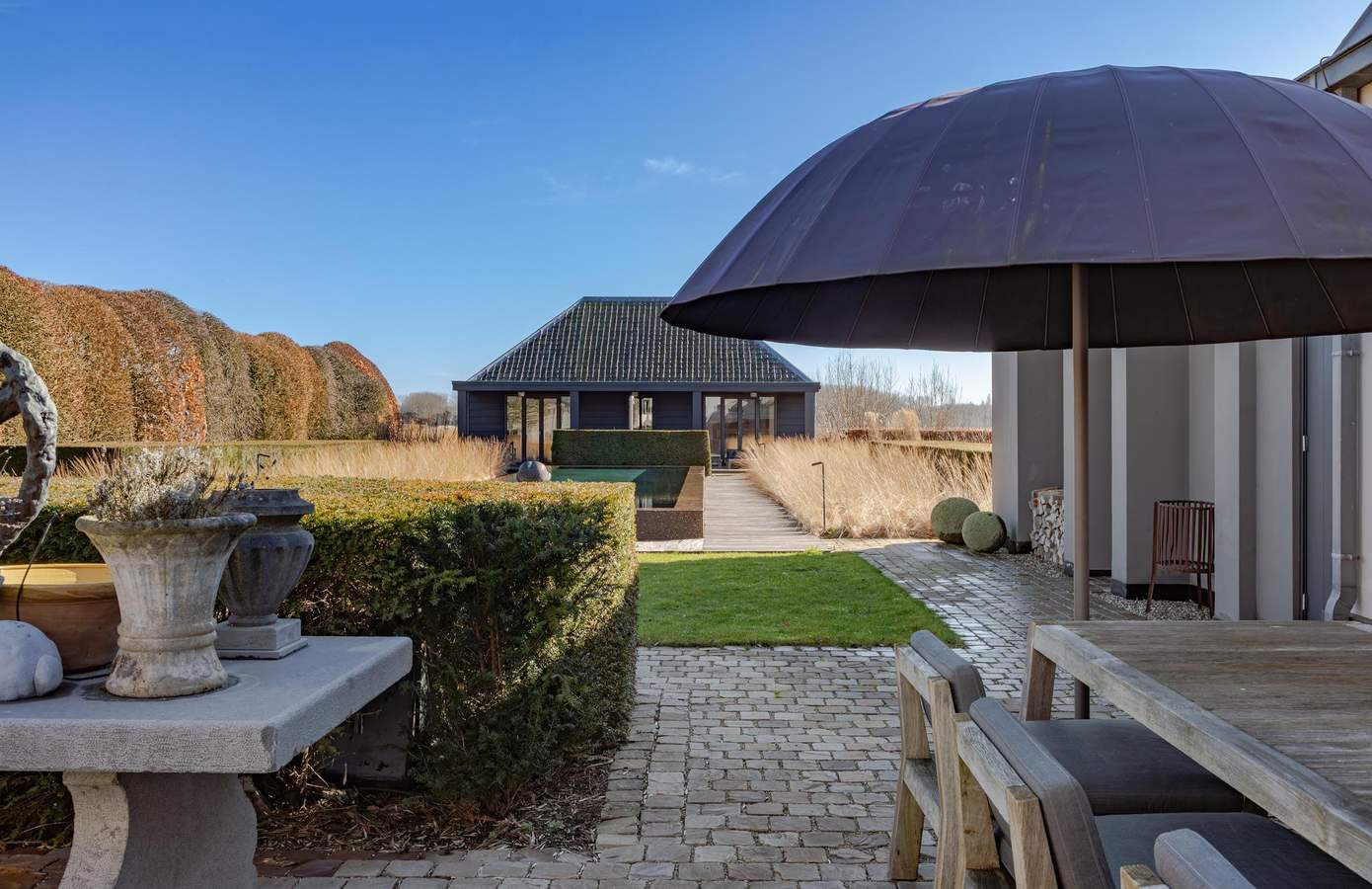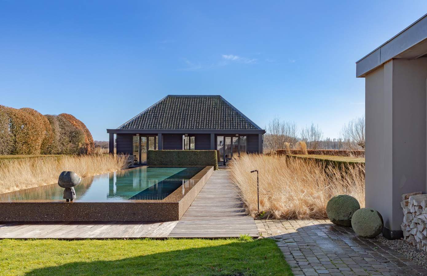 Het bijgebouw ligt zorgvuldig gepositioneerd in de zichtlijnen van het huis en het zwembad, waardoor ook hier het kenmerkende spel van assen en symmetrie terugkomt dat zo bepalend is voor het ontwerp van het landgoed.
