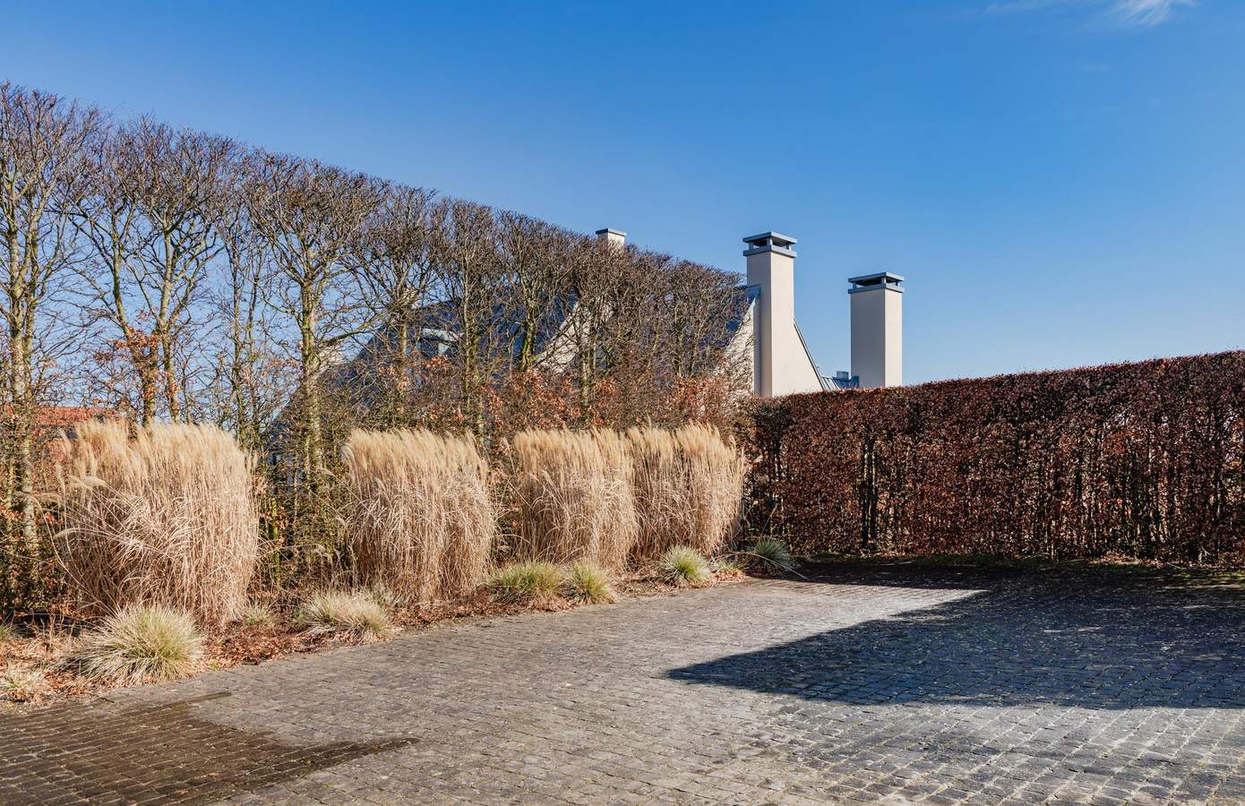 De tuin werd ontworpen door de internationaal vermaarde landschapsarchitect Piet Oudolf, bekend van onder meer de High Line in New York en vele iconische tuinen wereldwijd. Bijzonder detail is dat deze tuin werd ontworpen voor architect Piet Boon zelf. Het ontwerp vormt daardoor een uitzonderlijke dialoog tussen twee ontwerpers die ieder op hun eigen manier bekendstaan om hun gevoel voor balans, rust en verhoudingen. In het tuinontwerp keren dezelfde principes terug als in de architectuur: heldere lijnen, symmetrie en krachtige zichtassen. Vanuit het hart van de woning loopt een duidelijke lijn door de tuin richting het zwembad. Waar zwembaden in veel tuinen worden verborgen, koos Oudolf hier bewust voor het tegenovergestelde: het lange, smalle zwembad vormt juist het centrale element van de compositie. De beplanting bestaat uit een zorgvuldig samengesteld palet van vaste planten en siergrassen, kenmerkend voor de stijl waarmee Oudolf wereldwijd naam maakte. Grote vlakken met onder andere Deschampsia cespitosa zorgen in de zomer voor een lichte, bijna zwevende waas boven de borders. In het najaar veranderen de bloempluimen in goudkleurige structuren die het karakter van de tuin bepalen.