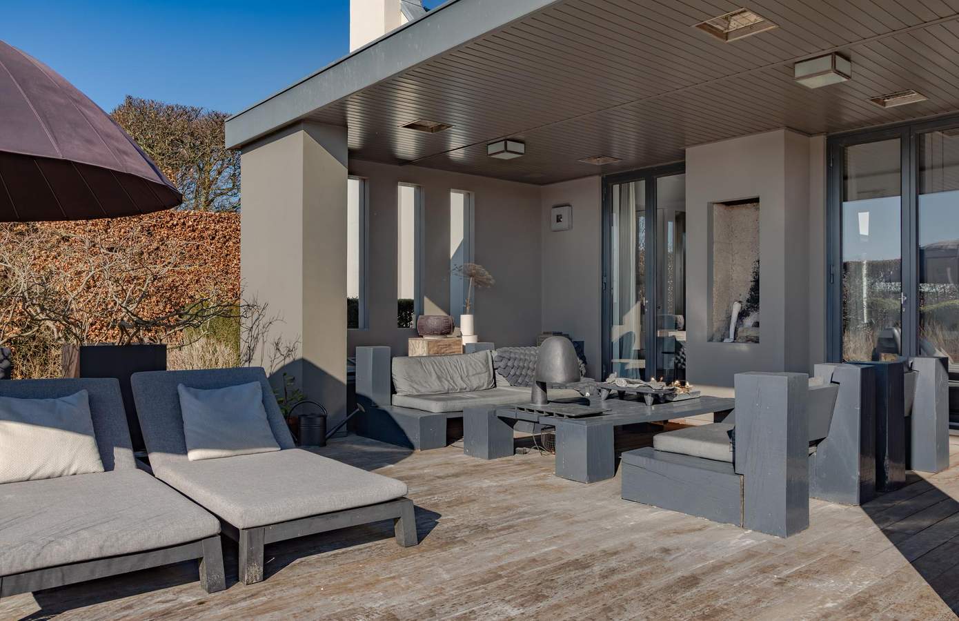 Naast de veranda bij het gastenverblijf is de binnentuin ook heerlijk vertoeven, door de U vorm van de woning, zit u hier heerlijk beschut. Aan de zuidkant van de woning bevind zich het zonneterras, deze is te bereiken vanuit de keuken en hier kunt u het hele jaar door uitstekend zitten. Uit de wind en in de zon. Met als toppunt nog een buitenhaard voor de koelere avonden.