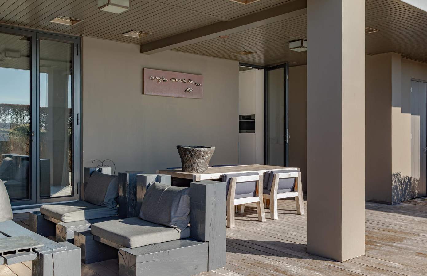De woonkeuken en woonkamer vormen samen het hart van het huis, met openslaande deuren naar de terrassen en het zwembad. De gebruikte materialen zoals hout, natuursteen en warme tinten, versterken het gevoel van harmonie tussen binnen en buiten.